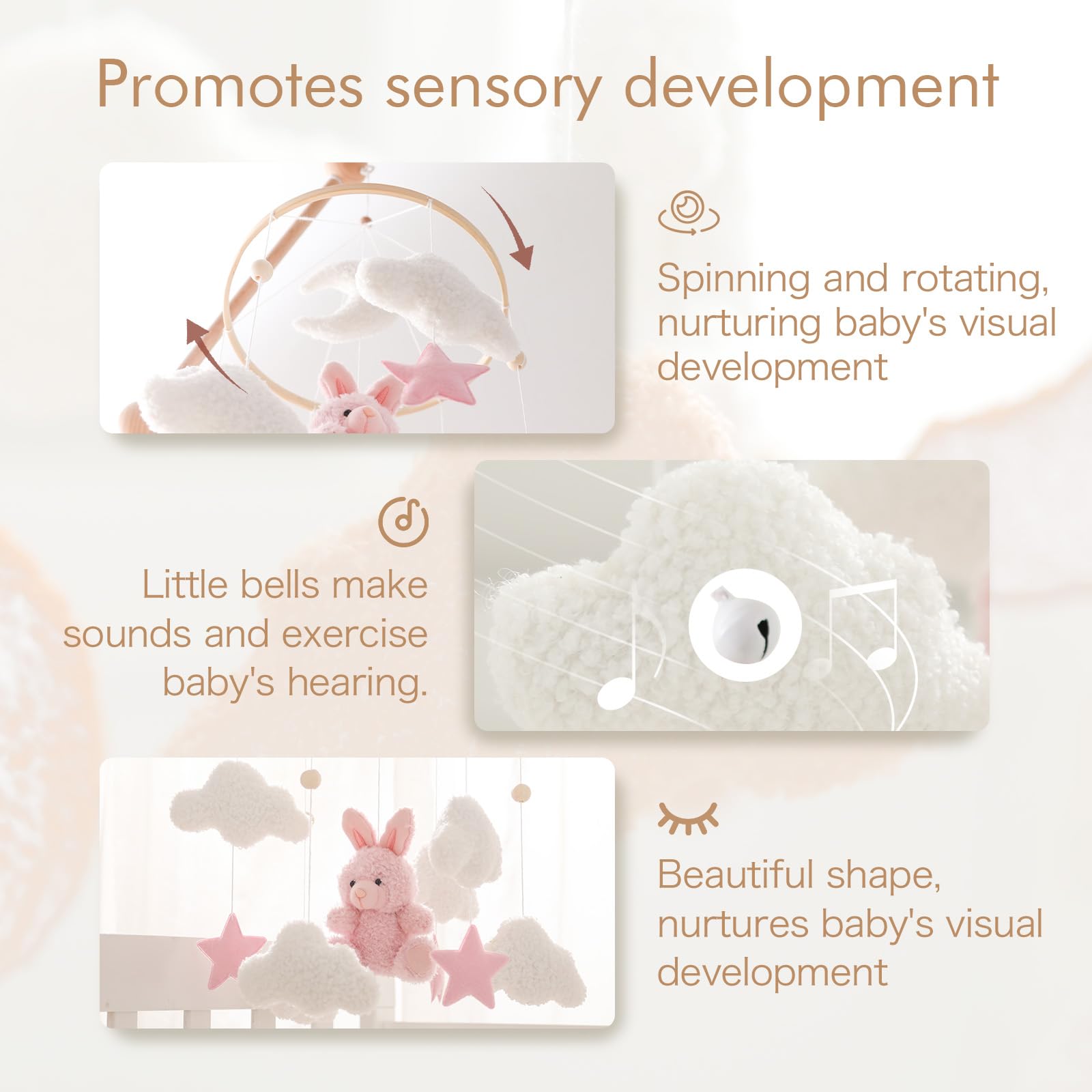 Premium Material & Handmade:This baby mobile is made of soft teddy velvet and natural wood,100% Eco-Friendly. Each piece is attached to a sturdy string and hand-tied, which is safe and durable