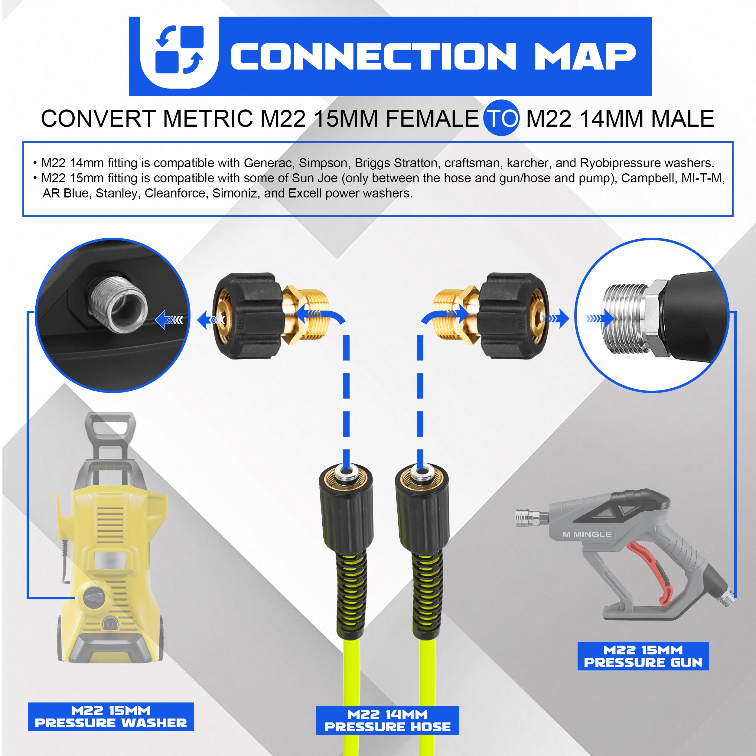 Perfect Compatibility: CONVERT METRIC M22 15MM FEMALE TO M22 14MM MALE. M22 14mm fitting is compatible with Generac, Simpson, Briggs Stratton, Craftsman, Karcher, Ryobi pressure washers. M22 15mm fitting is compatible with Sun Joe, Campbell, MI-T-M, AR Blue, Cleanforce, Simoniz, Excell power washers.