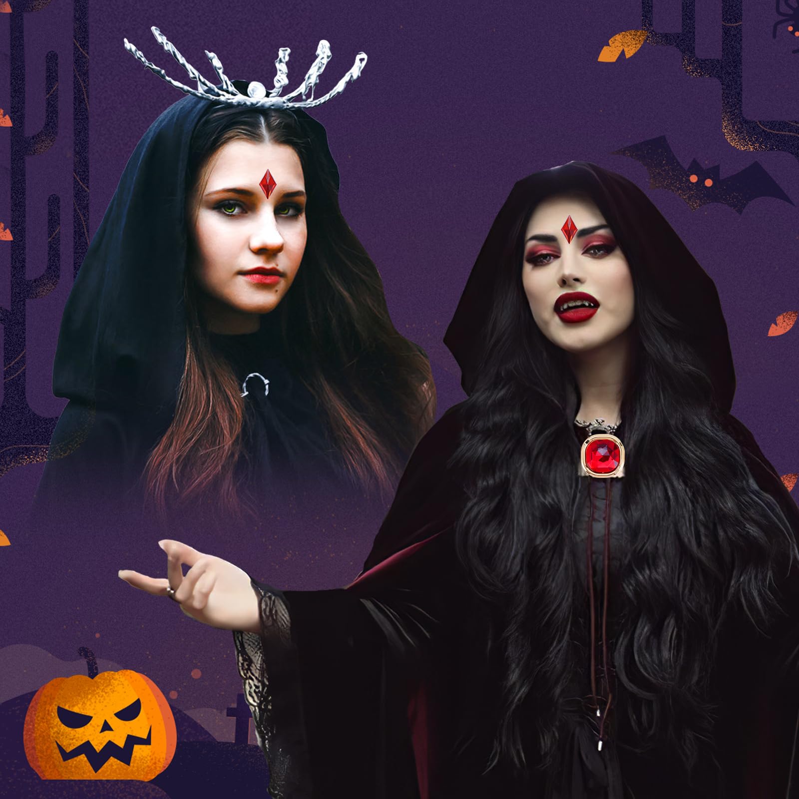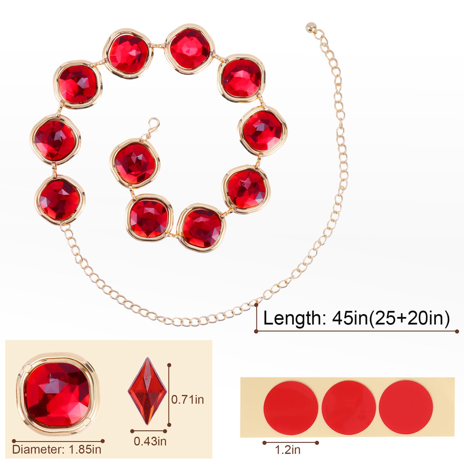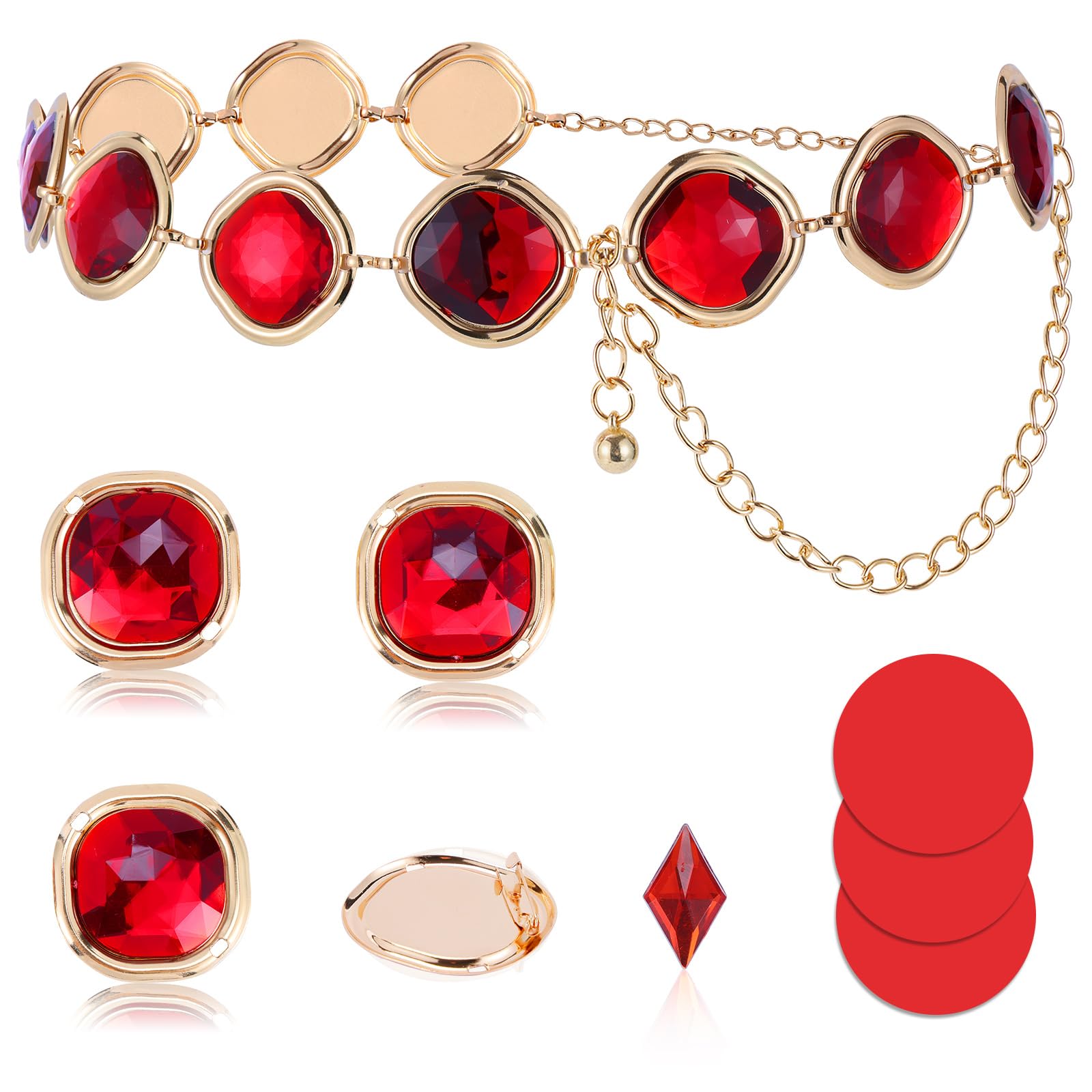 Package Included 9PCS: 1 red gems waist chain, 1 versatile red square rhinestones with practical pin(perfect for cloaks/hats), 3 red square rhinestones paired with 3 adhesive stickers (ideal for clothes/skin), and 1 dazzling diamond rhinestone for the forehead. An ideal raven costume set to fulfill your raven cosplay needs.