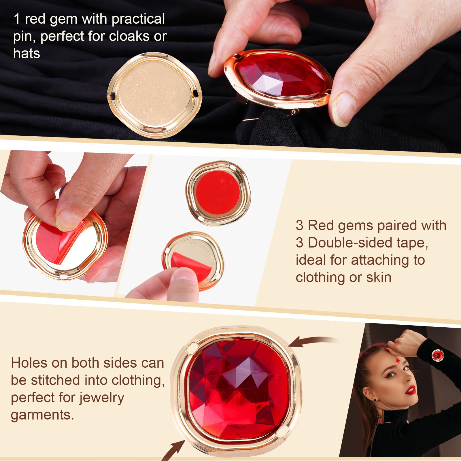 Adaptable Red Gems: Four versatile square red gems that offer transformation options. Secure the red rhinestone using its practical pin on cloaks or hats, or use our double-side stickers for direct application on your wrist, neck, or chest. Alternatively, attach or stitch them onto clothing for stylish jewelry decoration.