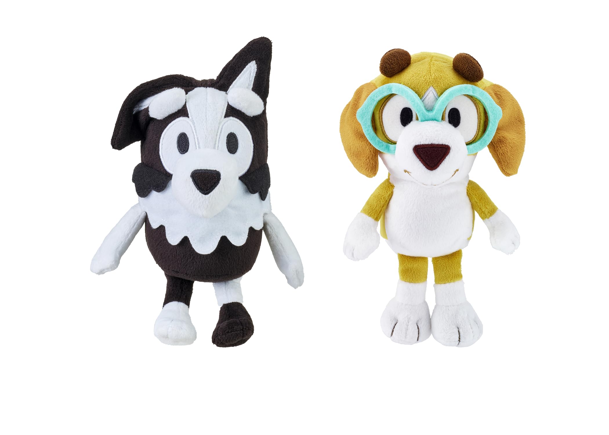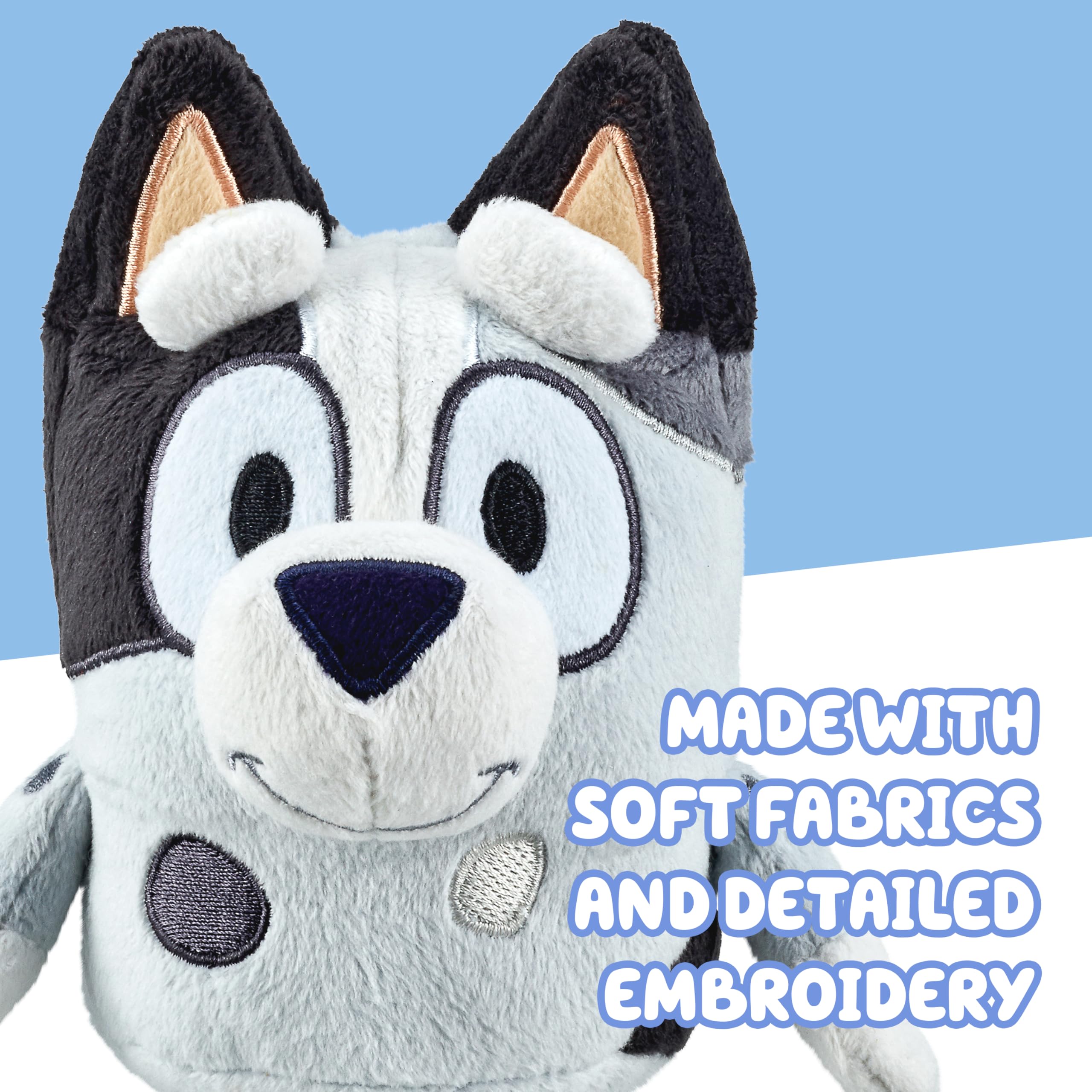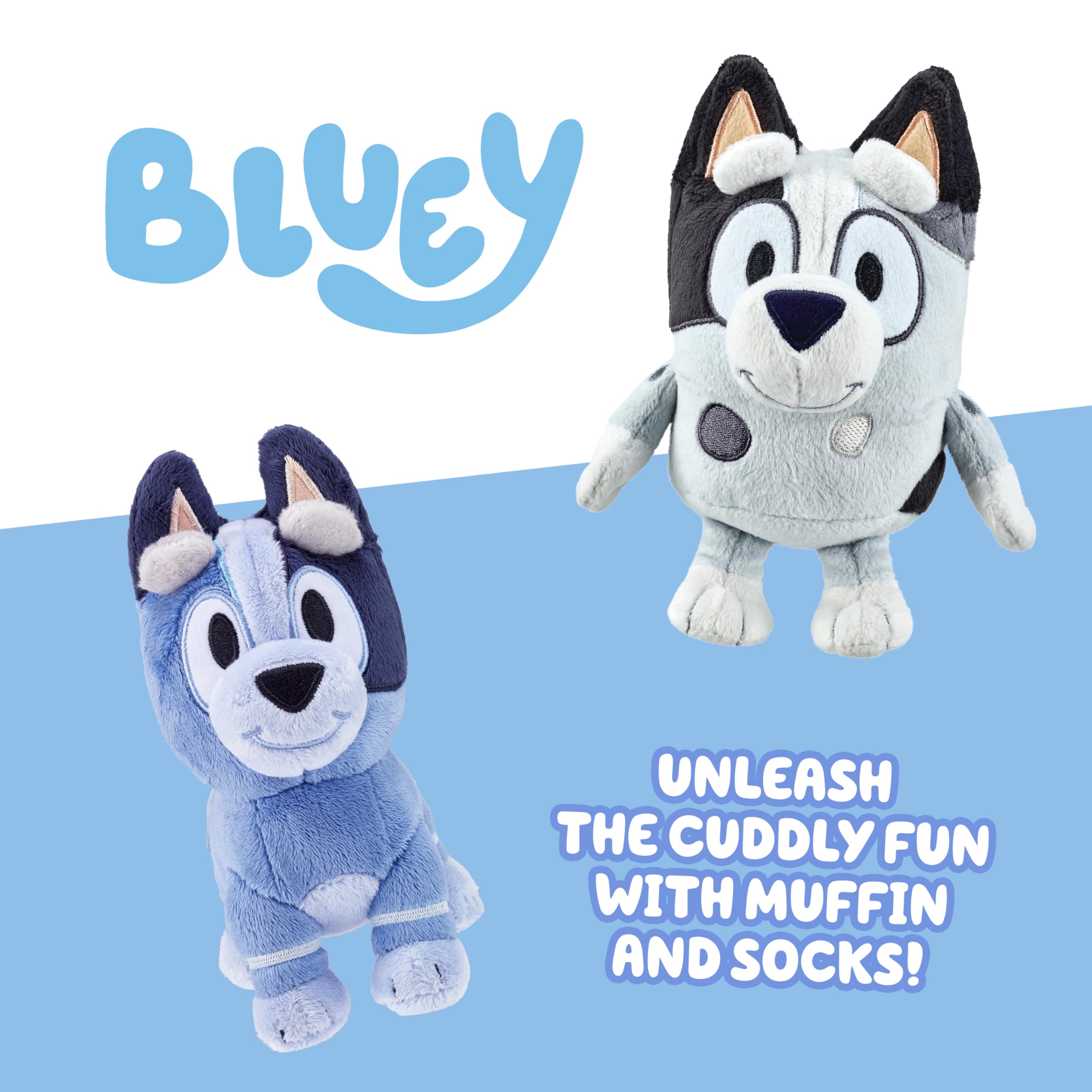 Bluey Muffin Plush and Socks: Bring home the fun, laughter, and charm of Bluey Stuffies with the adorable Muffin and Socks plush set! These lovable cousins are fan favorites from the hit childrenβs series, and now theyβre ready to join your familyβs playtime adventures. Standing at 7" (Muffin) and 7.5" (Socks), these cuddly bluey stuffed animals are the perfect size for kids to carry, hug, and snuggle wherever they go. Each bluey character's plush is crafted with deluxe, ultra-soft fabrics and premium embroidered details that truly bring their personalities to life. Bluey muffin toyβs mischievous charm and Socksβ playful spirit are captured in every stitch, making them irresistible to fans and collectors alike. Whether itβs for showtime snuggles, bedtime stories, or imaginative play, small plushies Muffin and Socks are sure to delight children ages 3 and up. Perfect as a gift for birthdays, holidays, or just because, this duo is a must-have addition to any Bluey collection. Collect Muffin stuffed animal bluey, Socks, and all of Blueyβs friends to recreate your childβs favorite moments from the beloved series or invent brand-new adventures filled with fun and imagination!