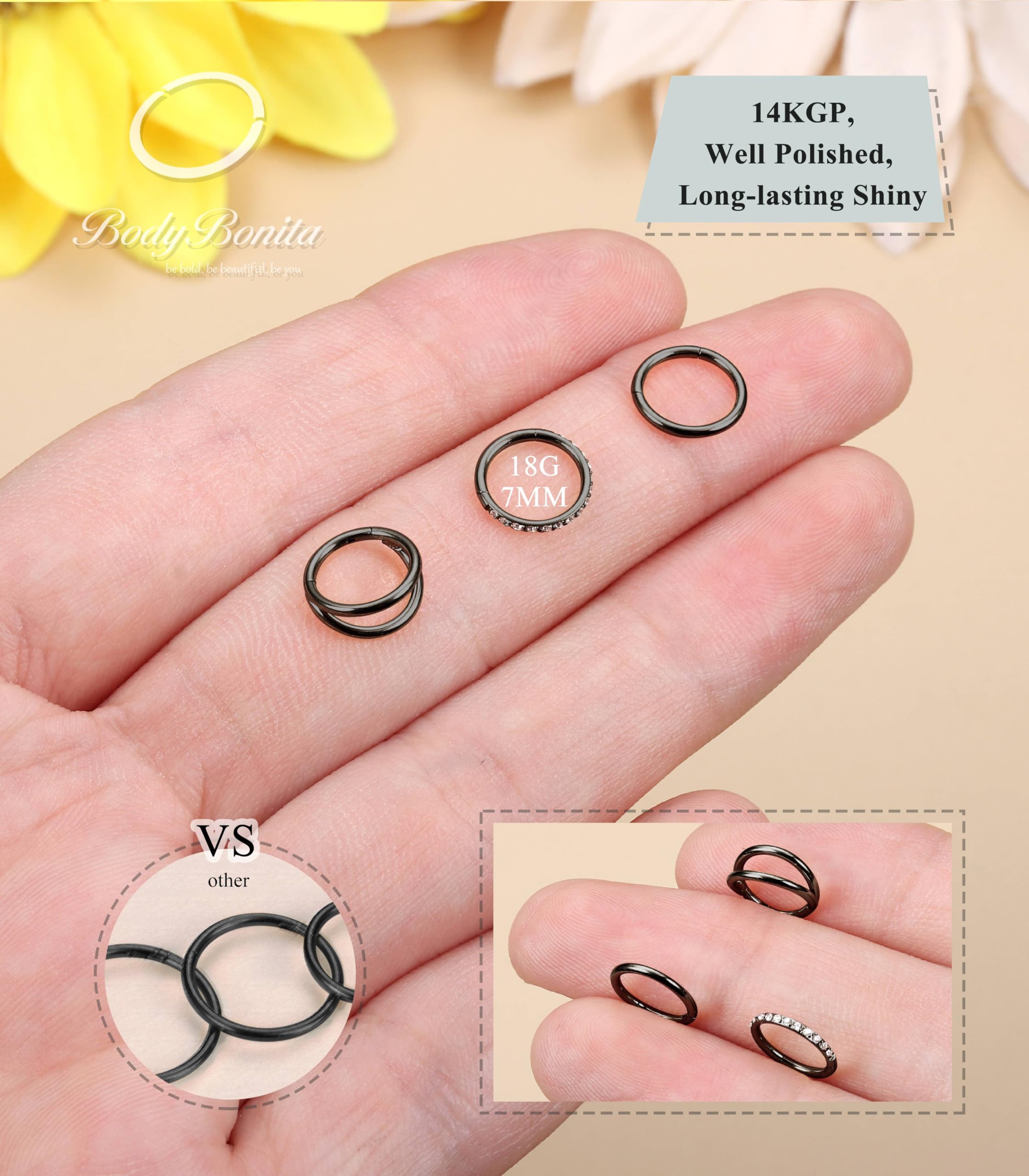 Seamless Black Plated Nose Ring Hoop: Gauge size: 18G(1.0mm); Inner diameter: 7mm(0.27inches); Material: 316L stainless steel; One order includes 3 pieces of hinged segment ring, come in various styles to meet your fashion needs: sparkly CZ nose hoop, double hoop nose ring, dainty single septum hoop;We've provided the size comparison chart for your reference
