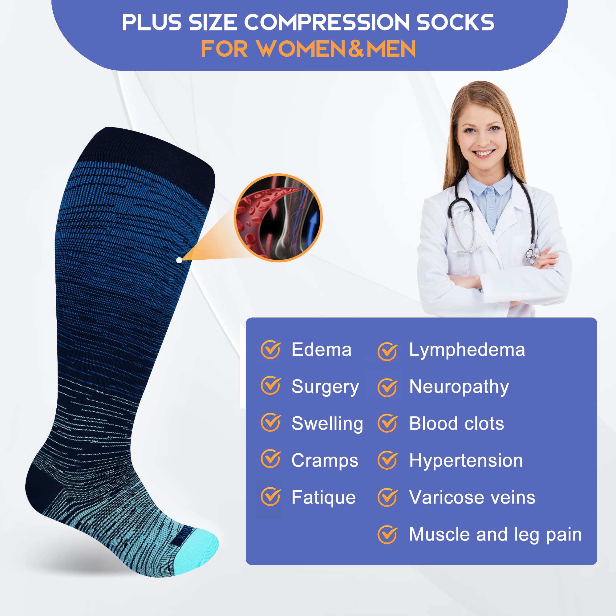 Plus Size Compression Socks Wide Calf: These wide calf compression socks are designed for people with wider calves, providing excellent leg support and long-lasting graduated compression. They are easy to put on and take off and won't roll down or cut into your leg due to their 360° stretchy and wide cuff. They are also durable and comfortable to wear.