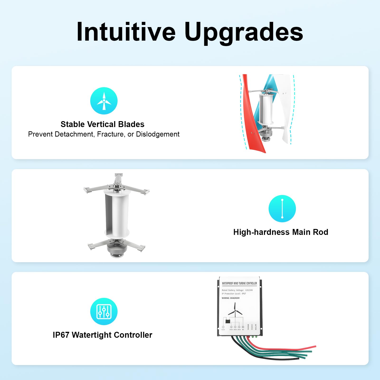 🌀[Built to Last] Featuring a coreless permanent magnet generator and three high-strength fiberglass blades, it boasts superior durability and an extended service life.With aerodynamically engineered spiral blades for smooth and reliable rotor operation, it can deliver stable power generation. Its dual-bearing structure and minimal vibration further ensure consistently smooth operation.