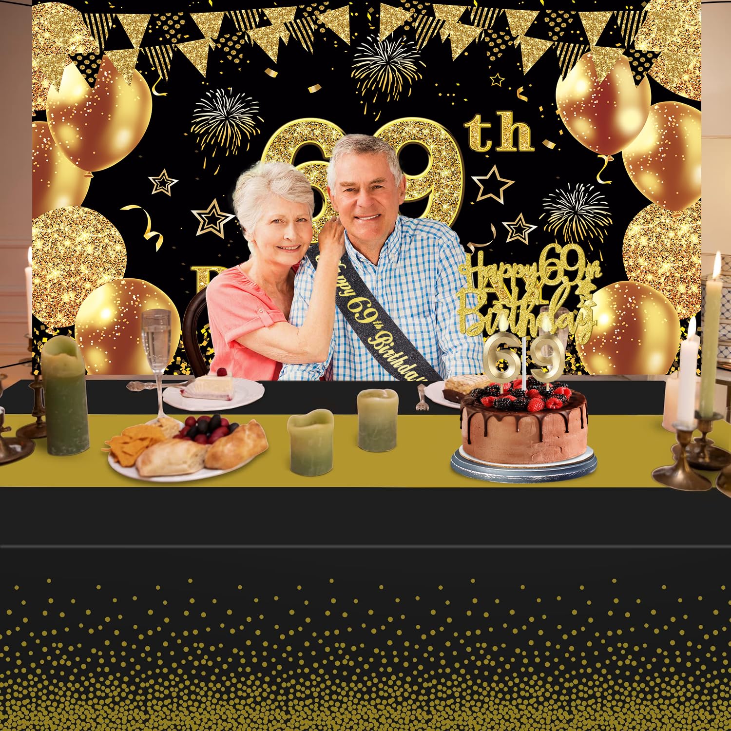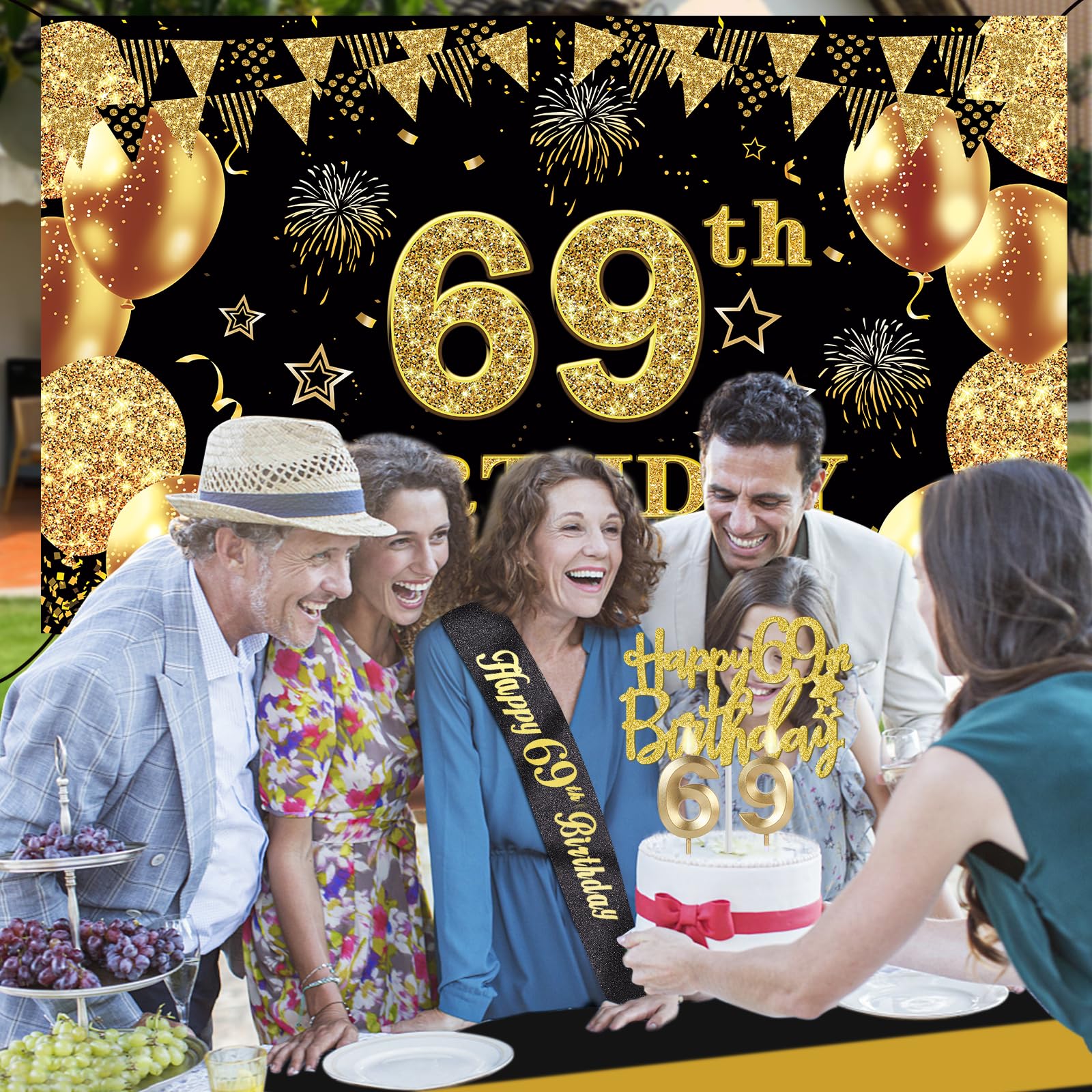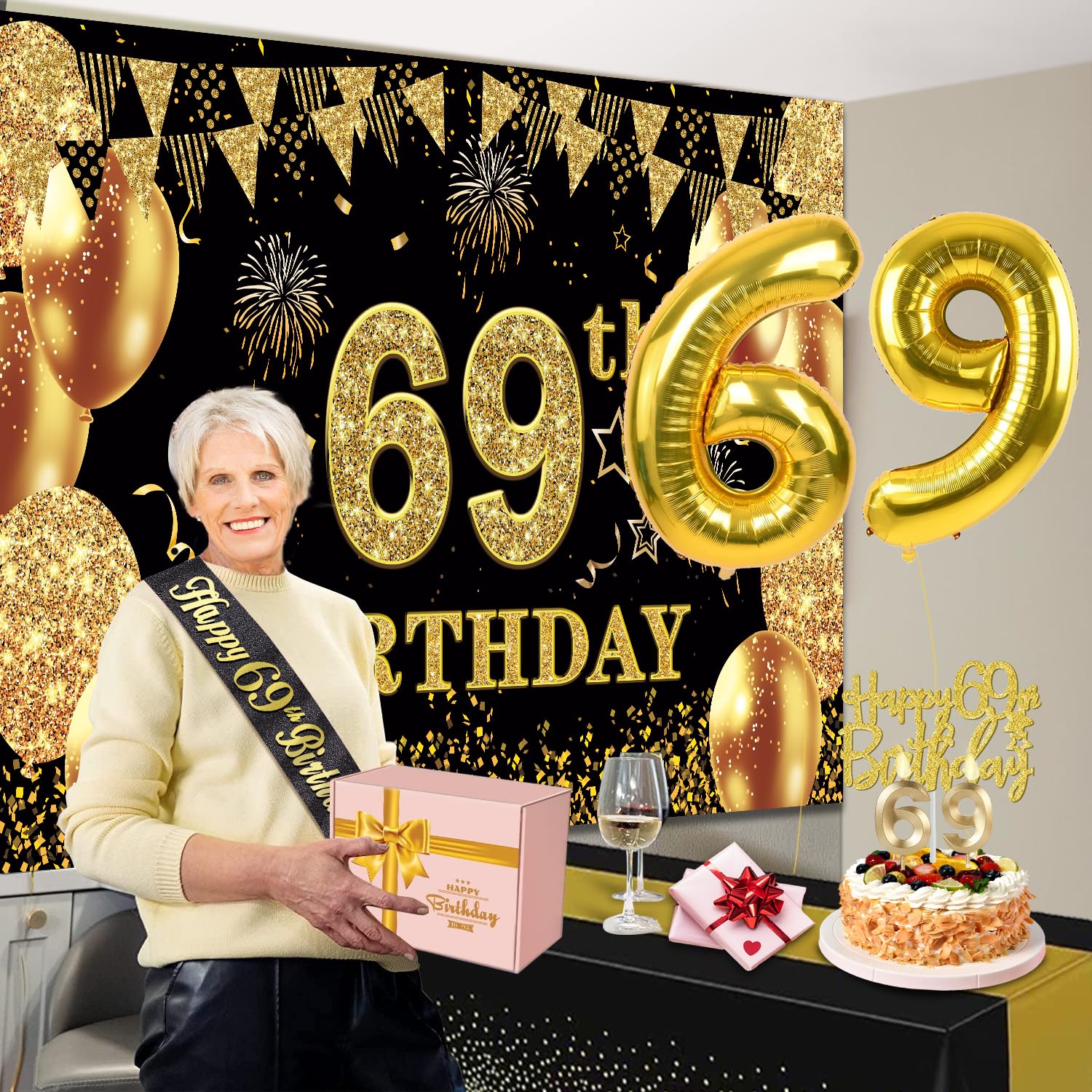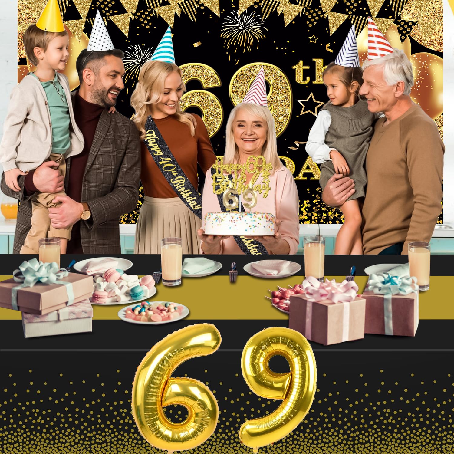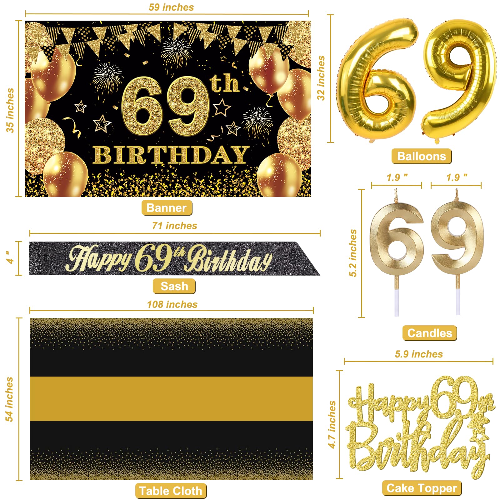 69th Birthday Decorations Kit: Packing coming with Large 69th Birthday Banner x 1pc, Big Gold 69th Birthday Balloons x 1set, Black and Gold Table Cloth x 1pc, Black Glittery with Gold Foil Words Happy 69th Birthday Sash x 1pc, Happy 69th Birthday Cake Topper x 1pc, Gold Number 69 Candles x 1set. This Value Black and Gold Party Decorations Set Meet Your Every Needs and Expects in 69th Birthday Milestone