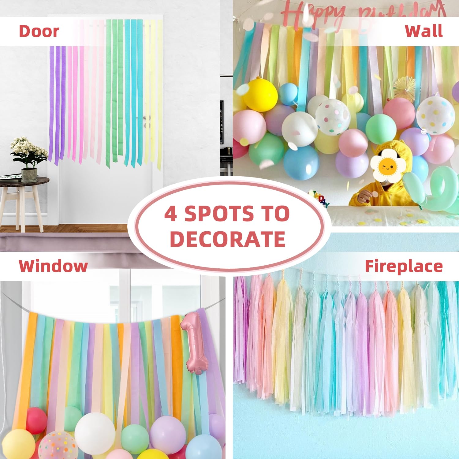【Multiple Usages Rainbow Birthday Decorations】This Pastel Crepe Paper Streamers are an all-purpose decoration for all types of events! They are great for decorating tables, windows, walls, door frames .etc. These Pastel Party Streamers are perfect for birthday, anniversary, graduation, mermaid party, rainbow theme party, butterfly party, Easter, Valentine's Day, Mardi Gras, Mother's Day, Halloween, Thanksgiving Day, New Years eve, Christmas bridal bachelorette baby shower or wedding decorations.