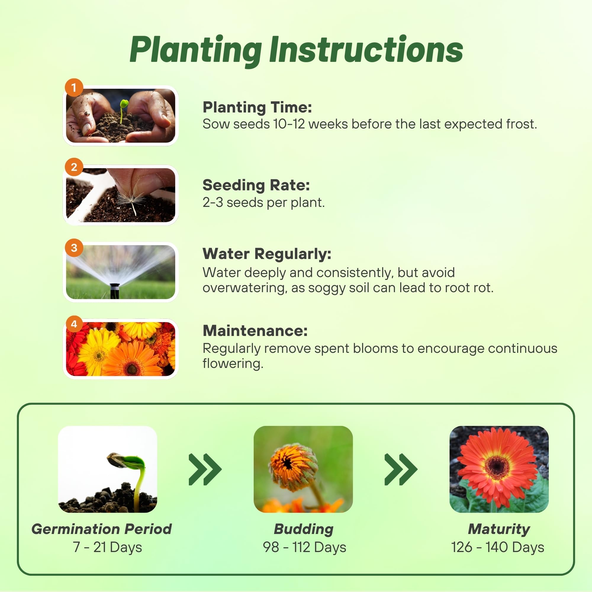 LOW-MAINTENANCE & VERSATILE: Thriving in full sun to partial shade, our hardy plants only require a sow rate of 2-3 seeds per plant in a well-drained soil (pH 6.1-7.5) with 12-14 inch spacing, then cover thinly under 70F degrees while allowing a germination time of 10-21 days for optimal results. Their versatility makes them ideal for landscaping, cutting gardens, pots, and indoor arrangements.