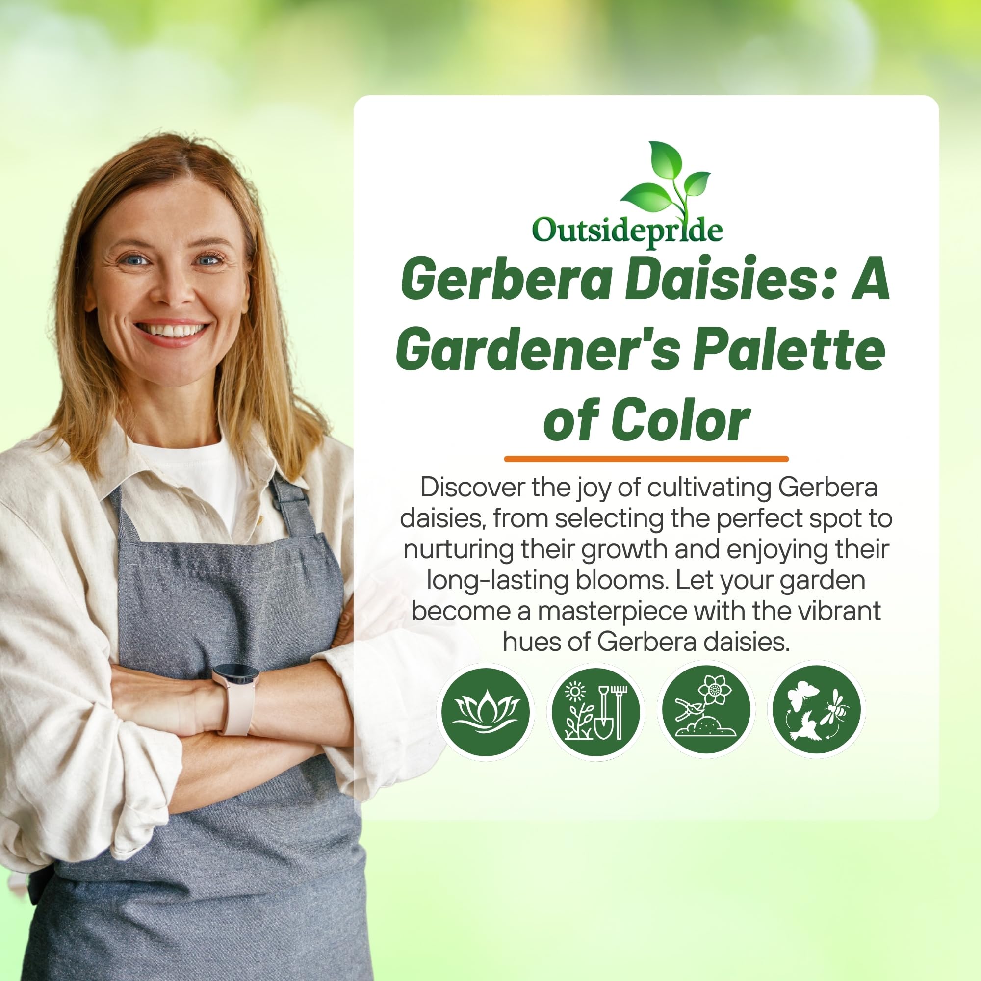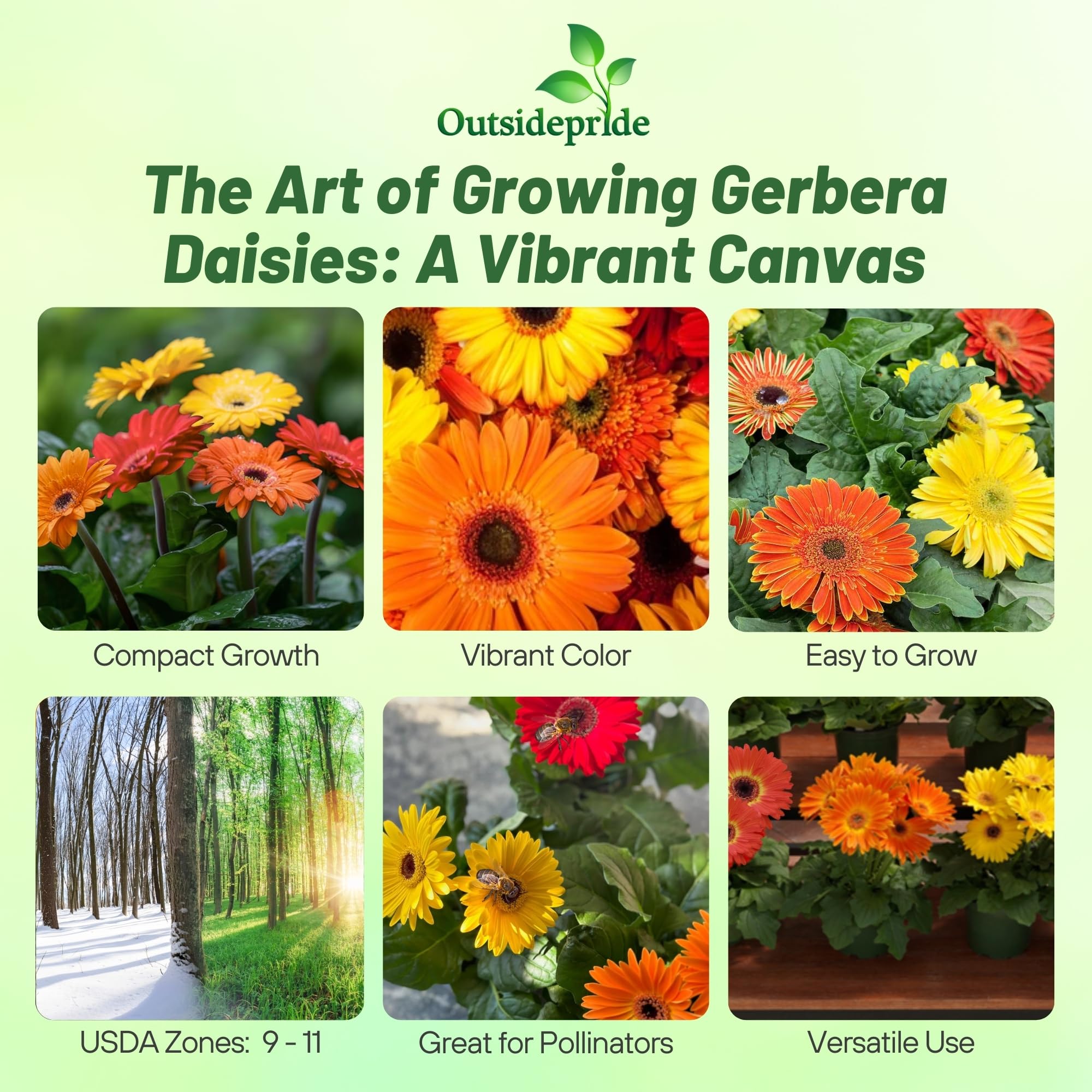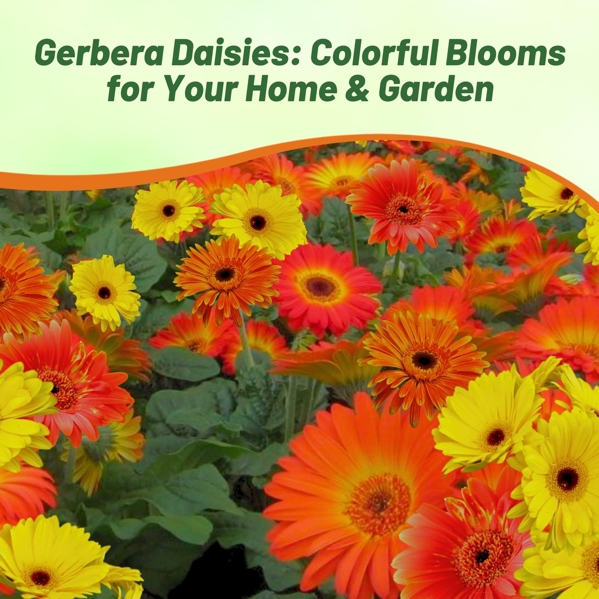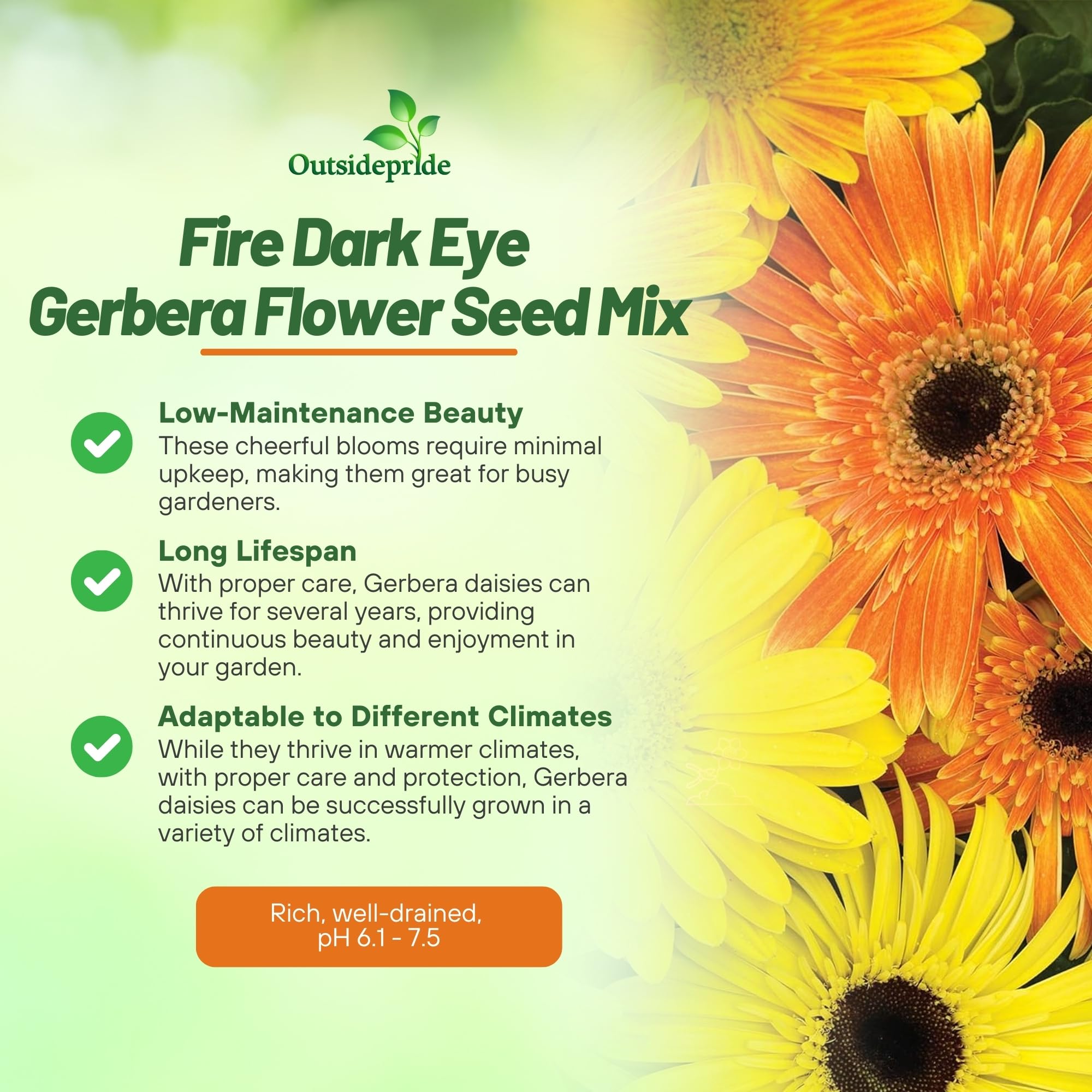VIBRANT MIXED BLOOMS: Brighten your garden with the stunning colors of Fire Dark Eye Mix Gerbera Daisy Seeds in vibrant mixed shades. With deep green foliage, our large dazzling flowers add a pop of charm and elegance, transforming any indoor and outdoor space into a colorful oasis. Perfect for garden beds, pots, or as cut flowers, their bold, eye-catching appeal is sure to impress.