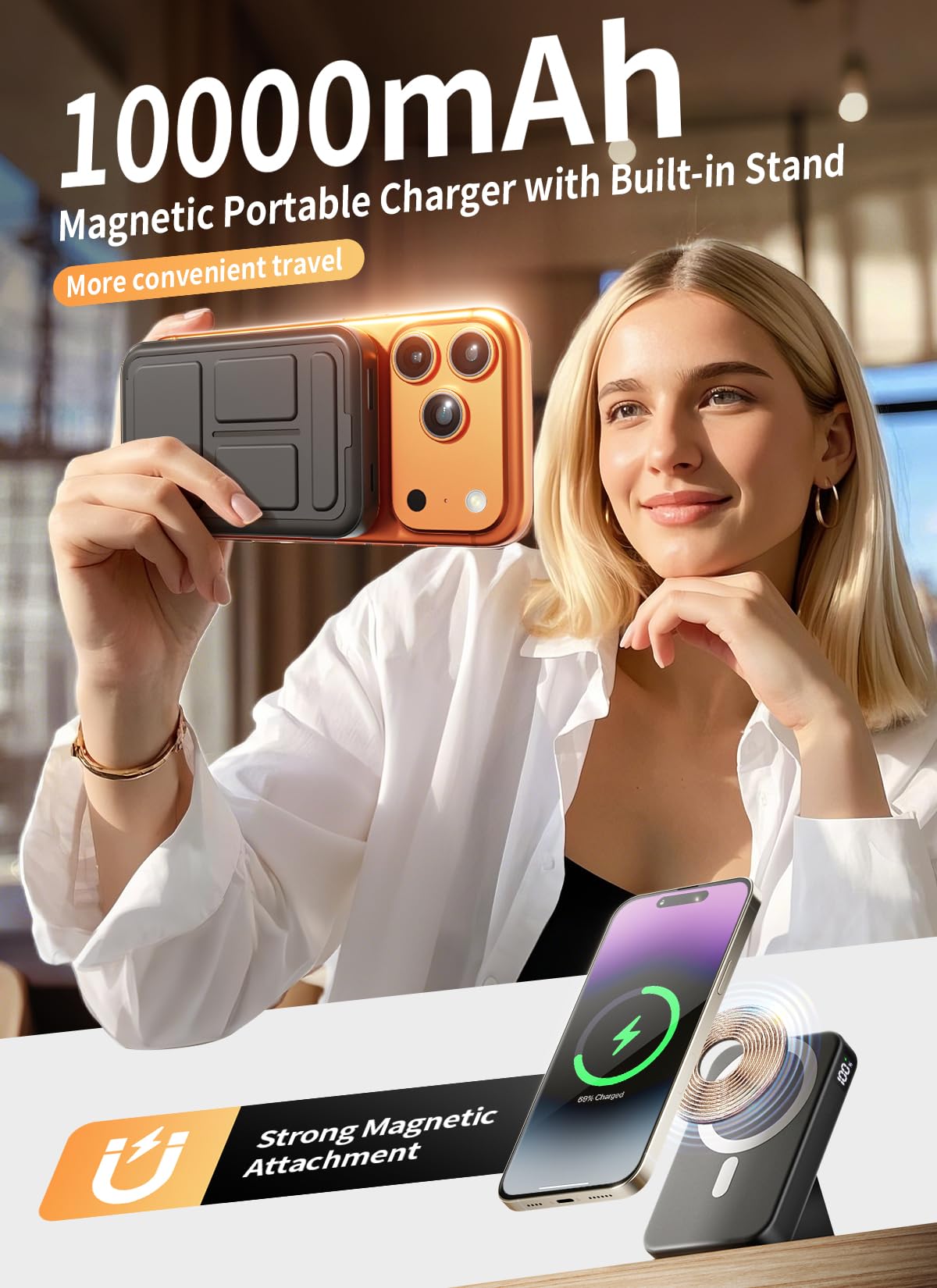 Premium Foldable Stand Design: This Magnetic Power Bank features a sleek leather-textured finish and a built-in foldable kickstand for effortless hands-free use. Enjoy stable magnetic support in portrait or landscape mode—perfect for video calls, streaming, or desk use. A refined combination of premium style and practical function, designed to elevate your charging experience.