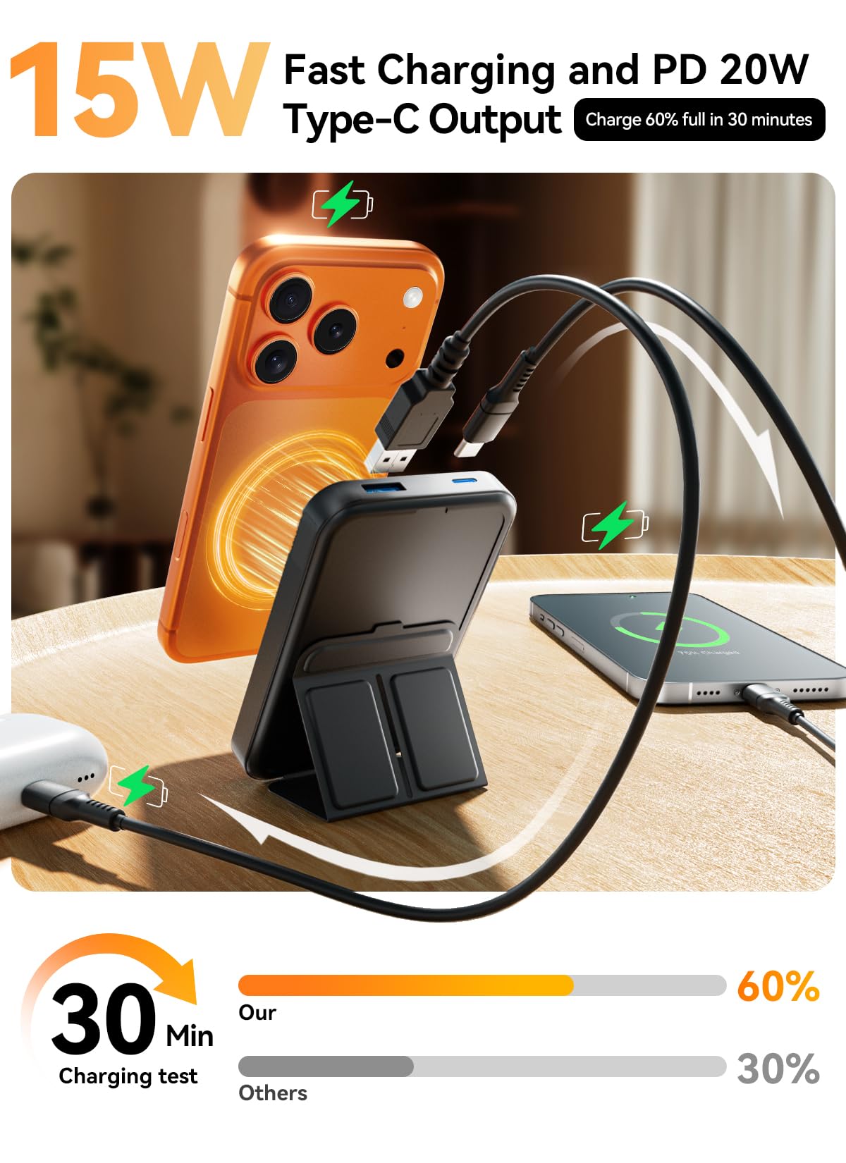 Super Fast Charging with No Long Waits: Supports fast charging up to 15W wireless fast charging and PD 20W Type-C output. Powerful fast-charging capability allows your device to charge up to 60% in just 30 minutes. The exclusive feature of charging 3 devices simultaneously reduces your charging time and provides you with high office productivity.