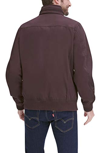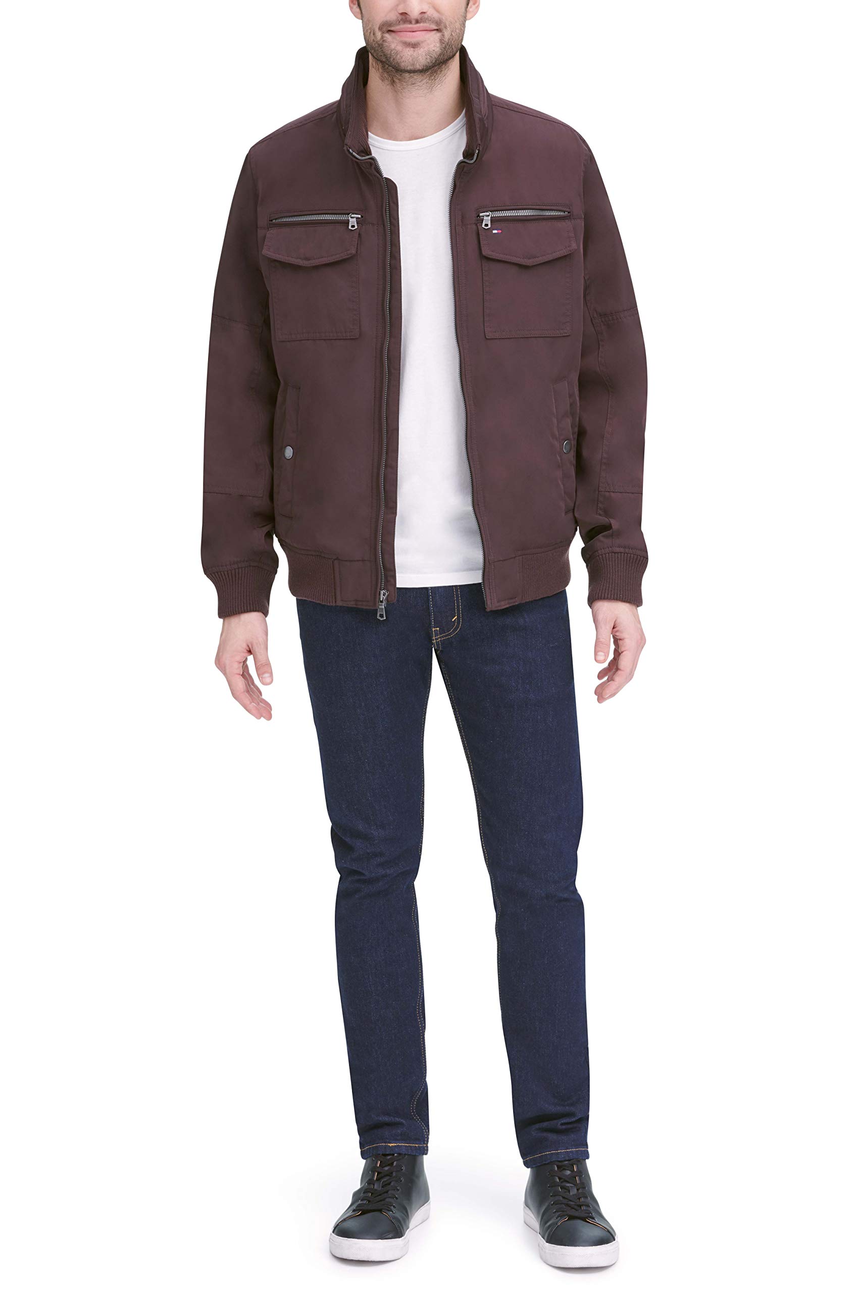 Description Poly twill four pocket performance mid-weight rib knit zip front bomber jacket with utility collar and hidden hood. Contrast quilted lining with light poly fill insulation.