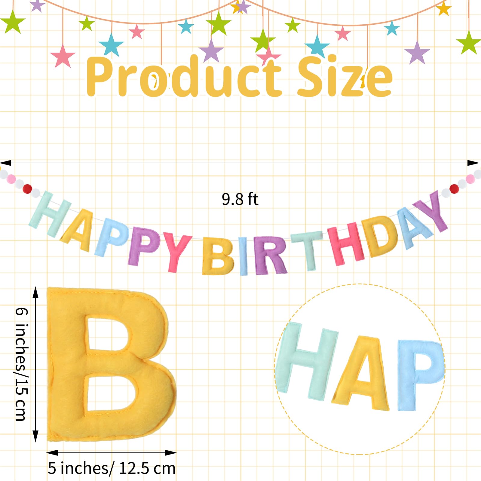 Ideal Size: each letter of our happy birthday banner measures about 6 x 5 inches/ 15 x 12.5 cm, an ideal dimension to catch your guests' eyes while adding surprise to your party; Additionally, the hanging rope is about 0.2 inch wide and 9.8 ft long, giving you flexibility to set up according to your party space;