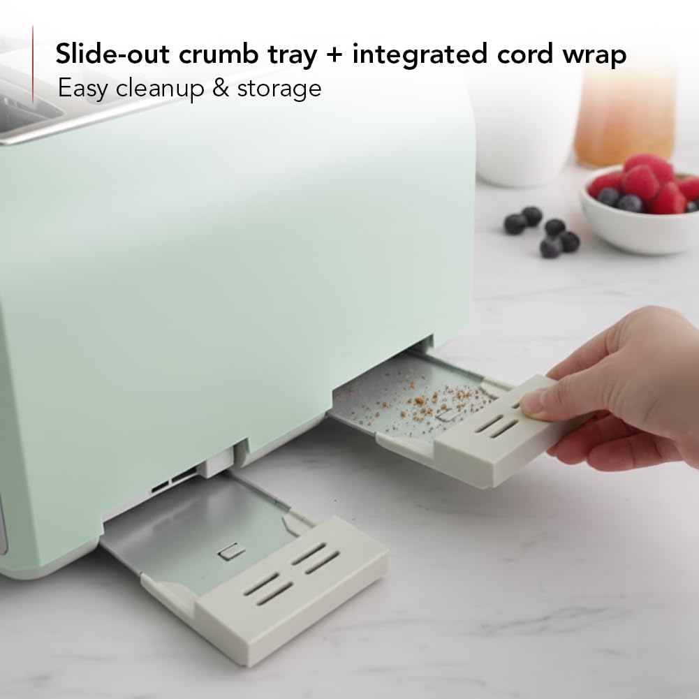MESS-FREE COUNTERTOPS – The removable crumb tray makes it easy to clean and discard crumbs, keeping your countertop tidy. Additionally, the integrated cord wrap underneath the toaster helps manage unsightly power cords when not in use, ensuring a neat, organized space.