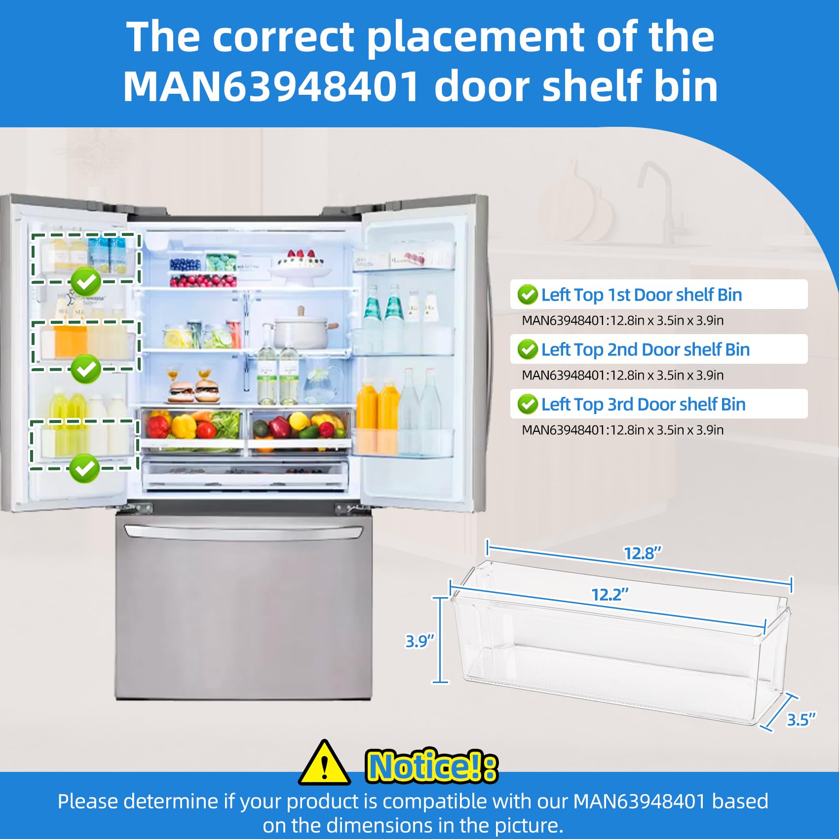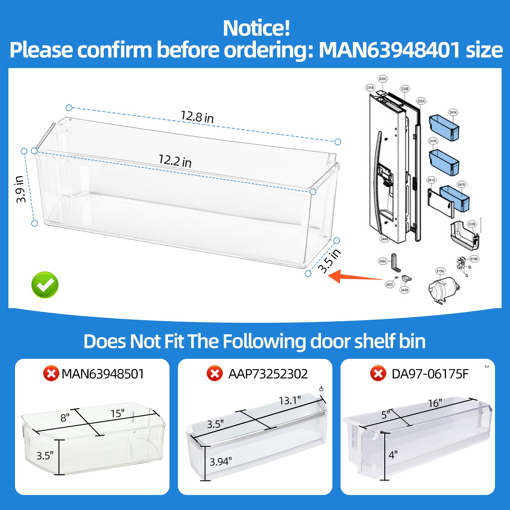 [Only Fit LEFT 3 Shelves Slots] Only fits the left door 3 door bins of the refrigerator, not compatible with door bin shelves in other positions. MAN63948401 fridge door bin is similar in appearance to refrigerator door shelves MAN63948501, AAP73252302, and DA97-06175F, but different in size. Before purchasing, please verify the compatibility of the MAN63948401 refrigerator door shelf replacement with your fridge according to the dimensions in figure 3