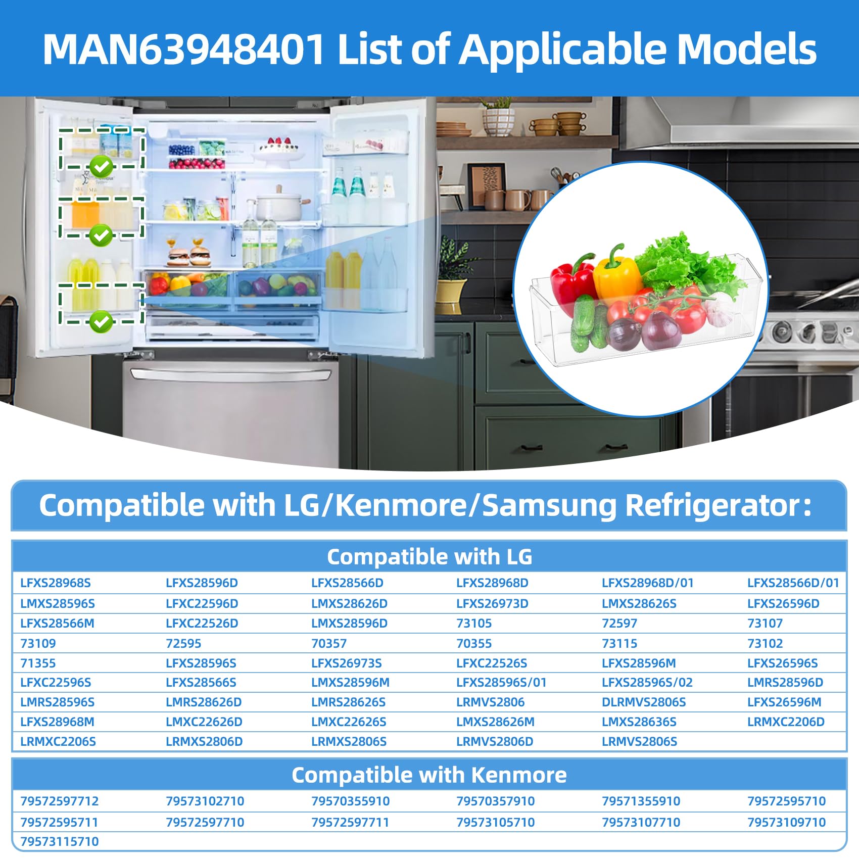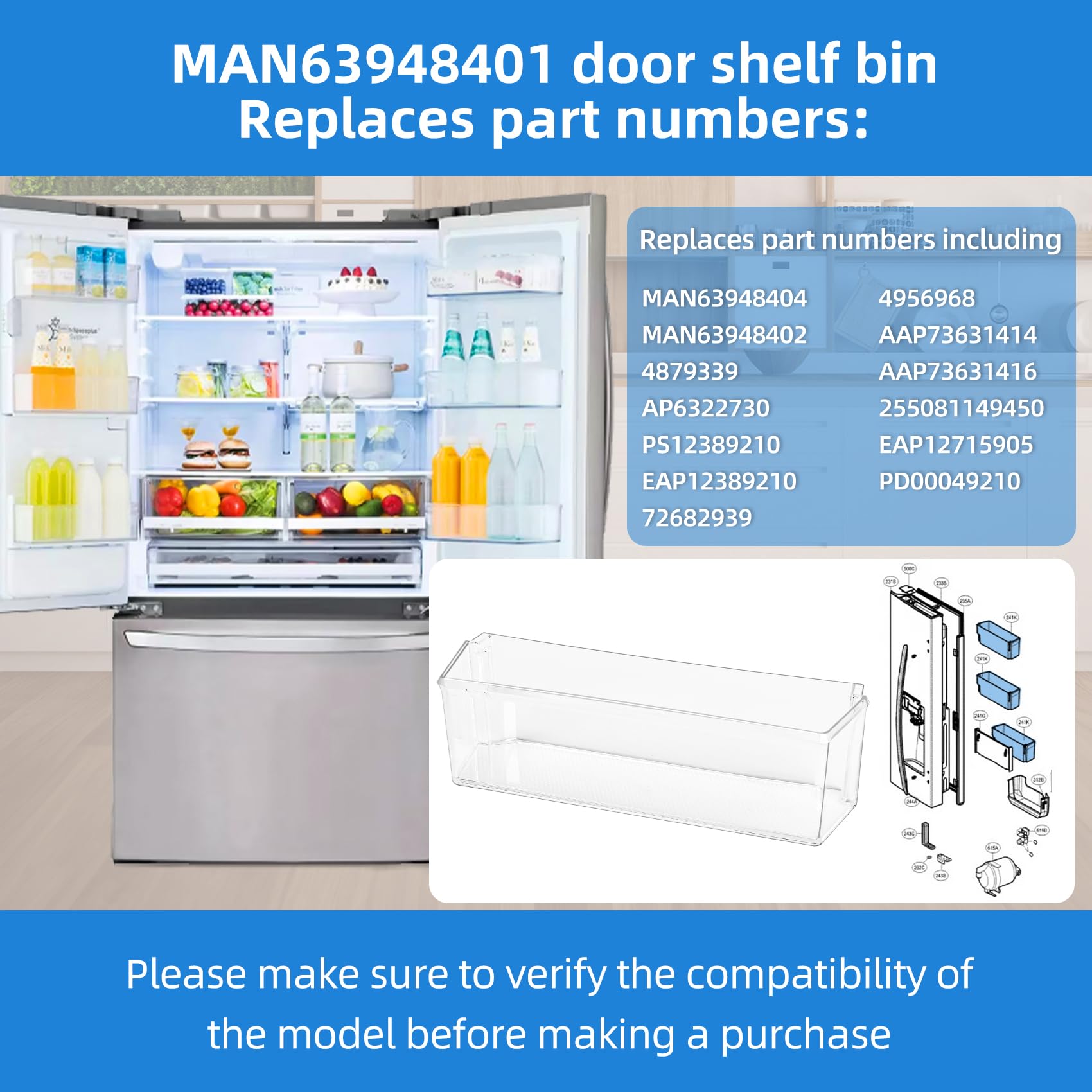[How to Confirm the Correct Model] First find the label on your refrigerator and confirm the model number of your refrigerator. Then please measure your fridge door shelf bin. Please make sure MAN63948401 fridge door basket matches your refrigerator before ordering. If you don't know your fridge door bin of part number, please let us know your model, and we will check it for you. We are happy to help you