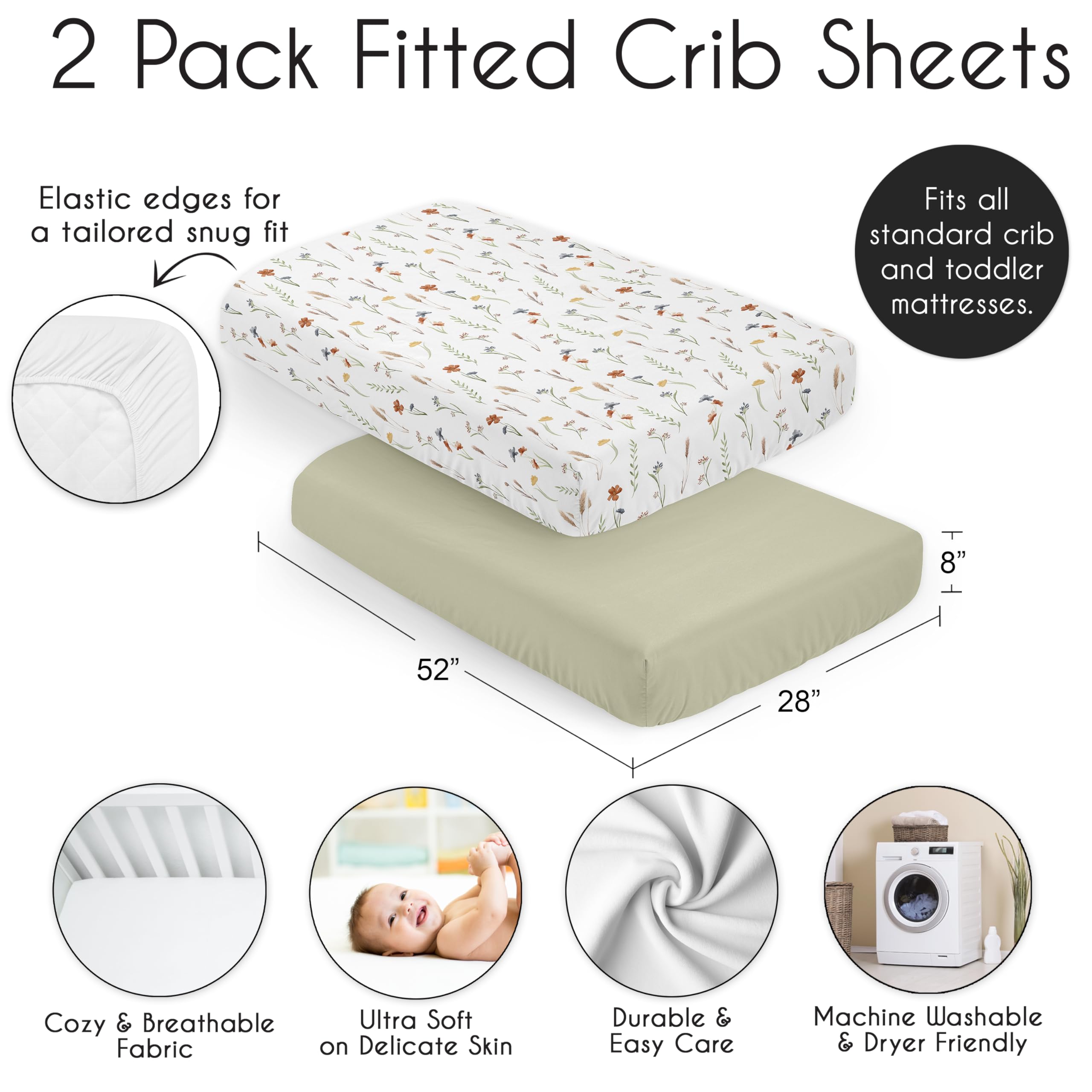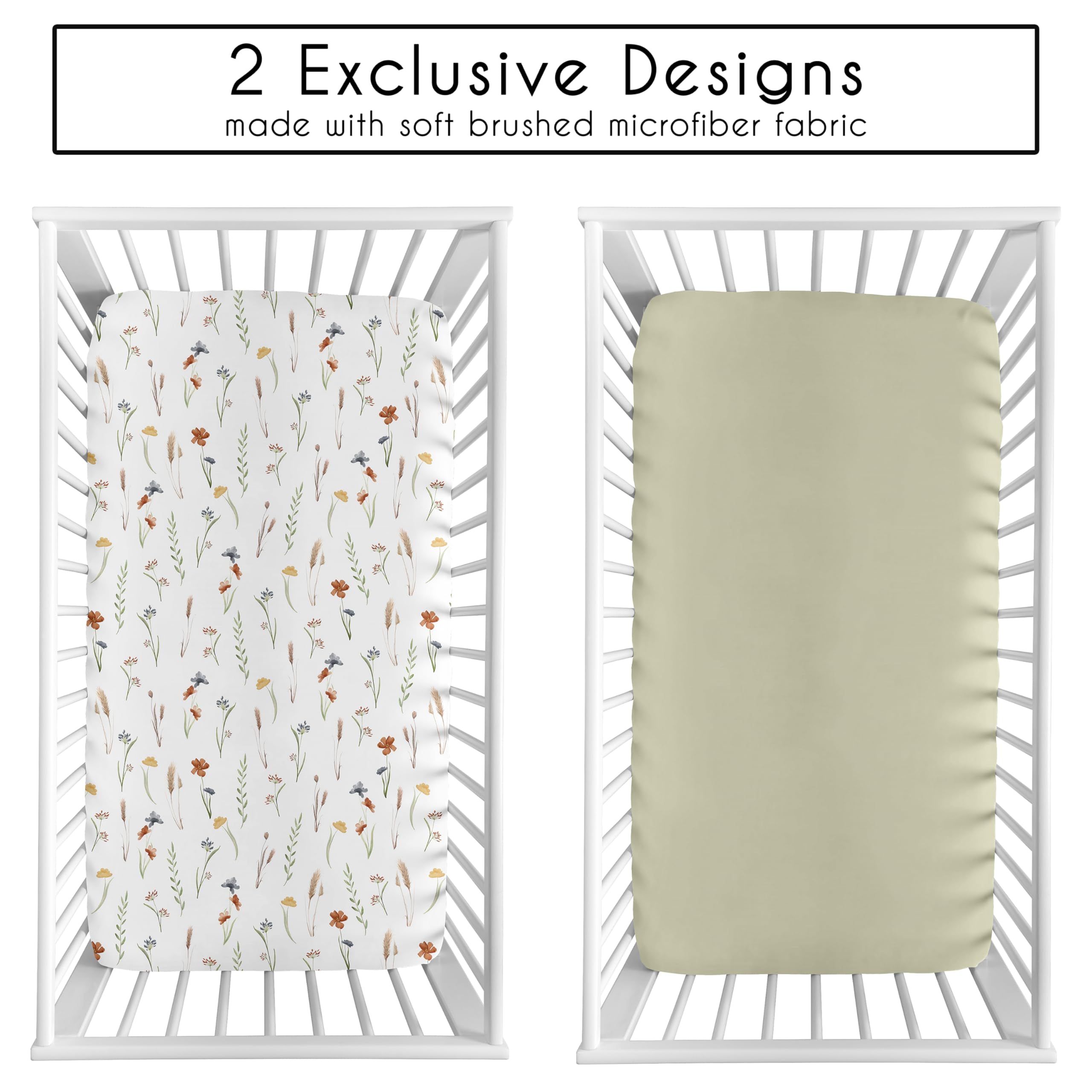 SNUG FIT: Includes: (2) Baby Crib Sheets: 52in. x 28in. x 8in. Our newborn standard crib sheets fit snugly, with premium elastic sewn around the entire bottom edge for a secure fit on most standard sized cribs and toddler beds, to reduce shifting and bunching. This microfiber cribsheets set features an exclusive design of a solid green paired with sage taupe blue and rust boho floral garden watercolor flower wildflower print and is gentle on delicate skin to foster a soothing sleep environment.