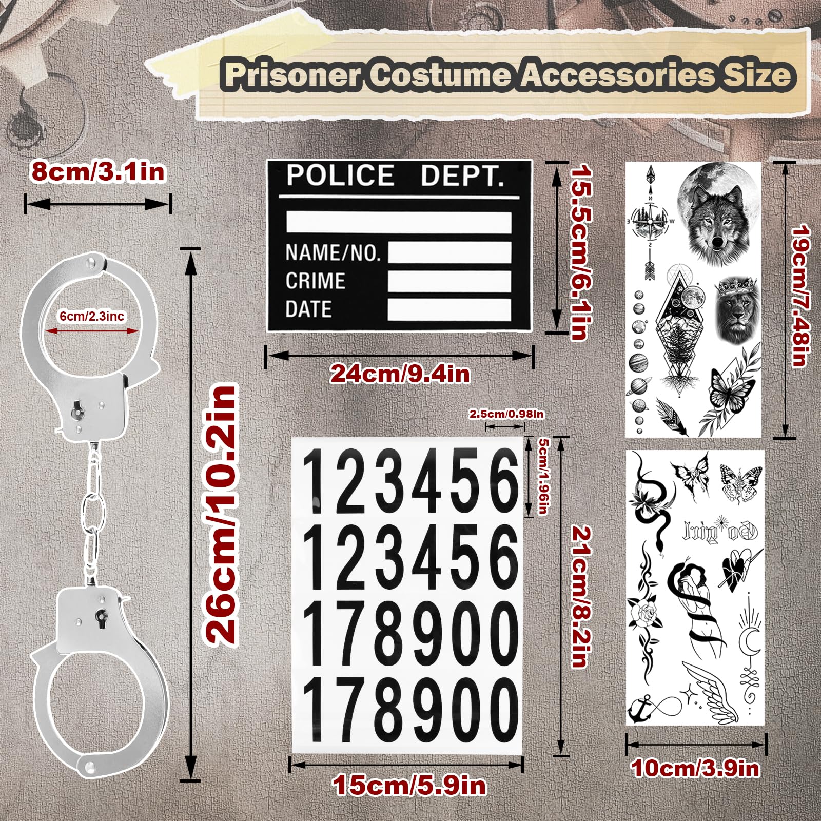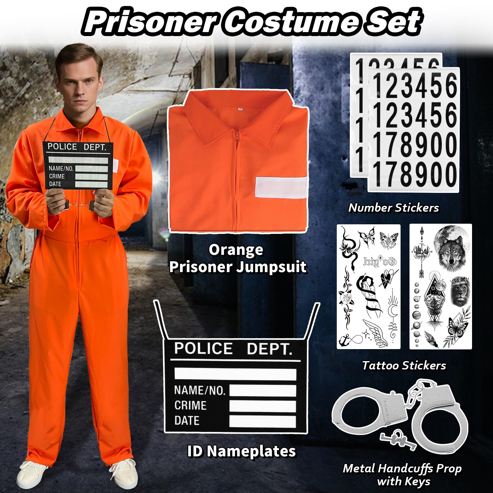 【Prisoner Costume Set Include】1* Orange Prisoner Jumpsuit, 1* Metal Handcuffs Prop with Keys, 1* Nameplates, 2* number stickers, 2 * tattoo stickers. Perfectly recreate the prison style of prisoners.