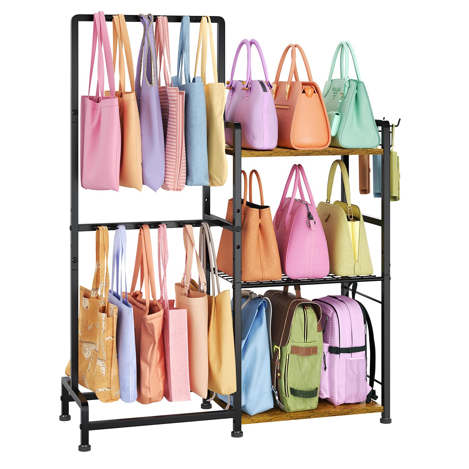 4-Tier Purse Organizer with Side Hooks and Baskets : Keep your growing handbag collection organized and easily accessible with this spacious 4-tier purse rack. Designed to fit everything from oversized totes to compact clutches, itβs perfect for closets, bedrooms, and entryways.