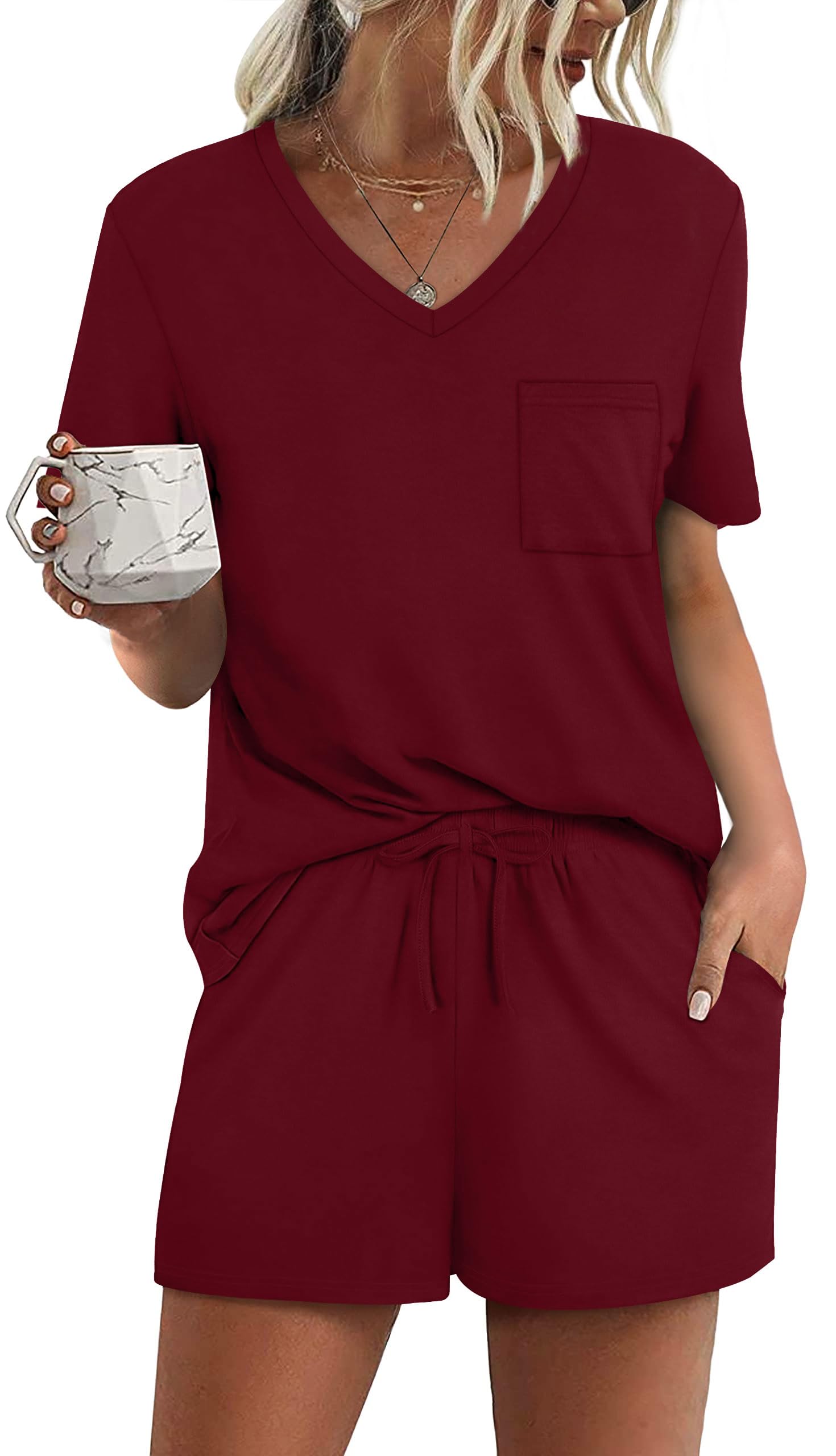 FEATURE --- The package including 1 x short sleeve t-shirt and 1 x short. The top has classic v neckline and a pocket. The short has elastic drawstring and side pockets. The cute top is perfectly complemented by shorts. Casual and sexy in daily life.