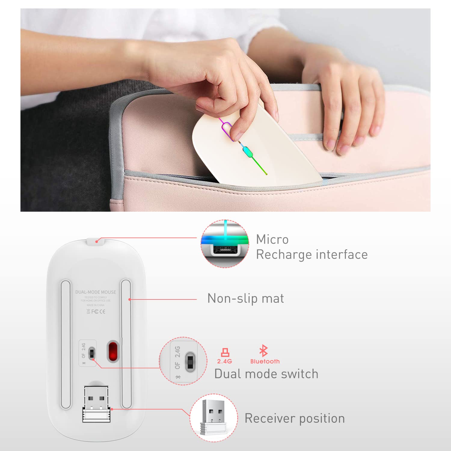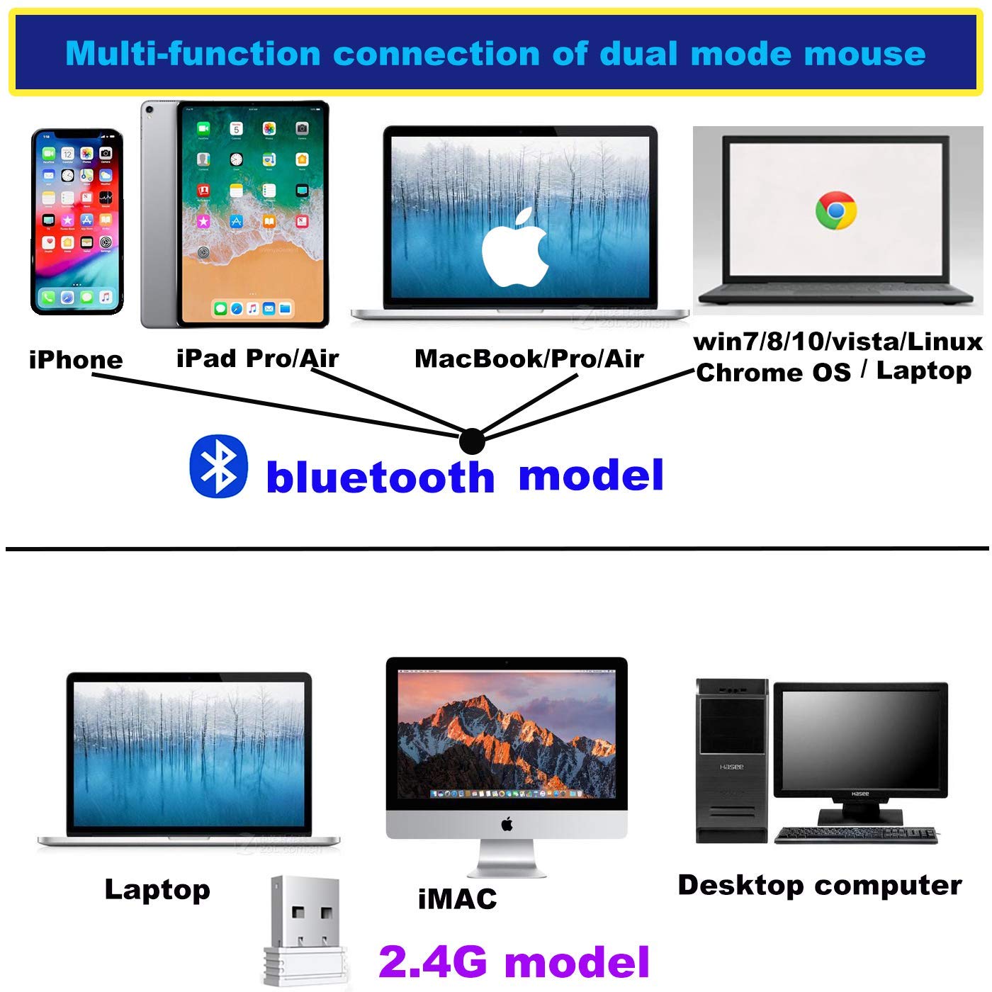 【 BLUETOOTH 5.2 + 3.0 +2.4G USB Receiver +USB C adapter Wireless Bluetooth Dual-Mode Mouse】You can switch between Bluetooth mode or 2.4G mode,Compatible systems are: iPadOS、 macOS、apple / Windows 、win7/8/10/11, UNIX, Linux, Chrome OS. ❮Bluetooth mode is available for all Bluetooth-enabled laptops, MacBook pro macbook air macbook Mac iMac (ipad pro ipad air ipad mini ipad10th iPad9th, iPhone, iMac, tablet, all-in-one computer, etc. ❯ The 2.4G USB receiver mode is suitable for all laptops, desktops, all-in-ones, Dell, HP, Mac, iMAC, etc. with USB/USB C ports.plug and play.