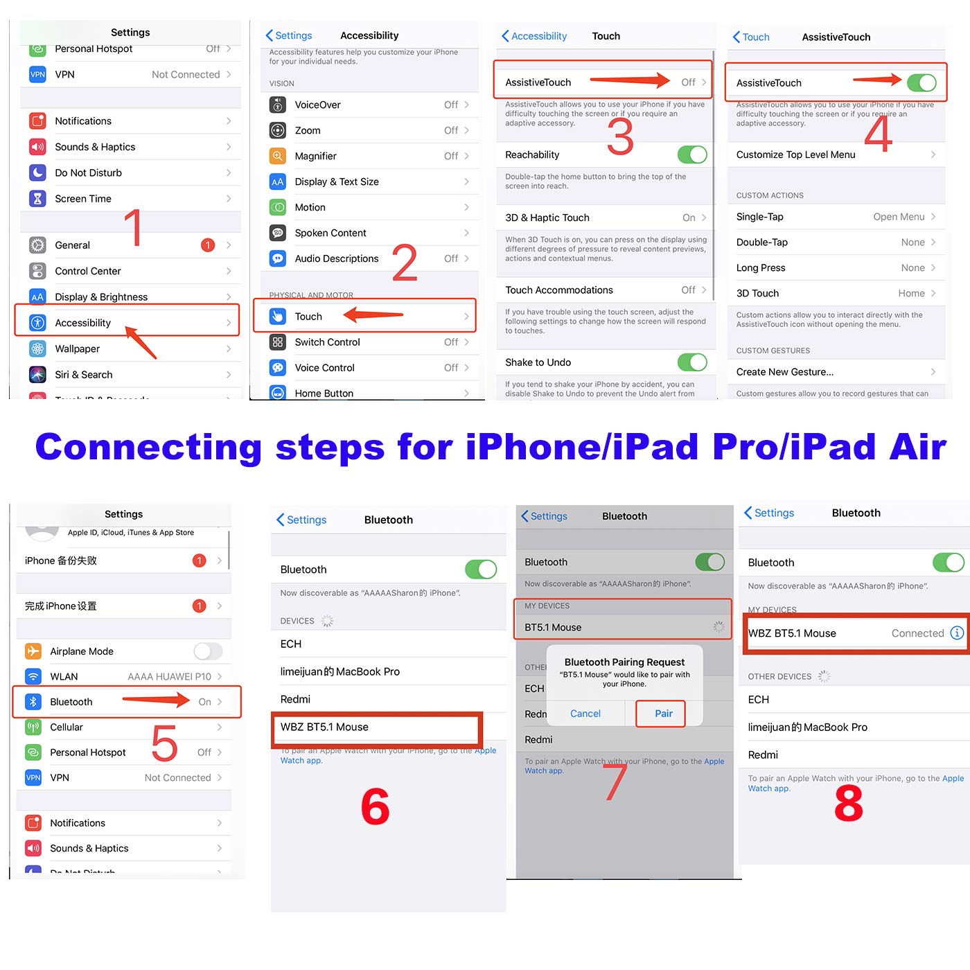 Choose PEIBO dual-mode Bluetooth wireless mouse (BT5.2+BT3.0+2.4Greceiver+USB C adapter), which is more conducive to our connection and use on any computer device, HOW to use Bluetooth mouse mode: First, slide the mouse switch to Bluetooth mode (blue light) > open laptop system preferences settings> turn on Bluetooth function >, when laptop Bluetooth is searching for nearby Bluetooth devices> you need to press and hold the blue button at the bottom of the mouse '' for 3 -4 seconds, The blue light flashes . (If there is no Bluetooth button, you can skip this step and click the connection directly).> Bluetooth search there appears Bluetooth 5.2 mouse>click to connect "BT5.2 mouse or BT3.0 mouse (BT3.0 for old laptop)" > connection is successful How to use mouse 2.4G USB receiver mode: First, switch the mouse switch to 2.4G mode (green light)> Then remove the USB receiver from the slot on the bottom of the mouse > Plug the USB receiver into the USB port of your laptop,plug and play.(Works with all USB ports and USB c Laptop and desktop ports, (Note: Computers with usb c ports please use with usb c adapter)) How to use the bluetooth mouse on the ipadOS13 and above iPad pro 11/12.9inch ipad air 10.9inch ipad mini 8.3inch iPad 10th gen 9th gen 10.9inch : First, open iPad settings, find accessibility, turn on touch controls, find assistive touch controls, turn on assistive touch controls, then pull down to find the device, turn on the Bluetooth device, then turn on the mouse switch, press and hold the black button on the bottom of the mouse for 3-4 seconds, (If there is no Bluetooth button, you can skip this step and click the connection directly).your iPad will search for a Bluetooth 5.2 mouse and click "Connect". Pairing password: 0000, (if you can't find the Bluetooth mouse device, please restart the mouse or iPad Bluetooth function, or restart the iPad) How do I charge a wireless mouse? When your mouse pointer does not move or cannot be used, or suddenly disconnects continuously during use, this is the reminder that you need to charge the Bluetooth mouse for about 3 hours. Please use an adapter with an output of no more than 5v for charging, or a power bank, or a USB port on your laptop. (Charging is prohibited on chargers with output 10V or more) Packing list: instruction manual *1, rechargeable Bluetooth 5.2 + BT3.0 + 2.4G USB receiver dual-mode wireless mouse *1, (2.4G USB receiver hidden in the bottom slot of the mouse), USB charging cable *1, USB C adapter*1, packaging box *1.