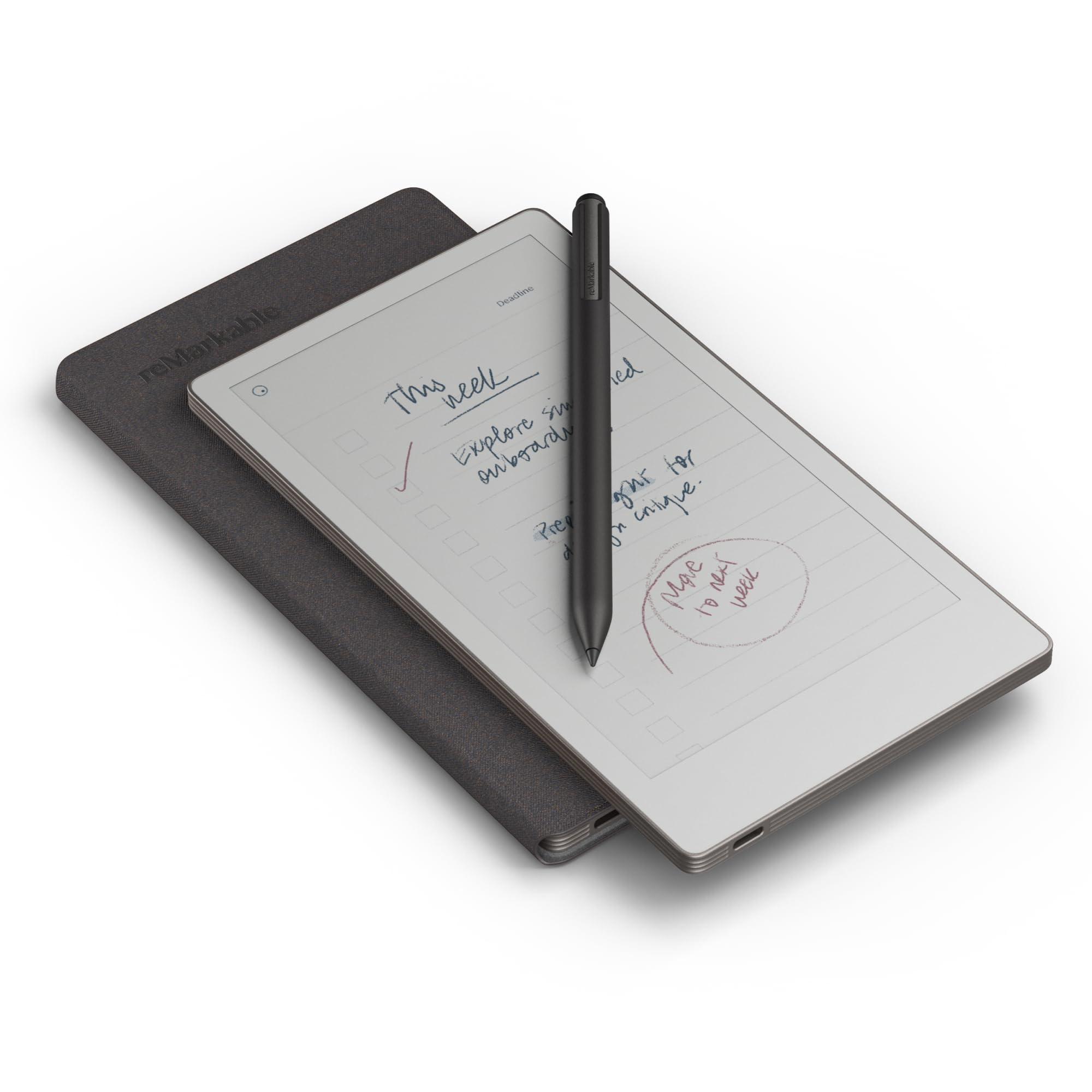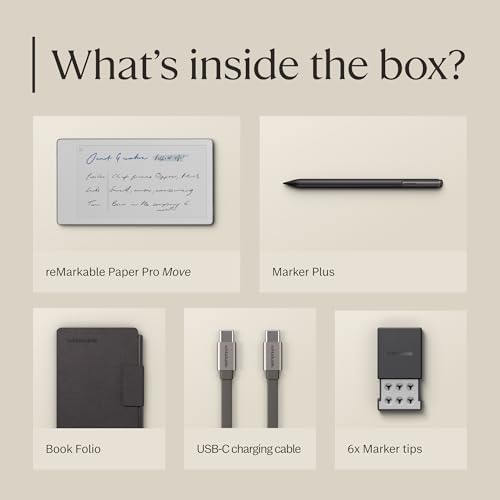 WHAT'S INCLUDED – reMarkable Paper Pro Move, an ultraportable digital paper tablet with a 7.3" Canvas Color display, Marker Plus, Book Folio - Mosaic weave - Basalt, 6 spare Marker tips, USB-C cable. Marker tips last up to two months each, but may vary with writing style and pressure.