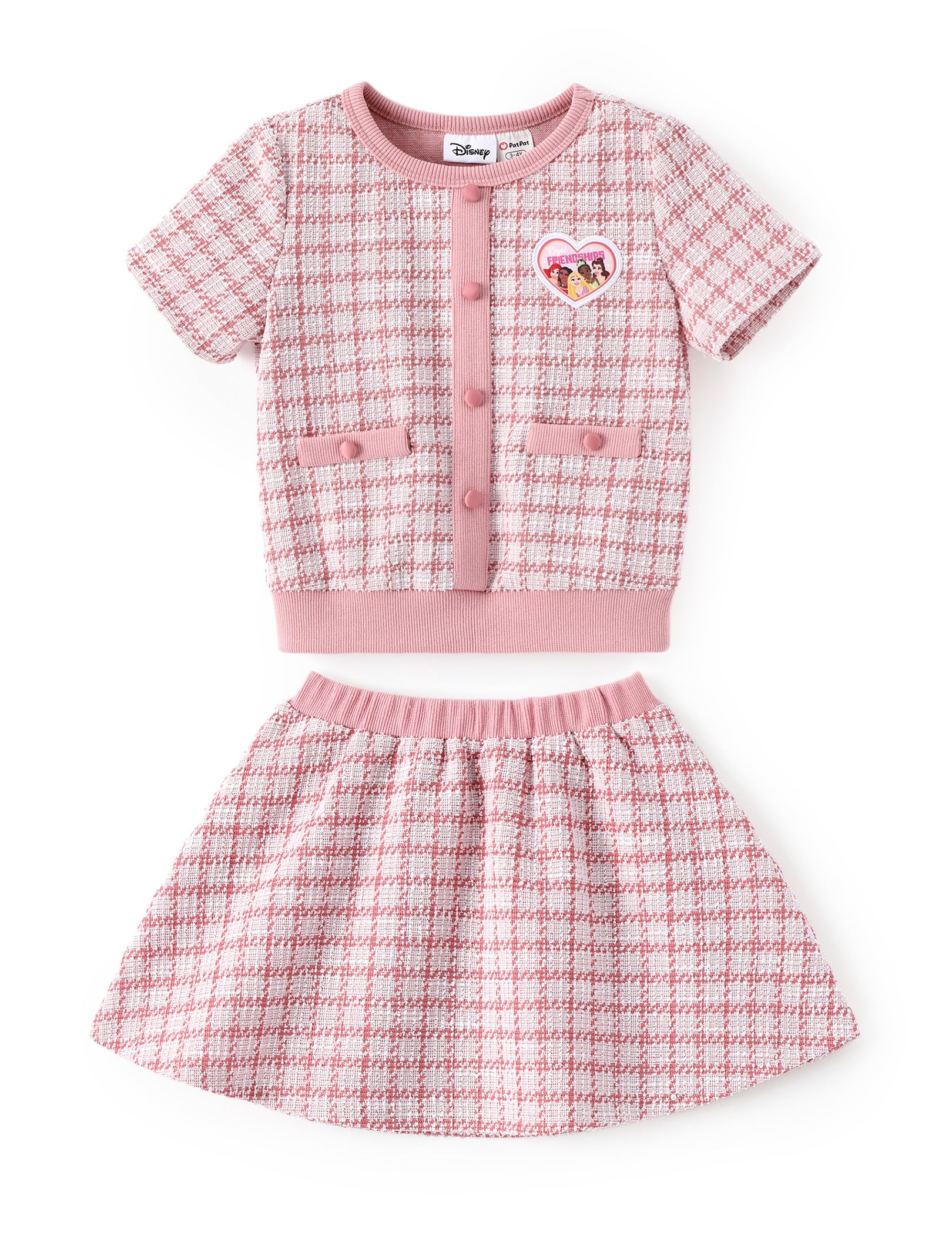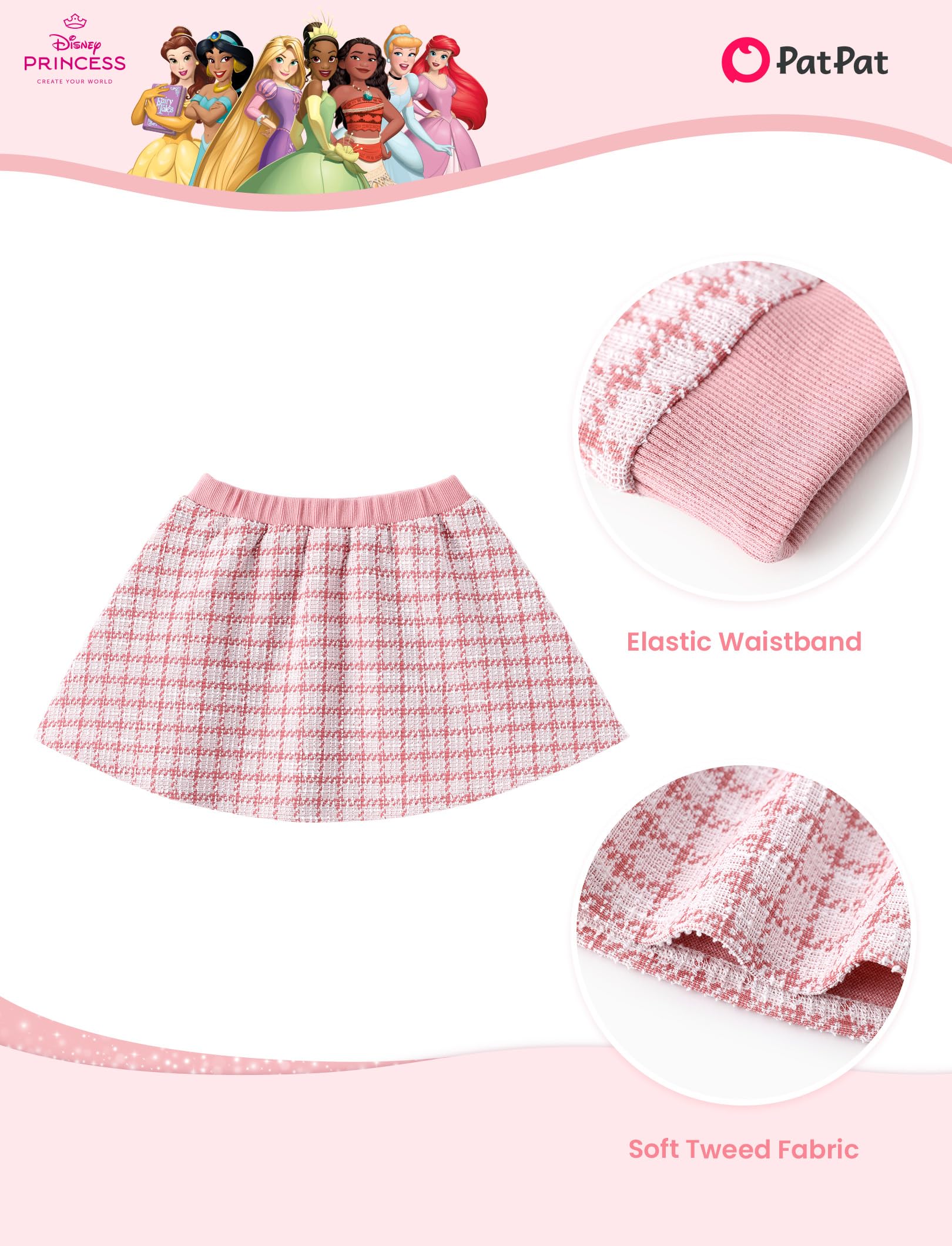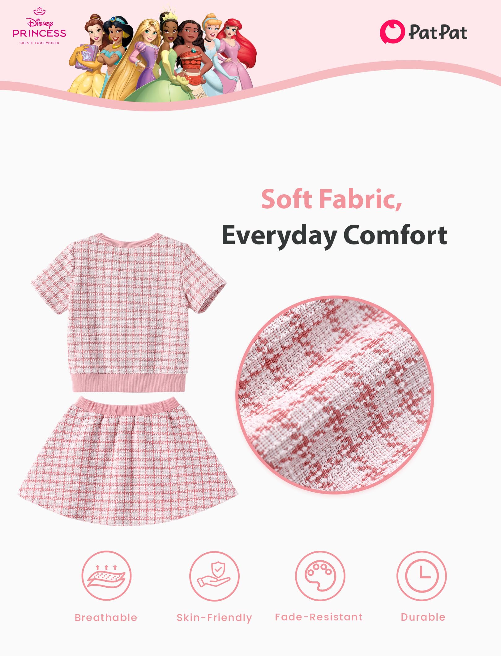Charming 2-Piece Design: This delightful Disney princess dress features a soft knit top in a pastel muted pink shade with vibrant graphics of Ariel, Rapunzel, Belle, and Tiana. The top has a classic round neckline and is designed as a pull-over style for easy wear. The skirt is flared and pleated, made from textured fabric, and features two decorative fake pockets for added detail, adding charm and playfulness to the outfit