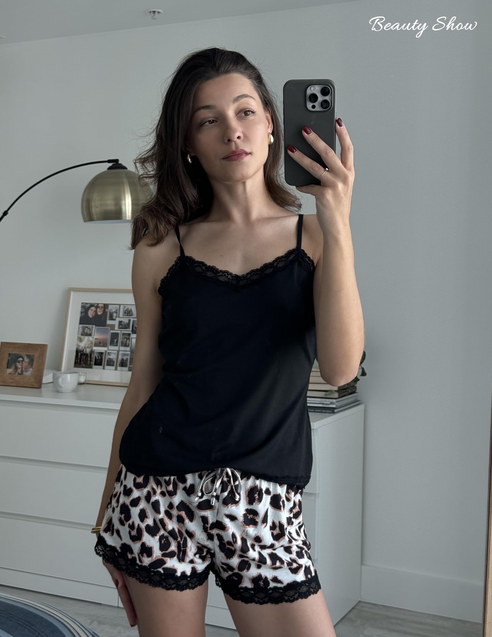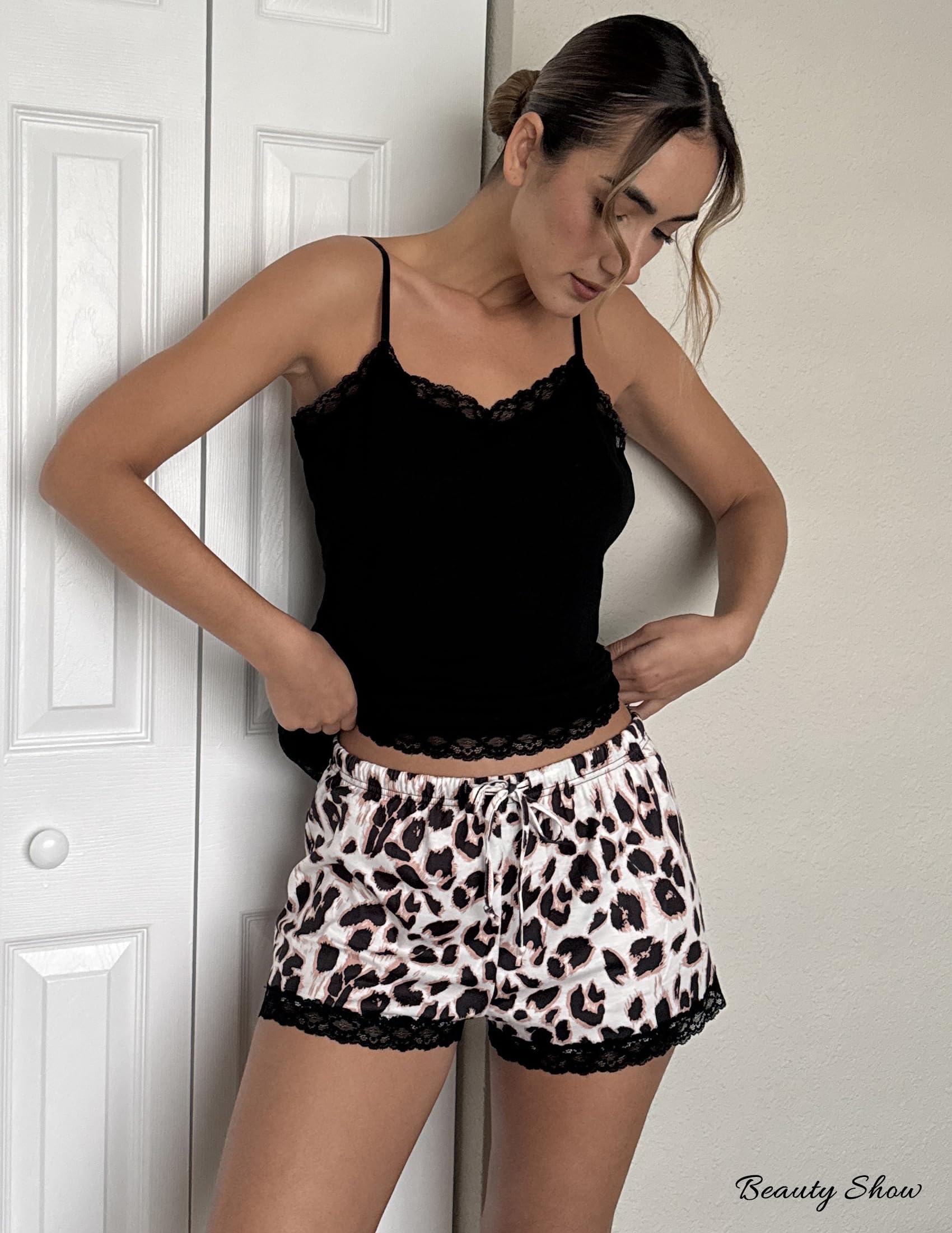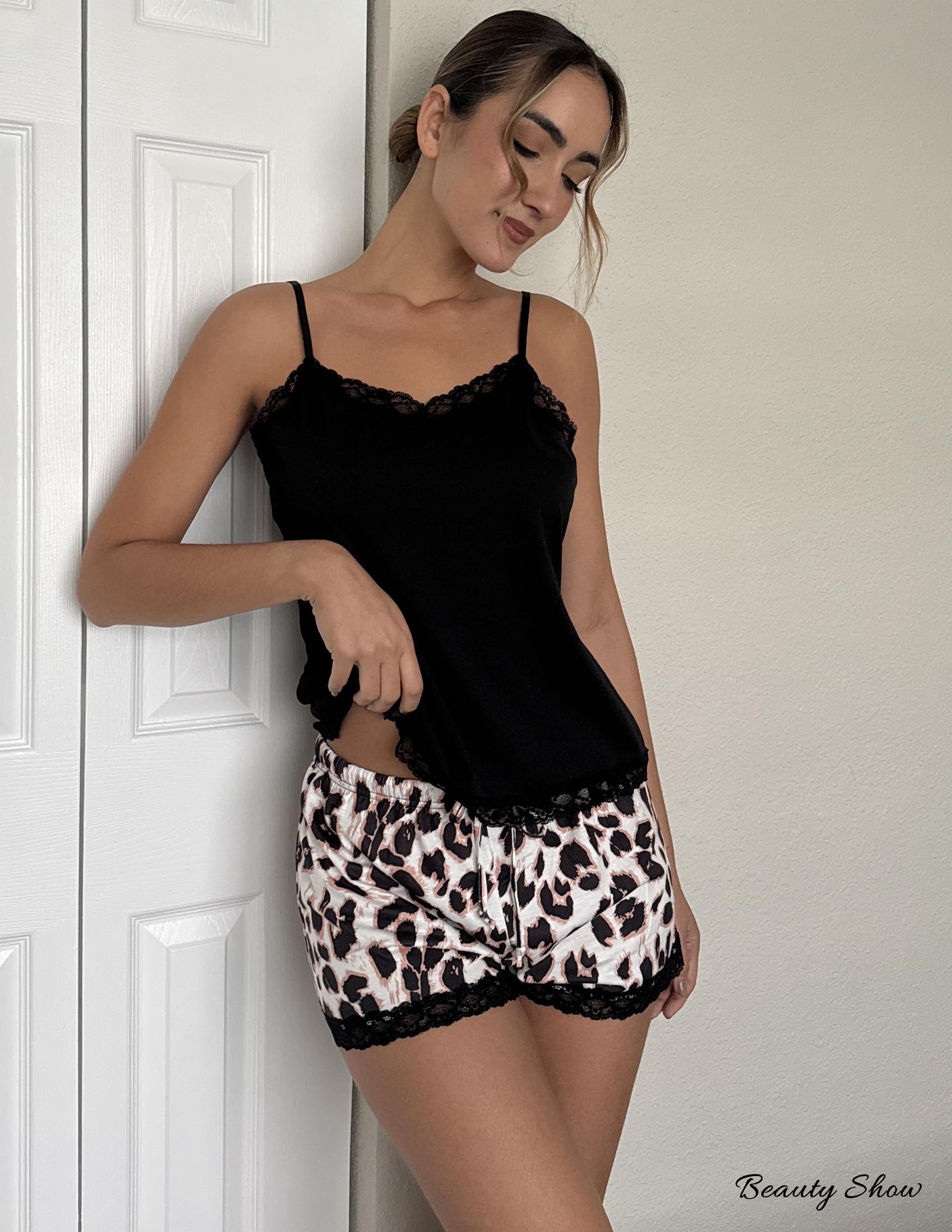 Cami pajama set women shorts featuring a plunging v neck, decent lace trim and adjustable shoulder straps, simple and stylish, shows off your body curves in nice coverage way