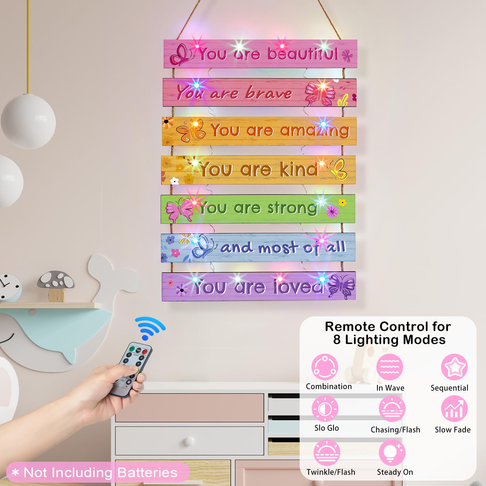Package: The play room decor for kids package includeds 1 pcs girls room decor board, 1 pcs LED light with empty battery box (not including batteries), 1 pcs remote control (not including batteries), both do not including batteries, need to be purchased by customers themselves