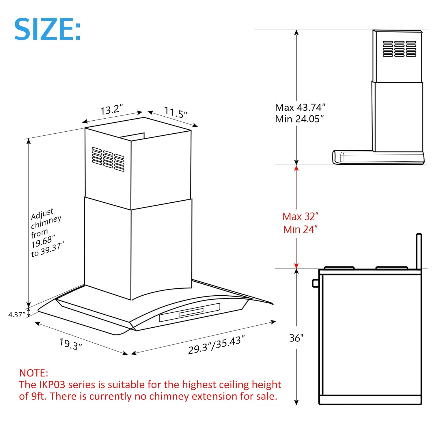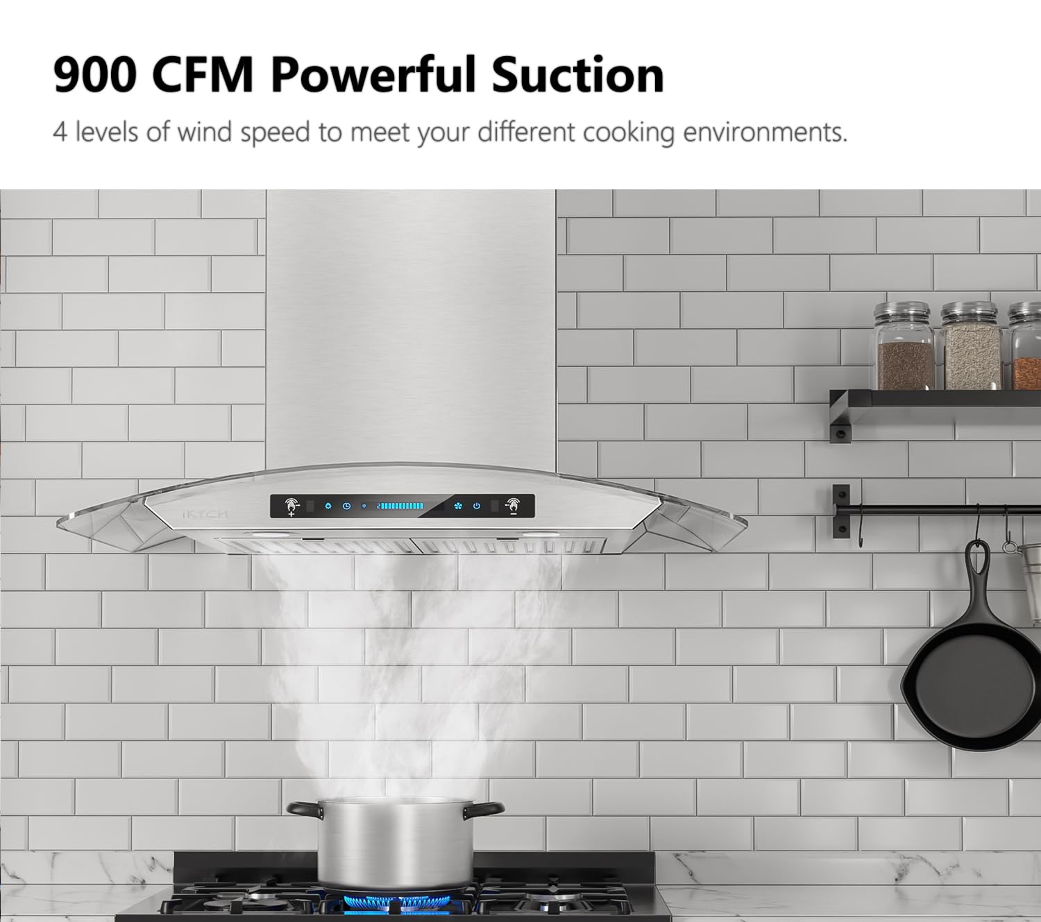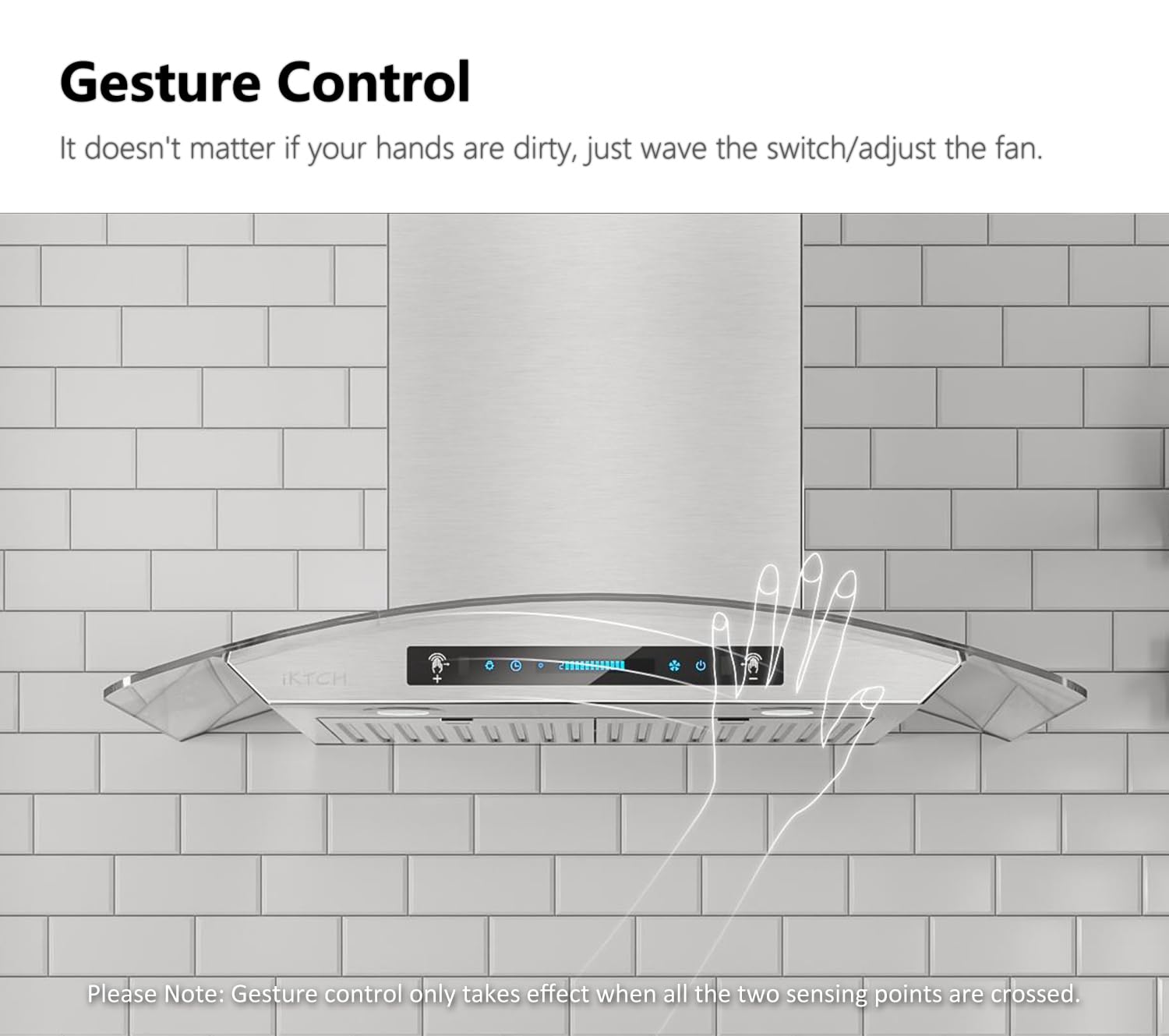 【Modern Design】: IKTCH Wall Mount range hood is made of a perfect combination of stainless steel and tempered glass, which has an elegant appearance and comes with remote control. The novel gesture sensing function gives you a whole new experience.