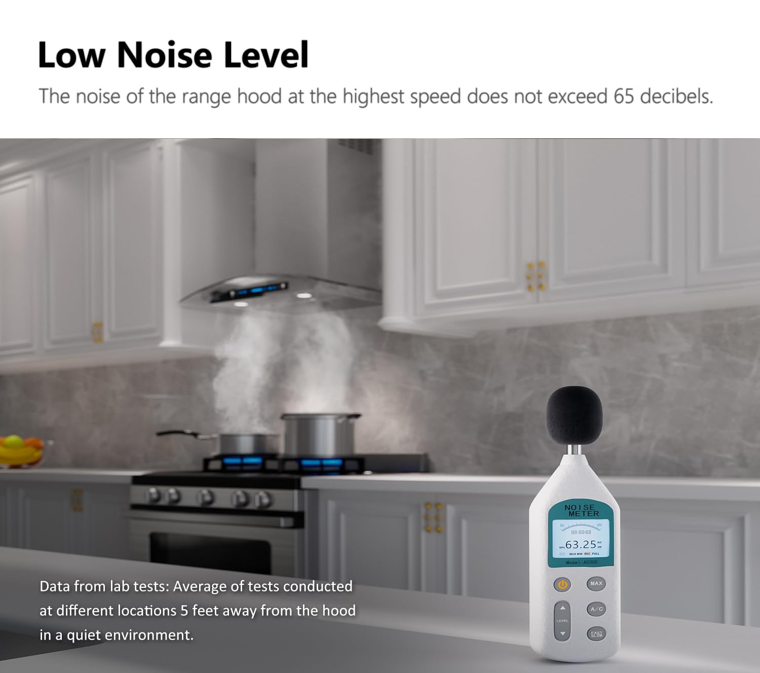 【Ultra-Quiet Operation】: Customize your kitchen stove vent with the 4-speed setting to play with the suction and noise level. The noise level is at 40 decibels on the lowest setting and only 65dB max noise level.