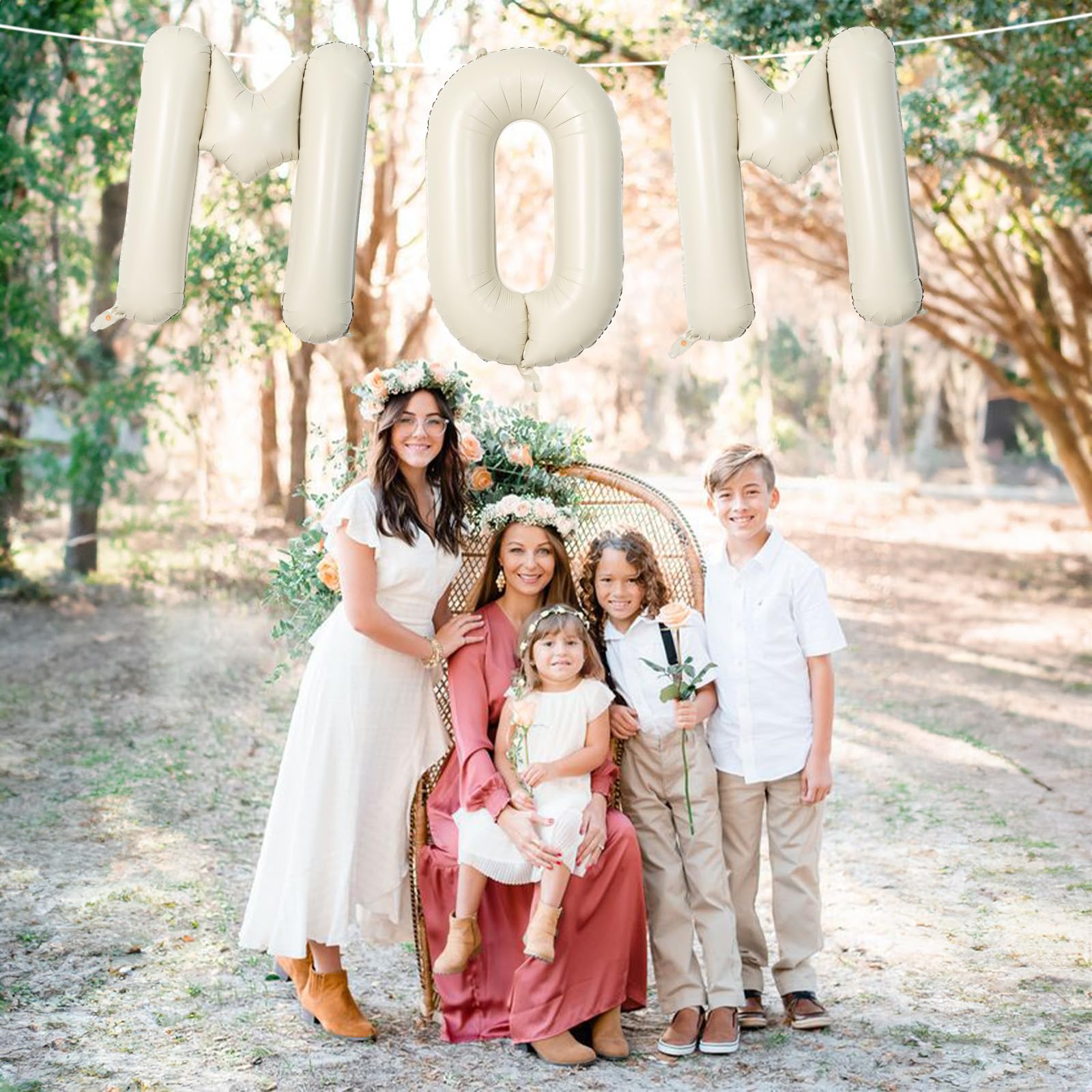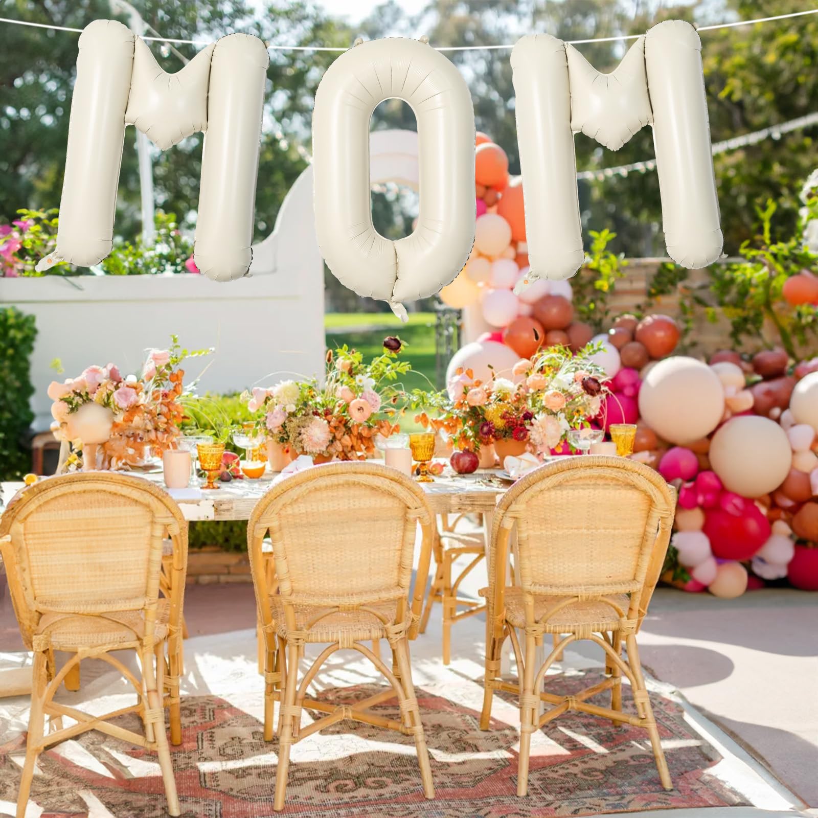 💕 Easy to Inflate 💕 The gaint boho ivory white MOM balloons have self-sealing valve does not need to be knotted for easy inflation and deflation. It can be inflated with air or helium. When filled with helium, the foil letter Mothers day balloons can float in the air; after filling, press the valve of the balloon to seal it. It can be reused. Do not throw away after use!