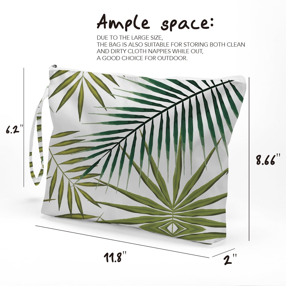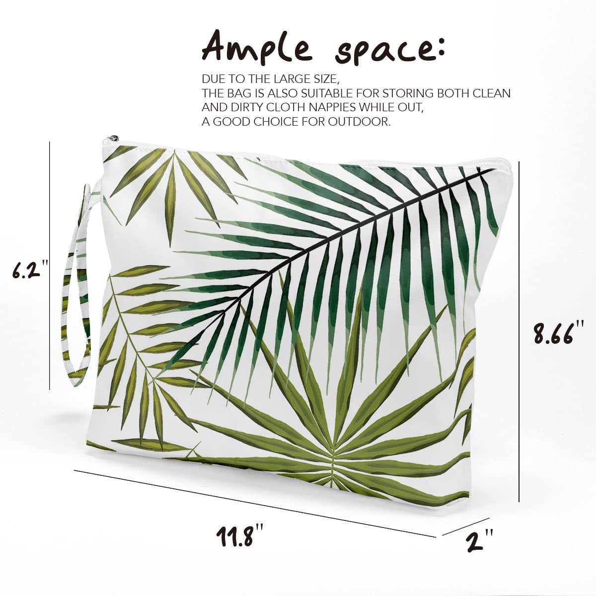 Ample space: the size of the bag is approximately 11.8 x 8.66 x 2 inches. It is designed with zipper, easy to open and close. Comes with a handle, you can hang the bag on the door knobs, towel rod, anywhere you want. Due to the large size, the bag is also suitable for different kinds of cosmetics and other stuff, a good choice for indoor outdoor.
