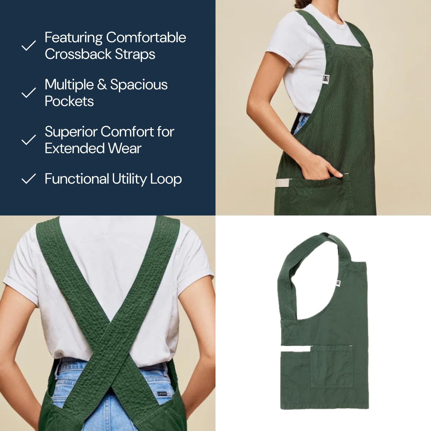 LIBERATING CROSS-BACK COMFORT - Our signature crossback straps distribute weight evenly across shoulders instead of pulling on your neck, enabling 8+ hour shifts without fatigue while the breathable 7oz cotton-linen blend (60% cotton, 40% linen) keeps you cool - perfect for line cooks who've struggled with traditional aprons, transforming painful workdays into comfortable productivity through thoughtful design