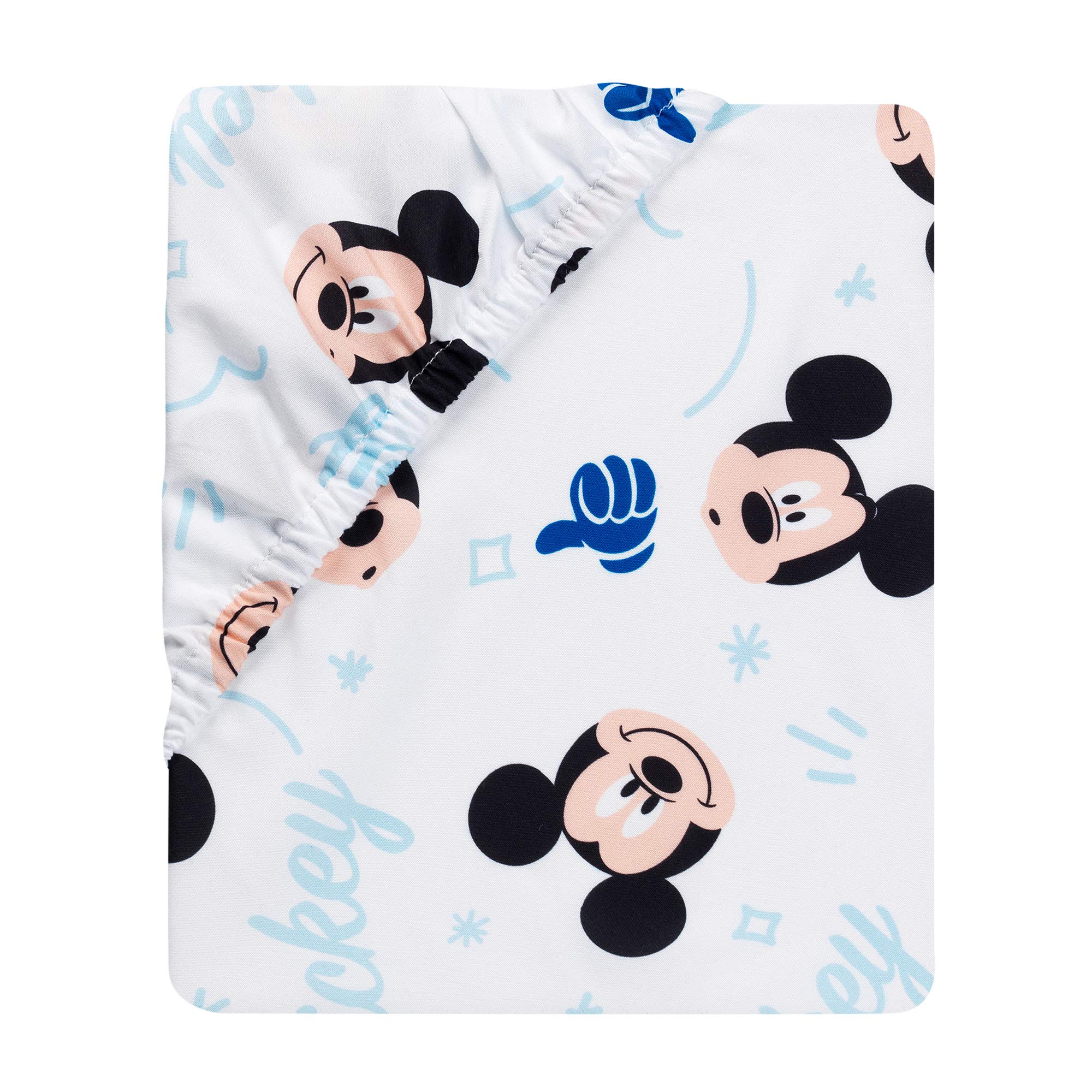 Script-style “Mickey”, hand signals, and Mickey heads decorate this fitted crib sheet