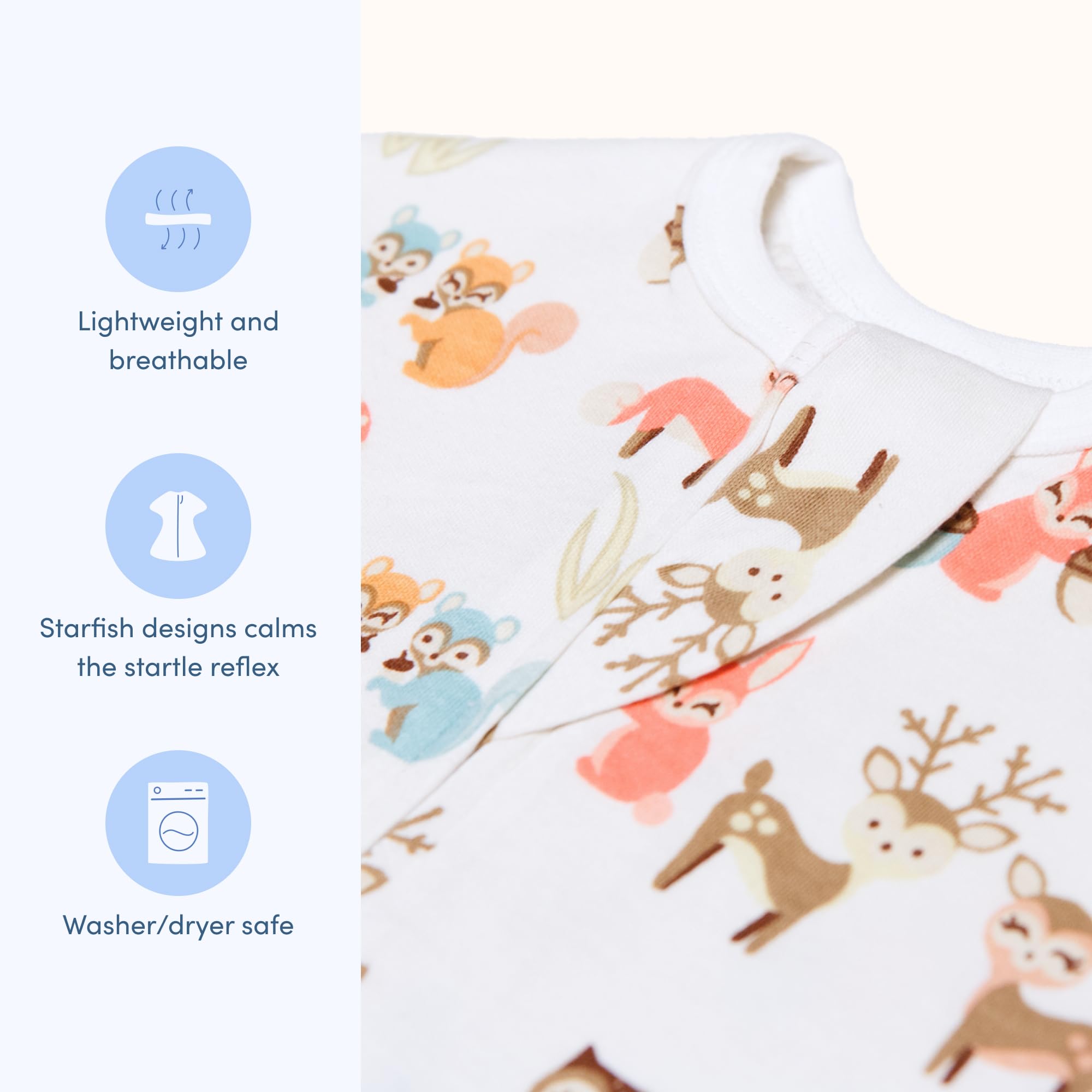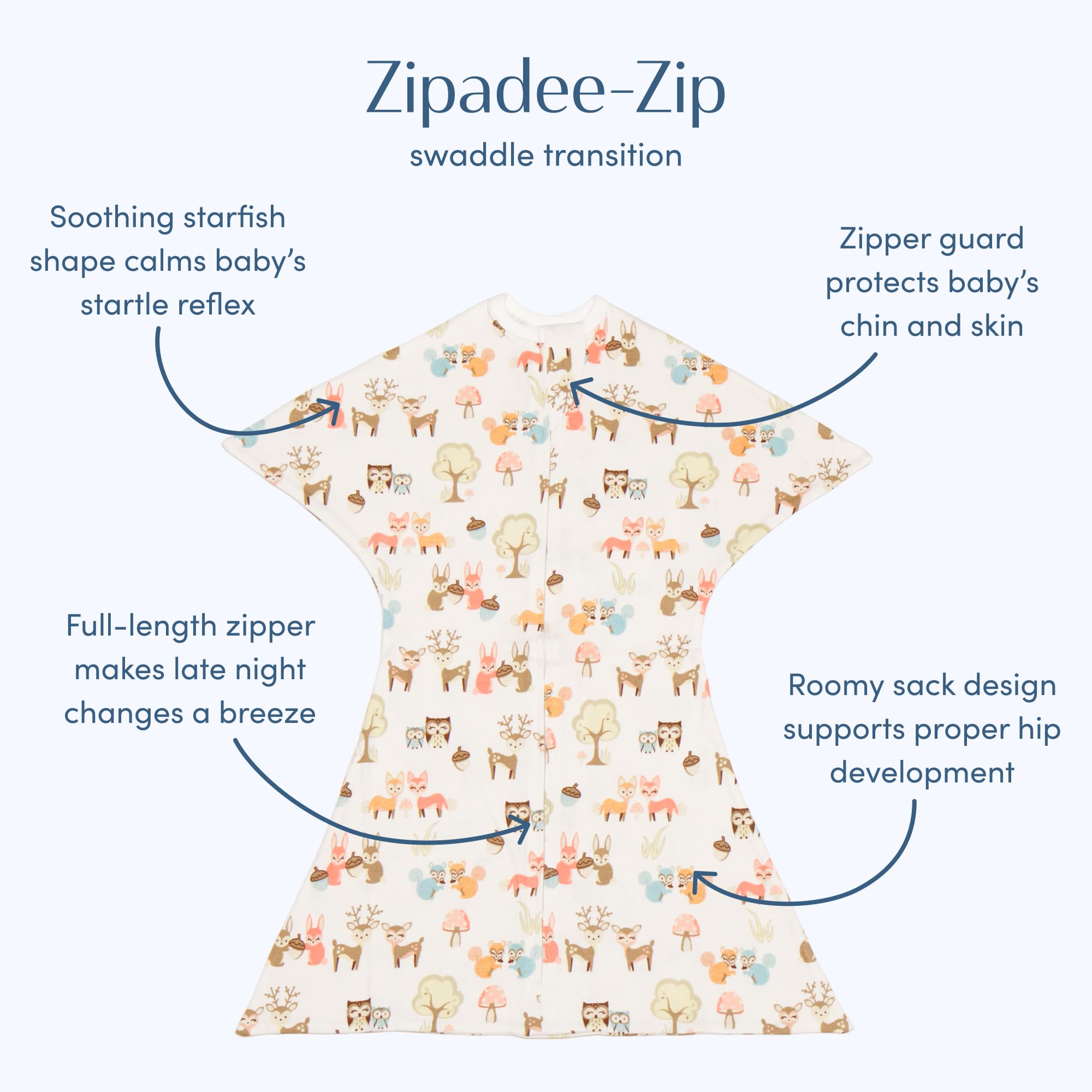 "Easy Diaper Changes: Featuring a convenient zipper which allows for quick and easy diaper changes, our zip-up swaddle makes nighttime routines smoother and less disruptive for both you and your baby"