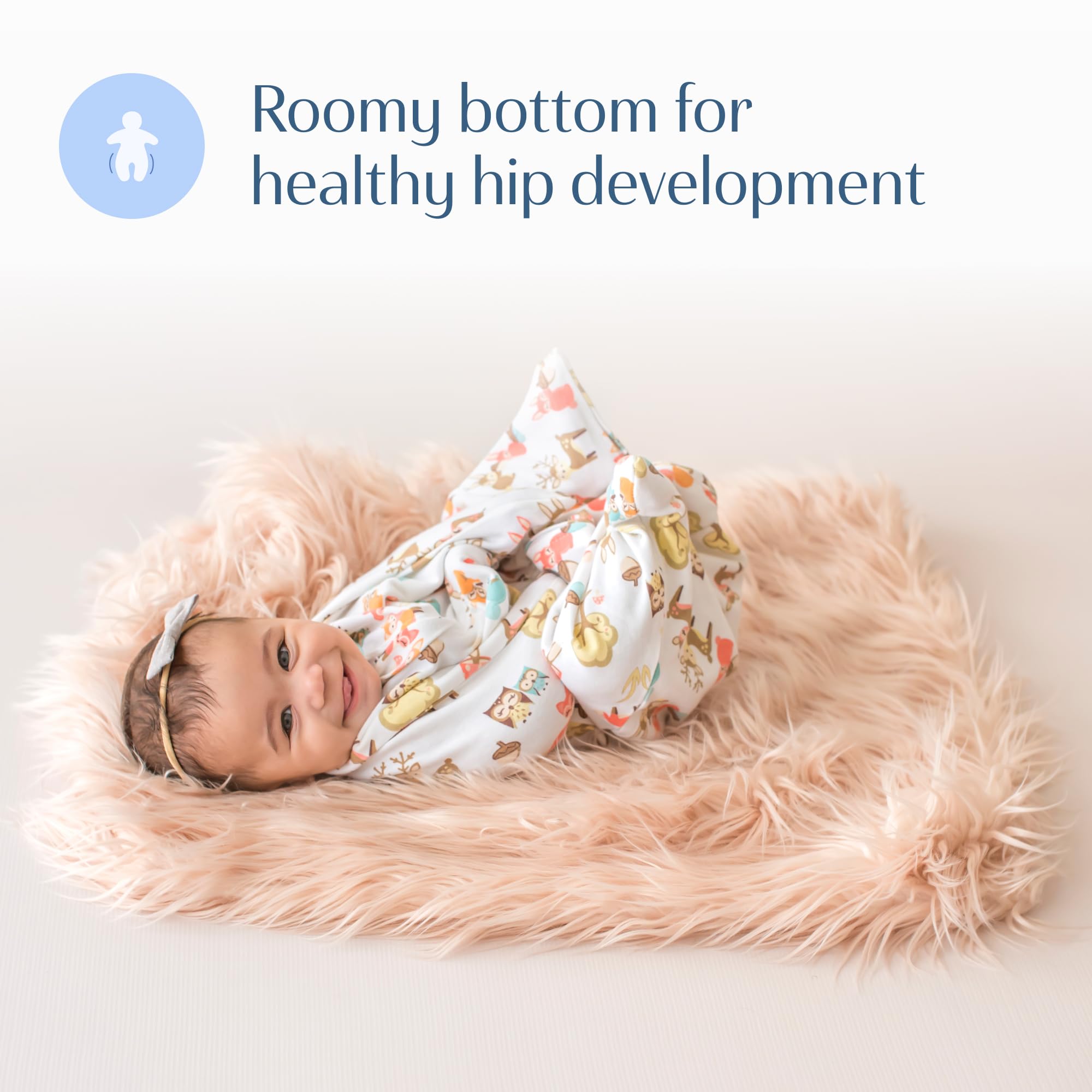 "Supports Proper Hip Development: The roomy design of our baby transition swaddle provides ample space for your baby's legs to move freely and naturally. By allowing unrestricted leg movement, this design supports the healthy growth of your baby's hips and ensures comfortable, safe sleep"