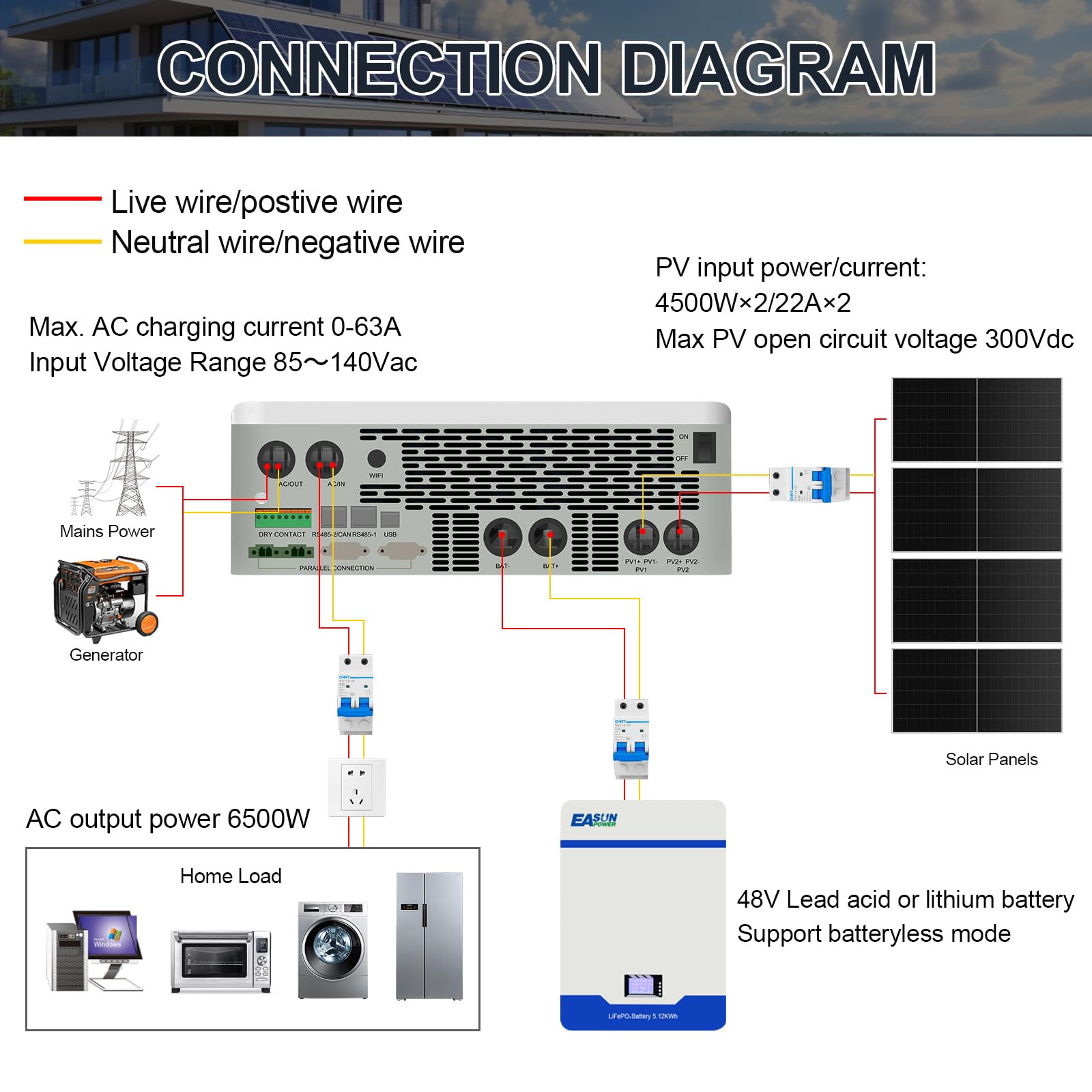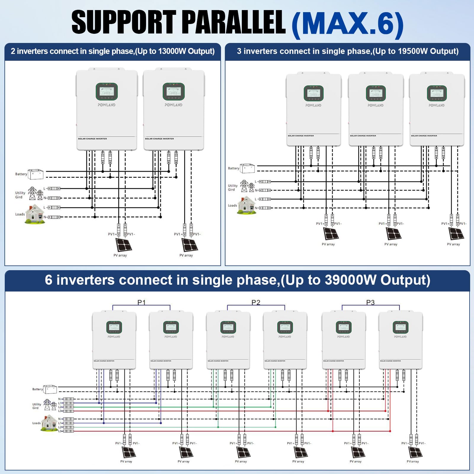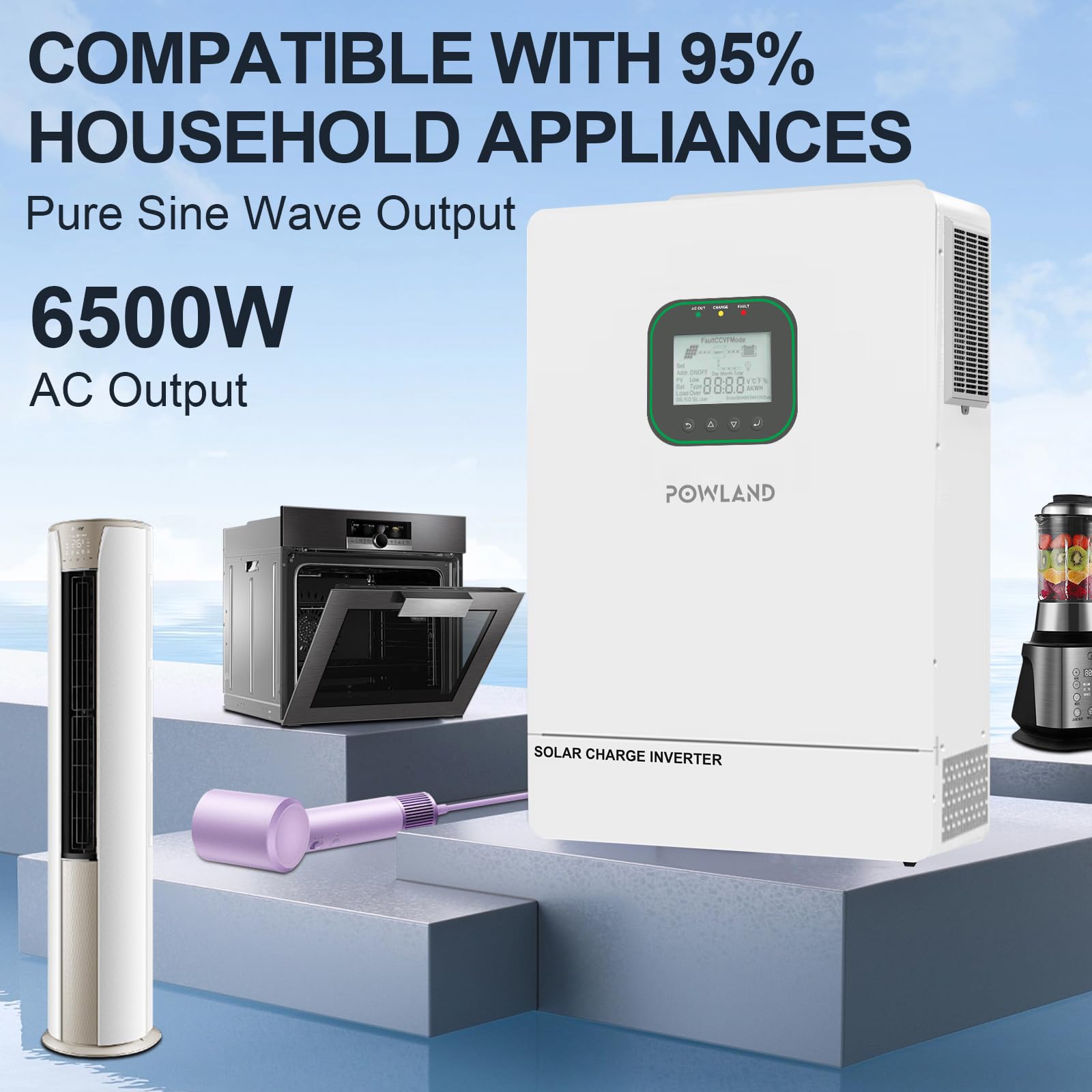 【6500W Pure Sine Wave Powerhouse】6500W Solar Hybrid Inverter Output Voltage Regulation120Vac±5%, Rated output power : 6500W; Max PV Array Open Circuit Voltage: 300VDC, PV operating voltage range: 120-300Vdc, MPPT voltage range: 90-260Vdc, Max AC Input Voltage: 140Vac,Max PV input current: 22A. The inverter has a WiFi port, which requires the purchase of an additional WiFi device link, and can be remotely monitored via the APP.
