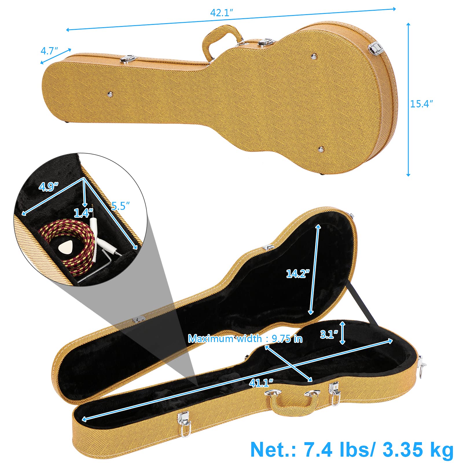 【GUITAR CASE SIZE】- This guitar case fits GLP electric guitar. If yours is any other type, you can measure your guitar and take a look at dimensional drawing before purchasing. Interior Dimensions: Overall Length 41.1", Width 14.2",Height 3.1"/ External Dimensions:Overall Length 42.1", Width 15.4",Height 4.7"