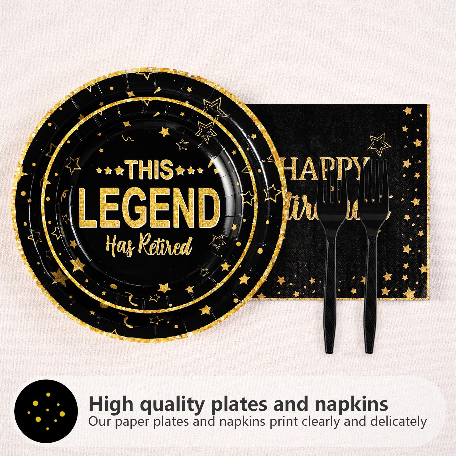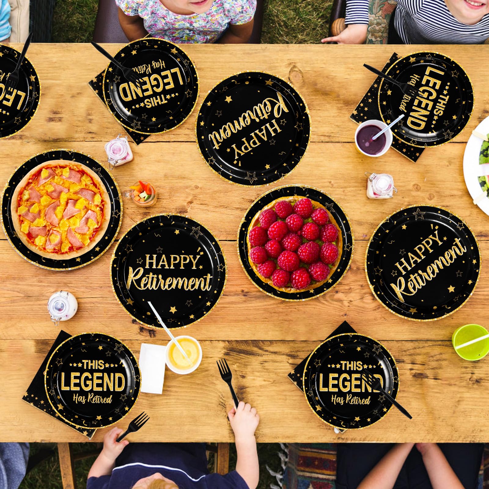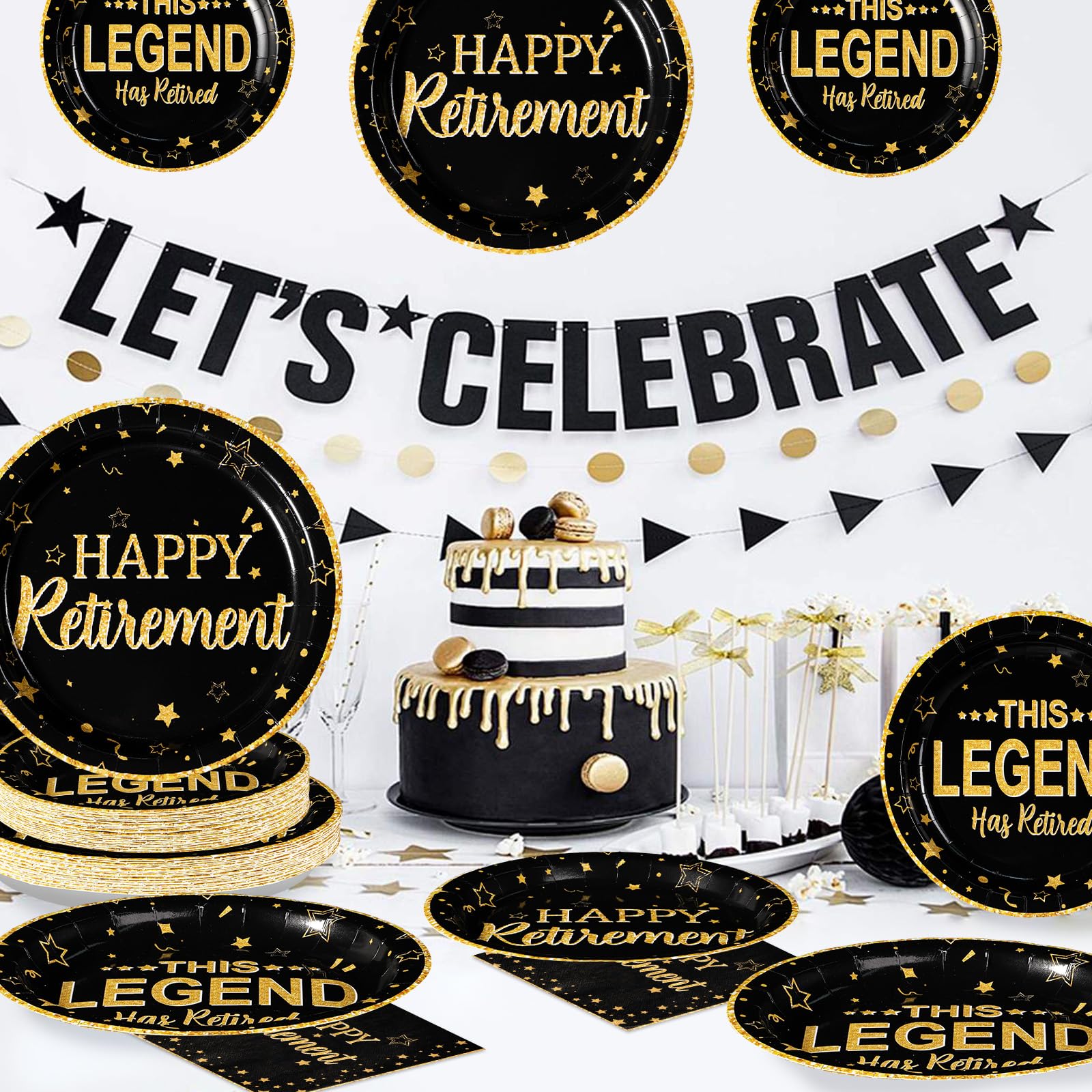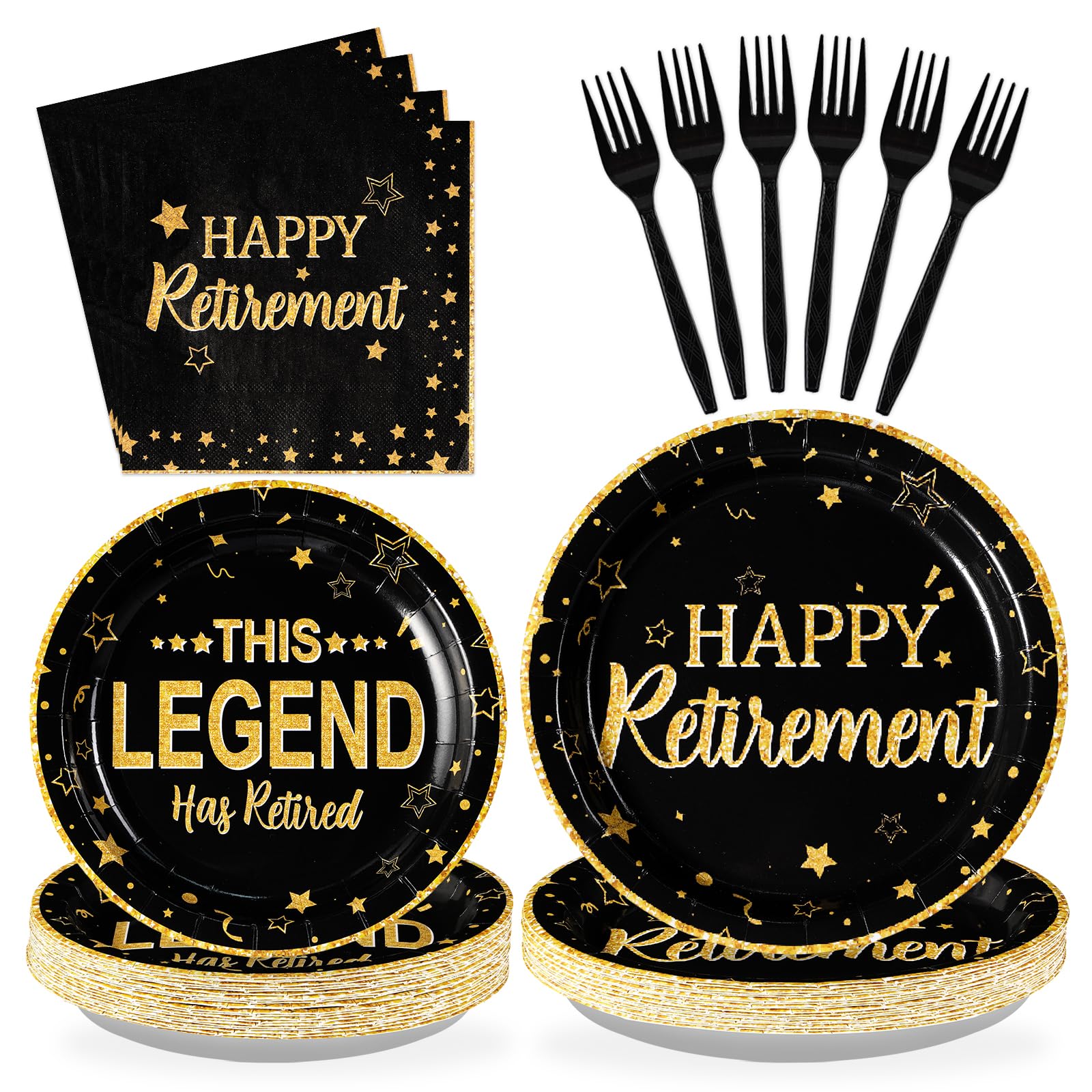 Sophisticated Retirement-Themed Design: Crafted with a sleek black and gold color scheme, this dinnerware set elevates retirement celebrations with elegant, minimalist flair. Each 9" and 7" plate features bold, metallic lettering: “Happy Retirement" and “This Legend Has Retired," while the 6.5" napkins repeat the celebratory “Happy Retirement" motif. The cohesive design ensures a polished look for tablescapes, photo backdrops, or buffet setups, making it ideal for honoring retirees in style