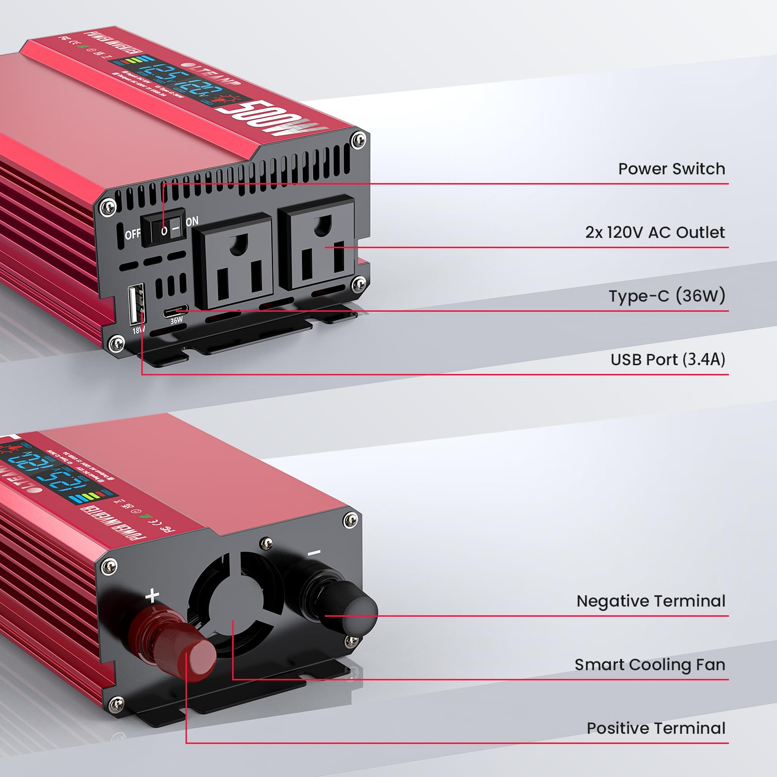 【WHAT YOU WLL GET】- 500 watts 12V modified sine wave power inverter, alligator clips, car cigarette lighter, user manual. And 12 months after-sales guarantees.
