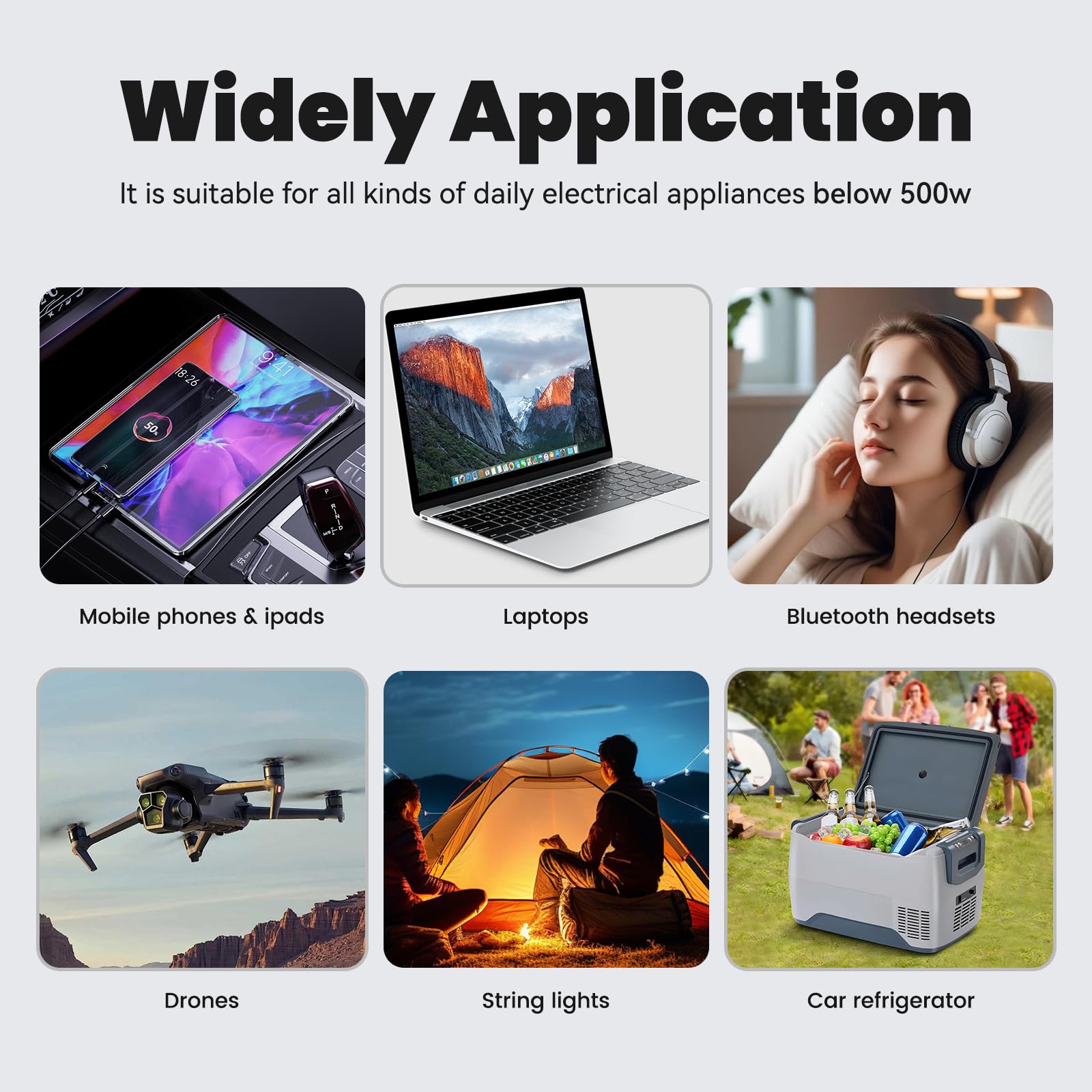 【TRAVEL AND EMERGENCY EQUIPMENT ESSENTIALS】- This converter is suitable for car vehicle, truck, rv, boat, road trips, camping, outdoor work. It can also power lights, routers, fans by connecting a deep-cycle battery during power outage.