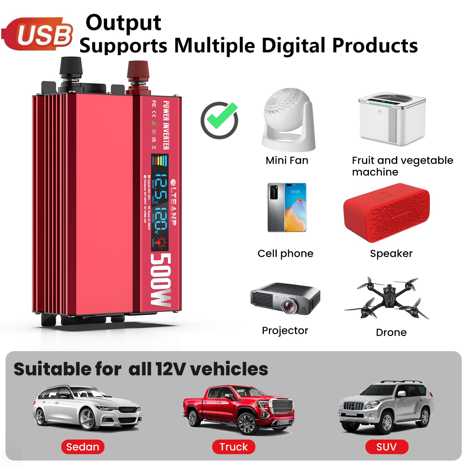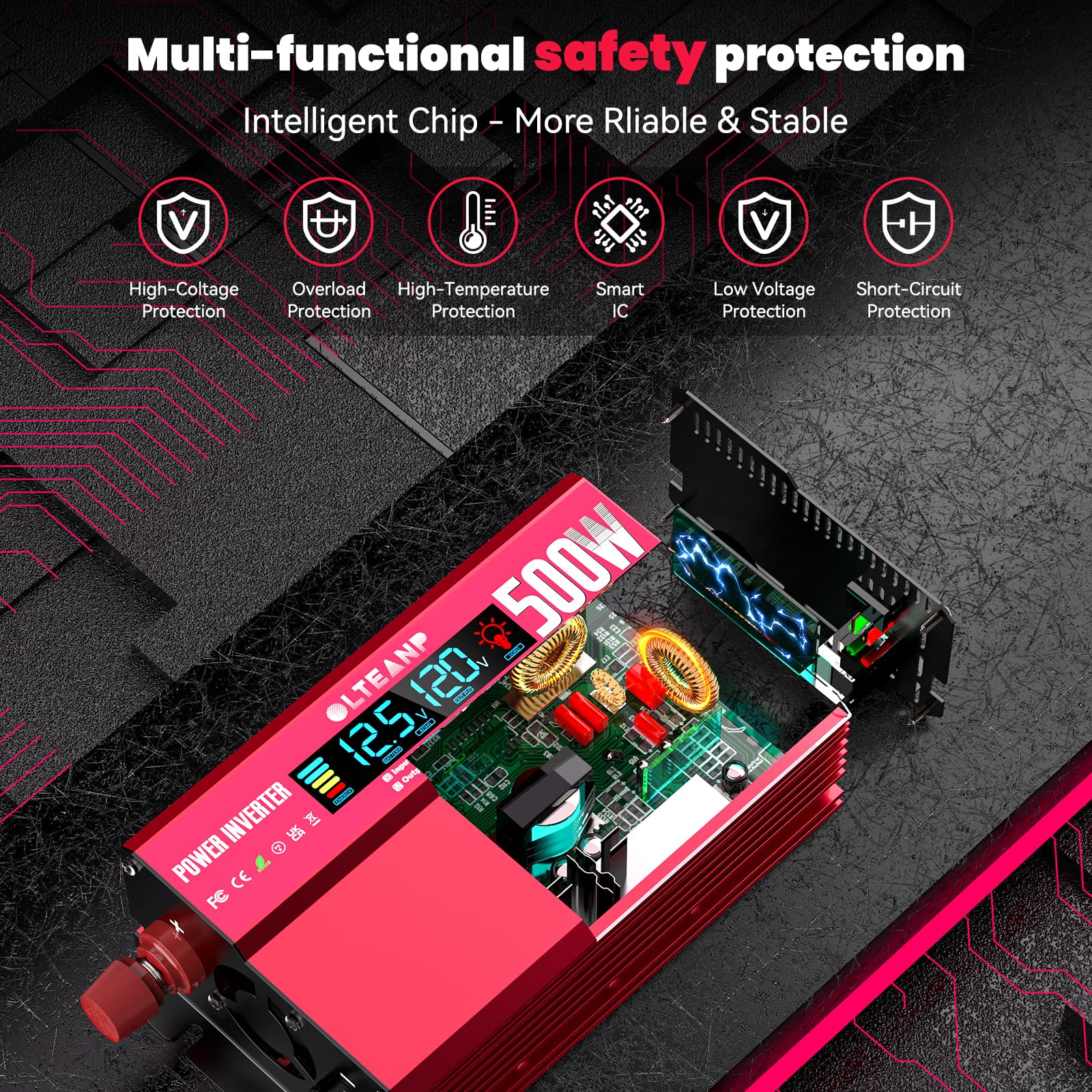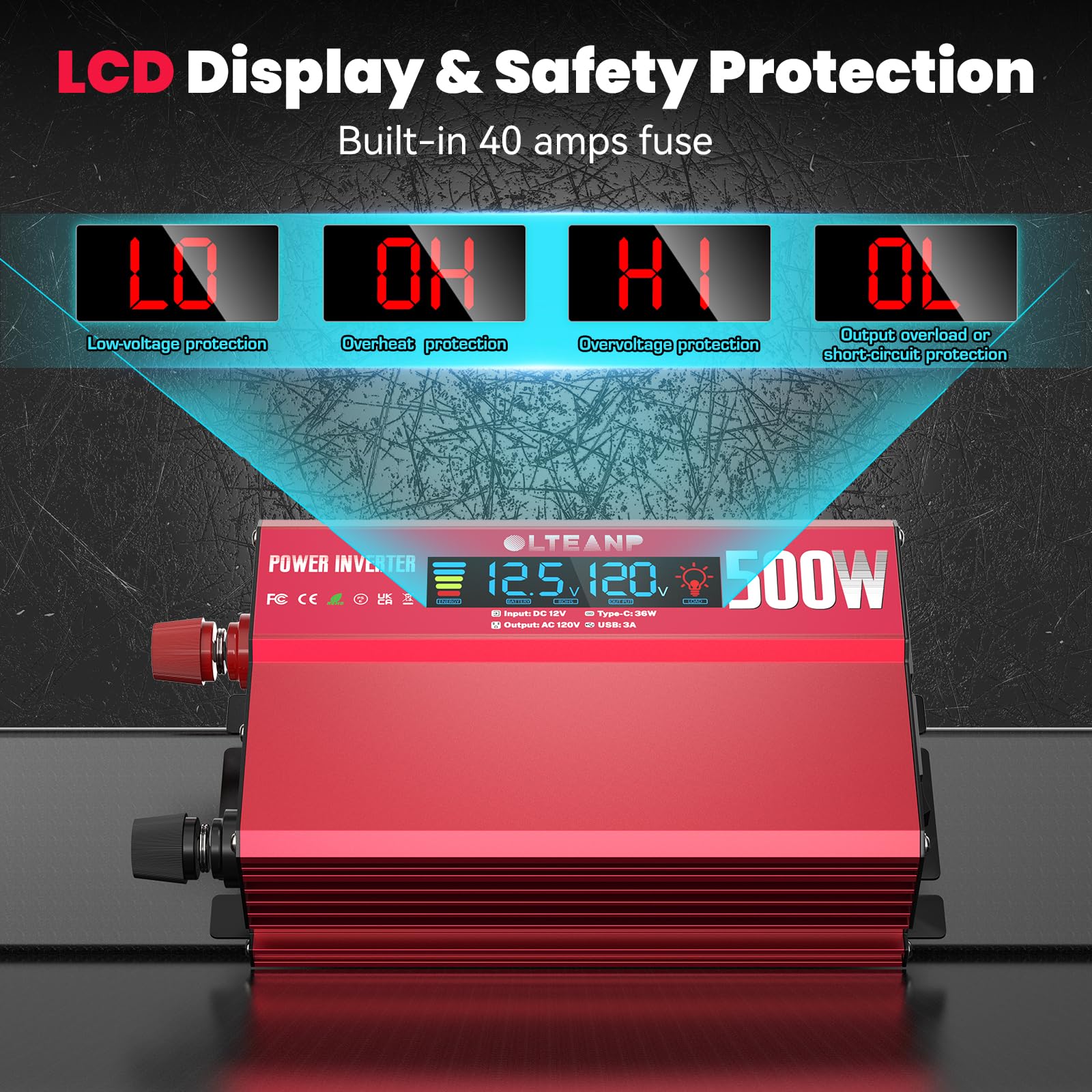 【 NEW UPGRADED POWERFUL 5000W CAR POWER INVERTER】- The OLTEANP Power Inverter offers a continuous DC to AC power supply of 500W, convert power from 12V to 110V, with a peak surge of 2000W during load startup. It employs advanced high-frequency transformers and features 100% pure copper ultra-flexible cables, ensuring a high level of safety during use.