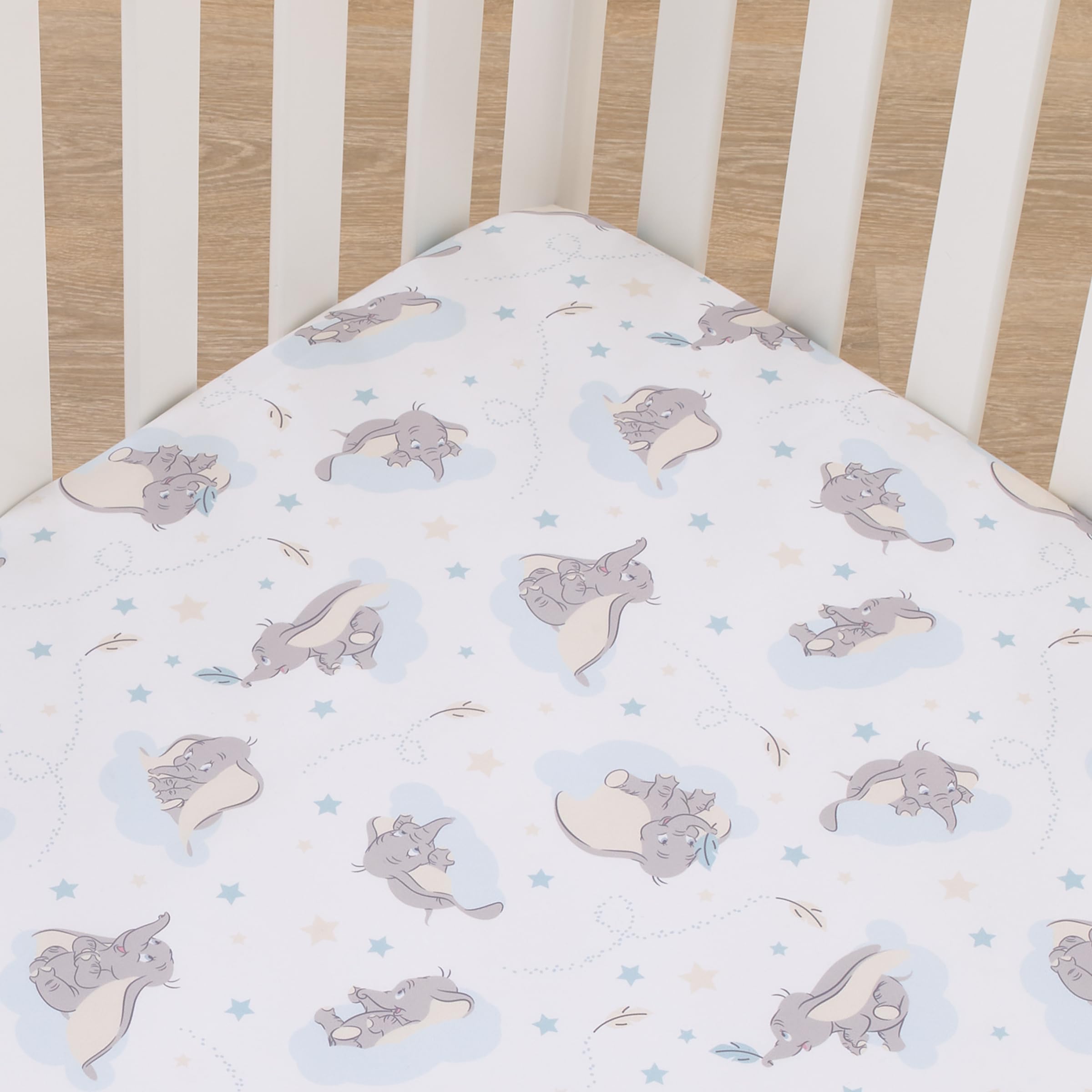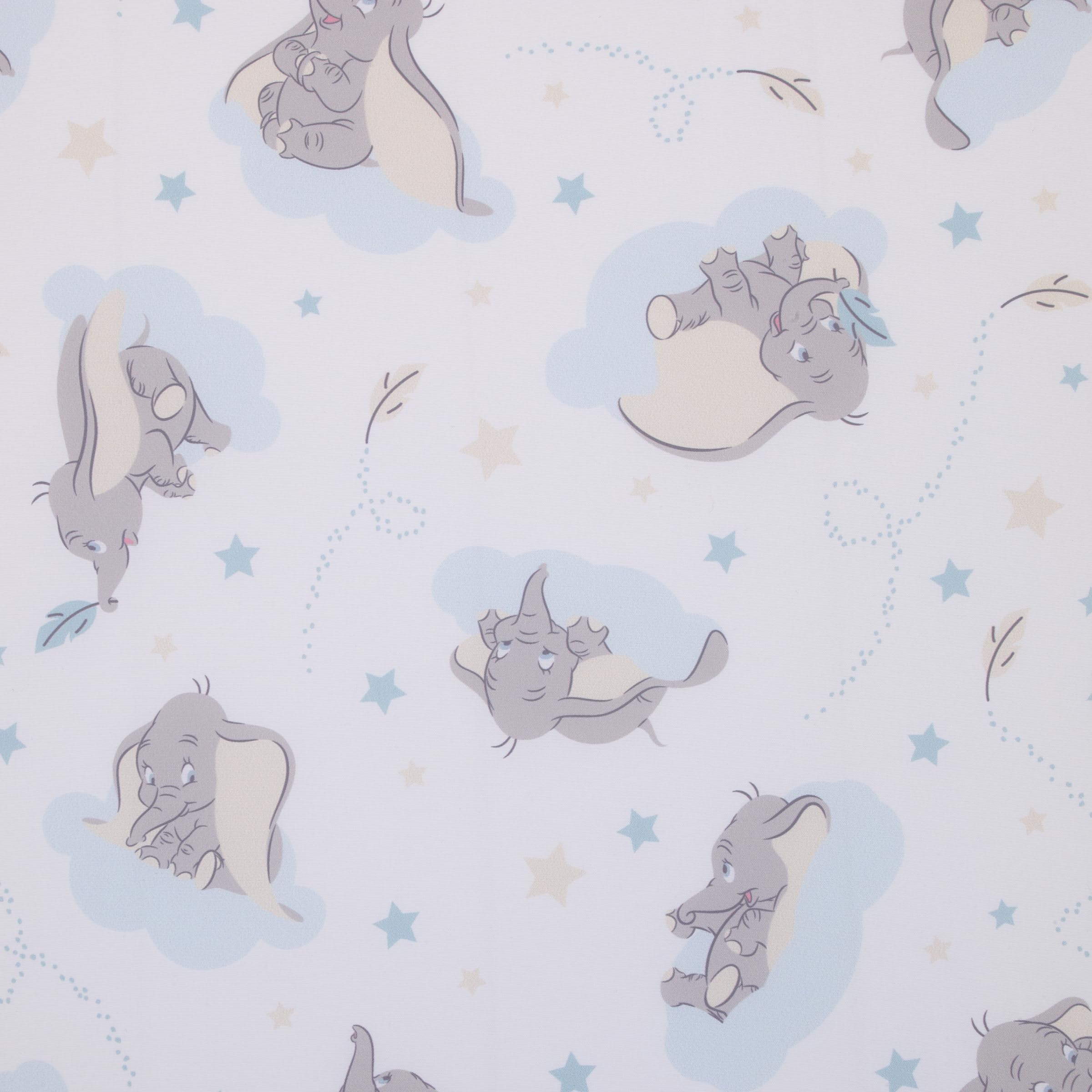 The Disney Dumbo Fitted Mini Crib Sheet features an adorable allover pattern of sweet little Dumbo with his big ears! Beautifully designed in shades of light blue, gray, and white. Dumbo is floating upon puffy clouds with stars and feathers. Your little one will sleep soundly on this mini crib sheet's cozy surface. Measures 24" x 38" x 5" and includes full elastic edges for a safe and snug fit and fits a standard size mini crib mattress. Coordinates nicely with most decor and perfect for your Dumbo nursery!