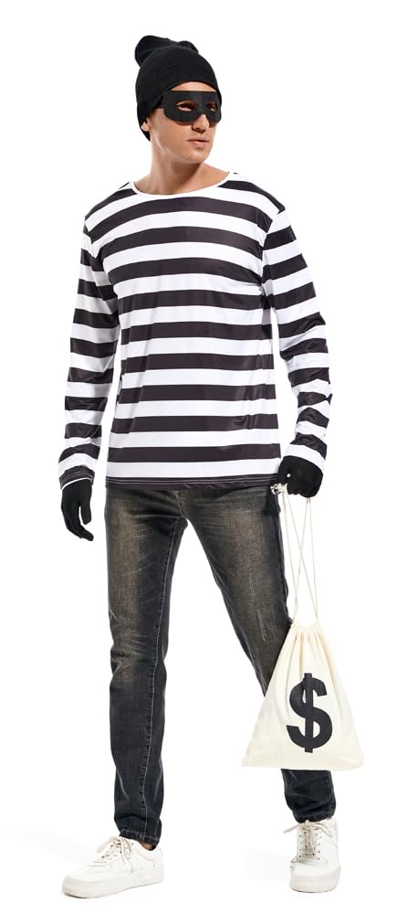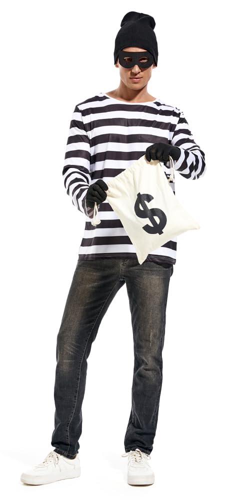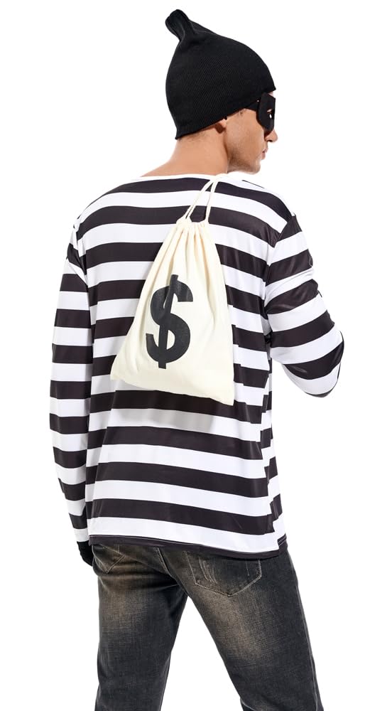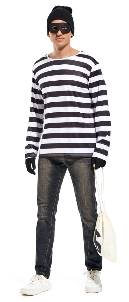 Description Men's Robber Costume Set Halloween Cosplay Costumes Thief Accessories Black and White Striped T-shirt, Mask, Gloves, Bag, Beanie Cap