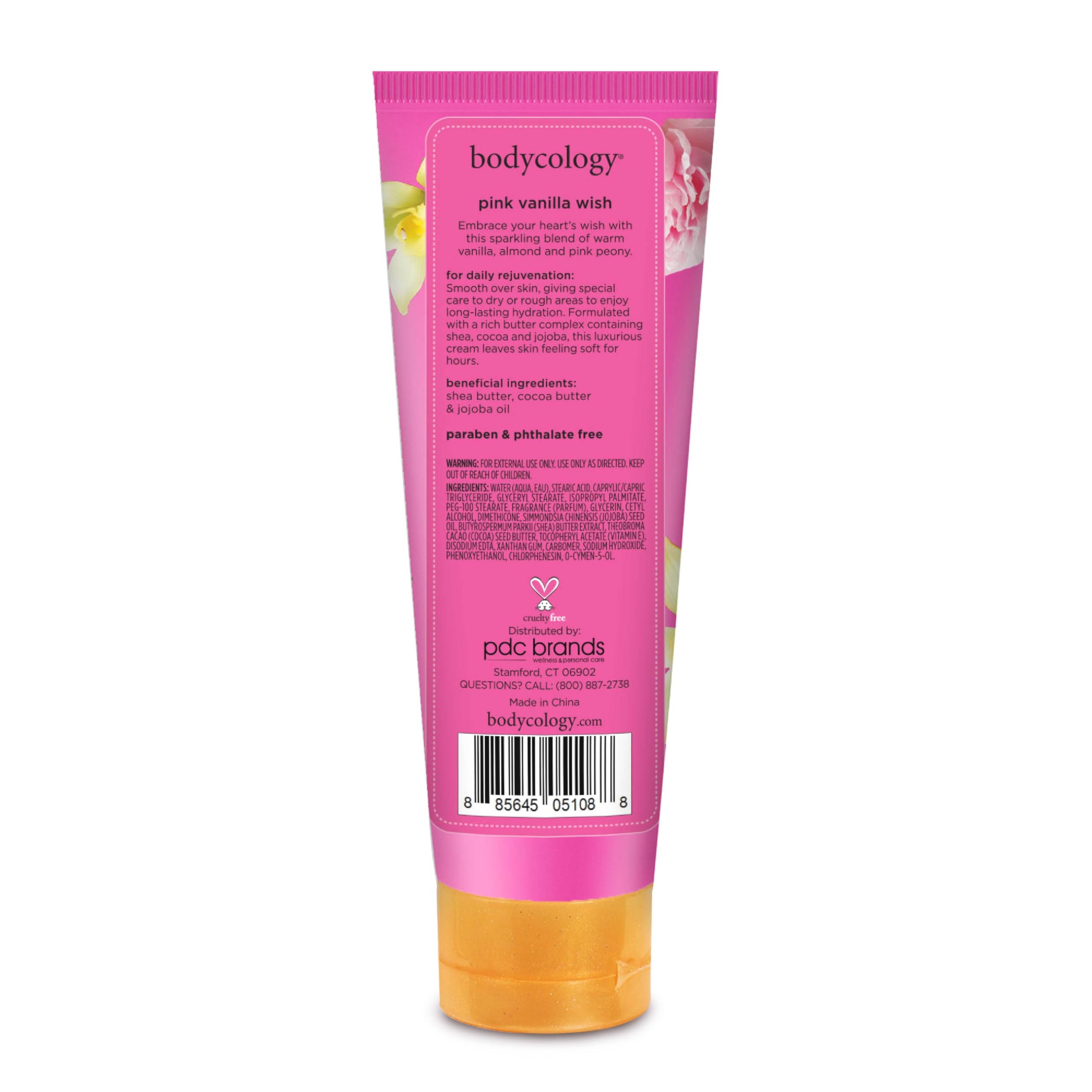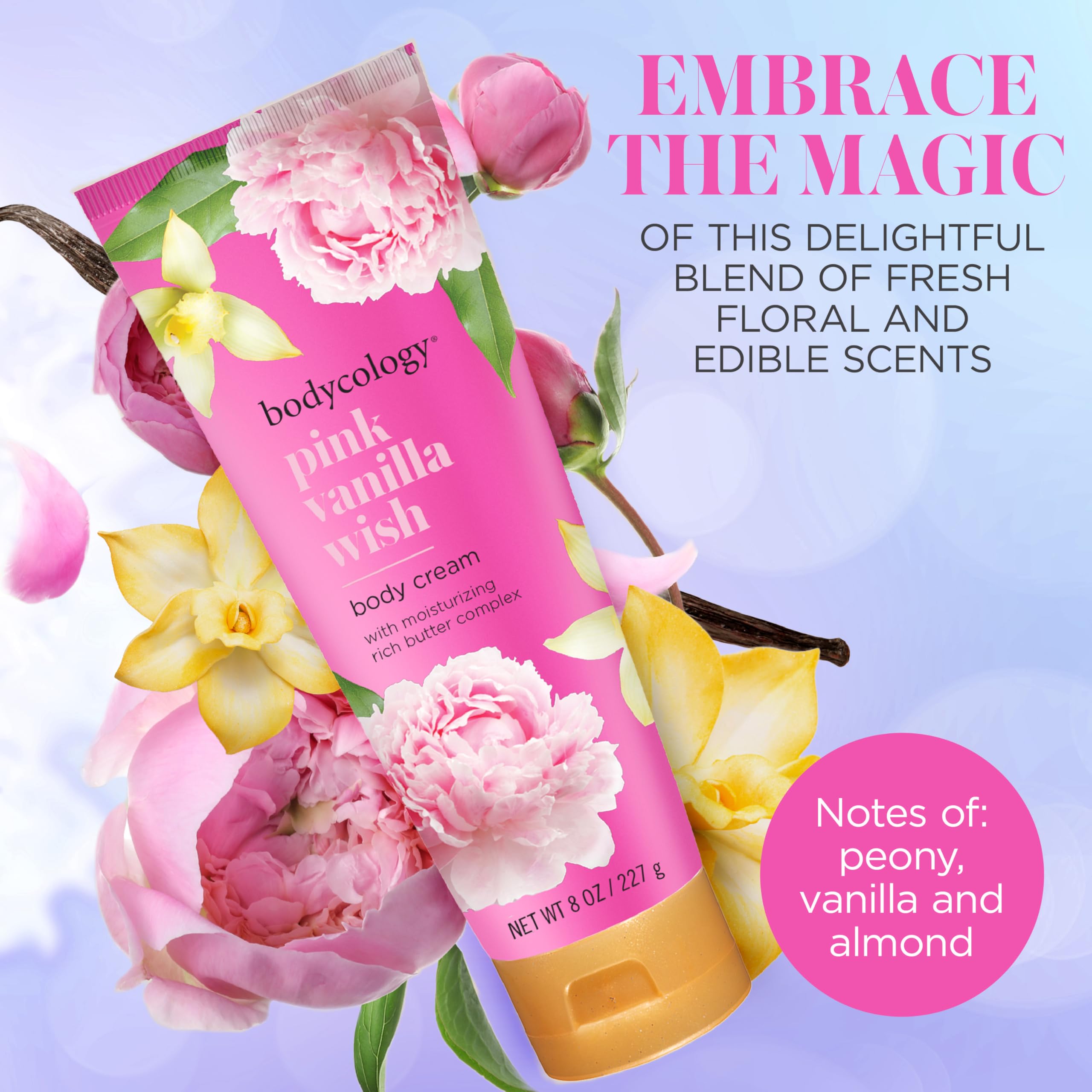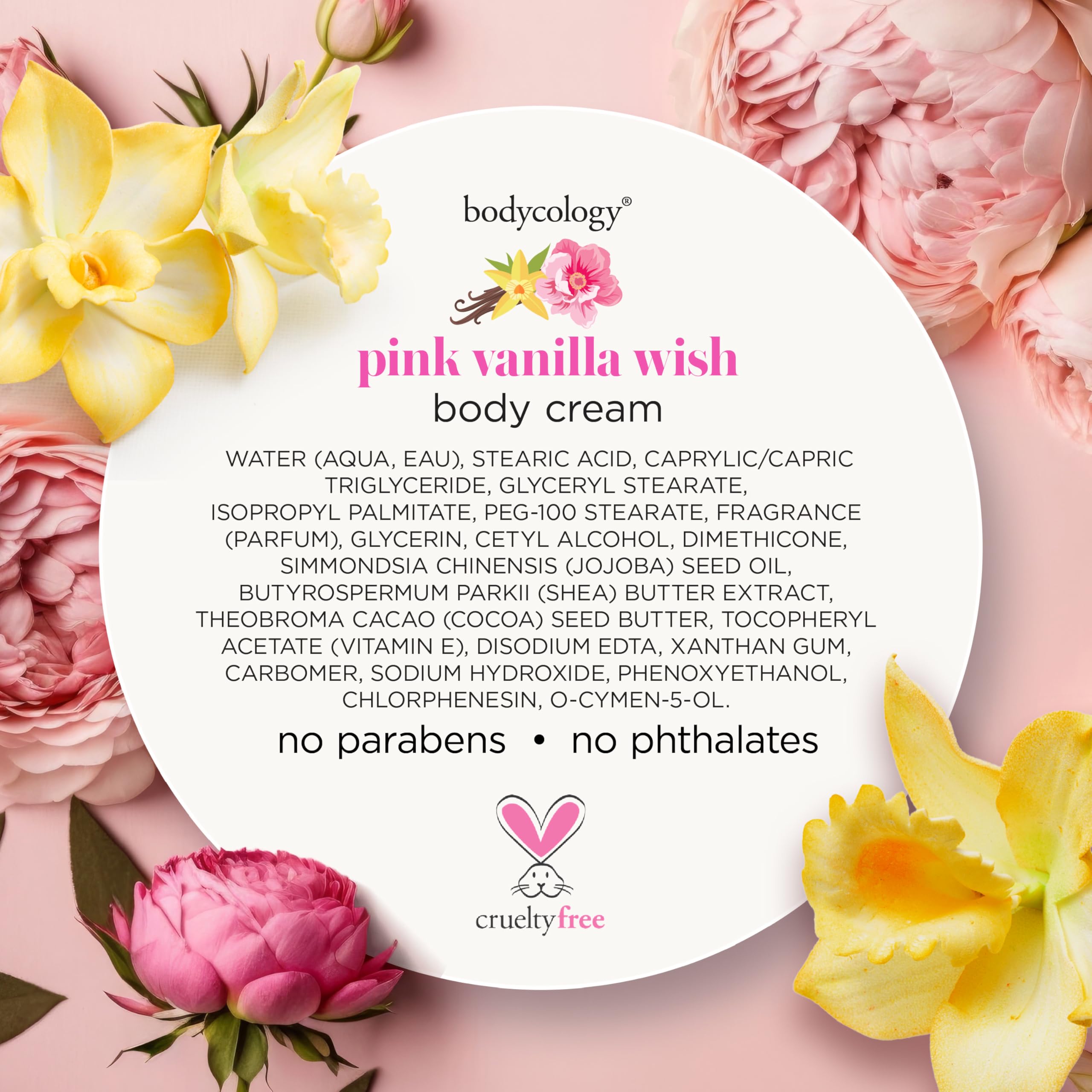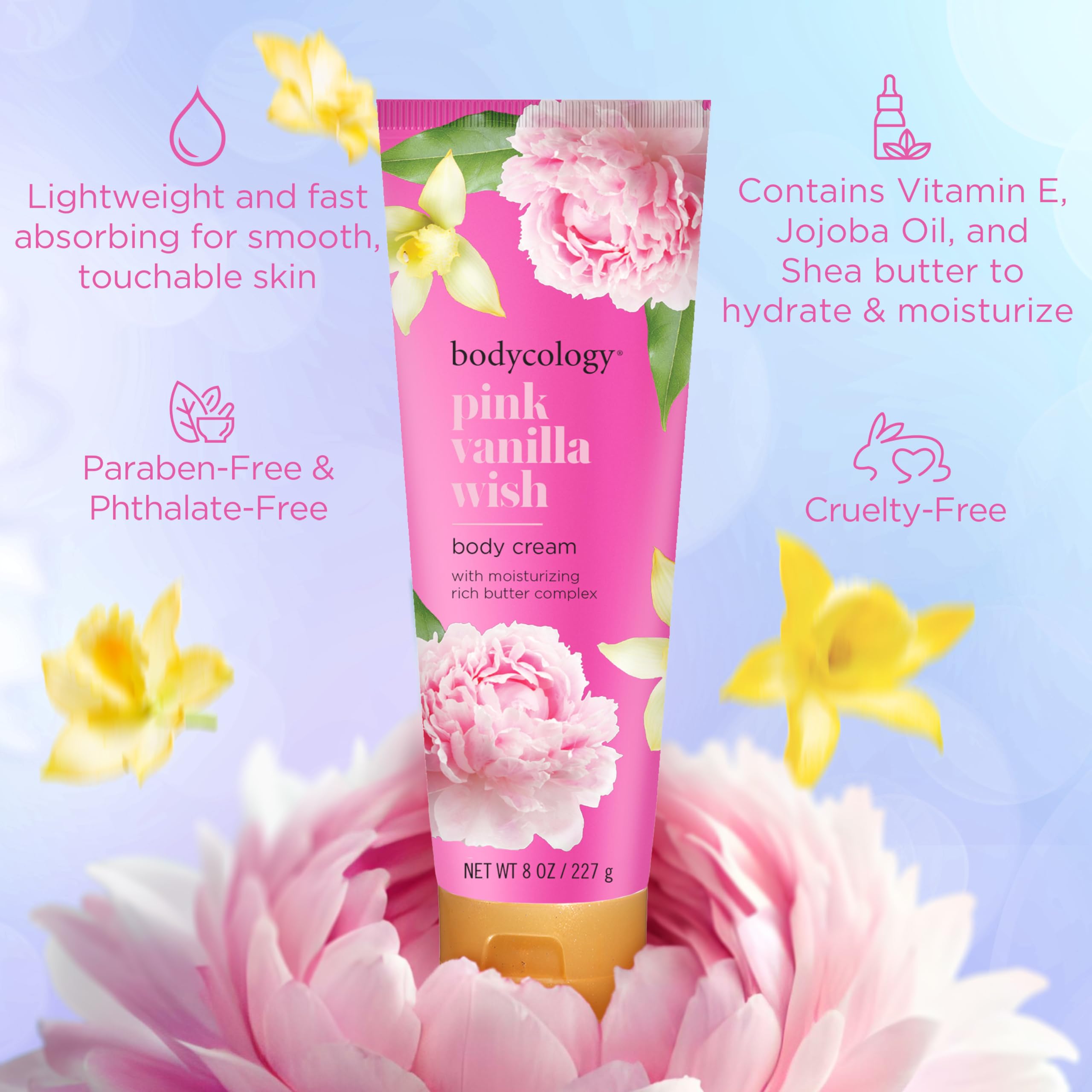 Say bye to dry and take your get-ready routine to the next level when you moisturize with Bodycology Pink Vanilla Wish Body Cream. Your skin will thank you for using our ultra-hydrating and non-greasy formula of shea butter, cocoa butter, and jojoba oil. When you lather your skin in our Pink Vanilla Wish Cream, you’ll surround yourself in a bouquet of pink peonies, with base notes of warm vanilla, and almond to round it out. Use this fragranced cream as a form of special self-care or make it a part of your daily beauty ritual. You can layer this scent with the Bodycology beauty products you love like the matching Pink Vanilla Wish Fragrance Mist or with our other body sprays to create your own signature scent. All Bodycology products are paraben, phthalate, and cruelty-free.