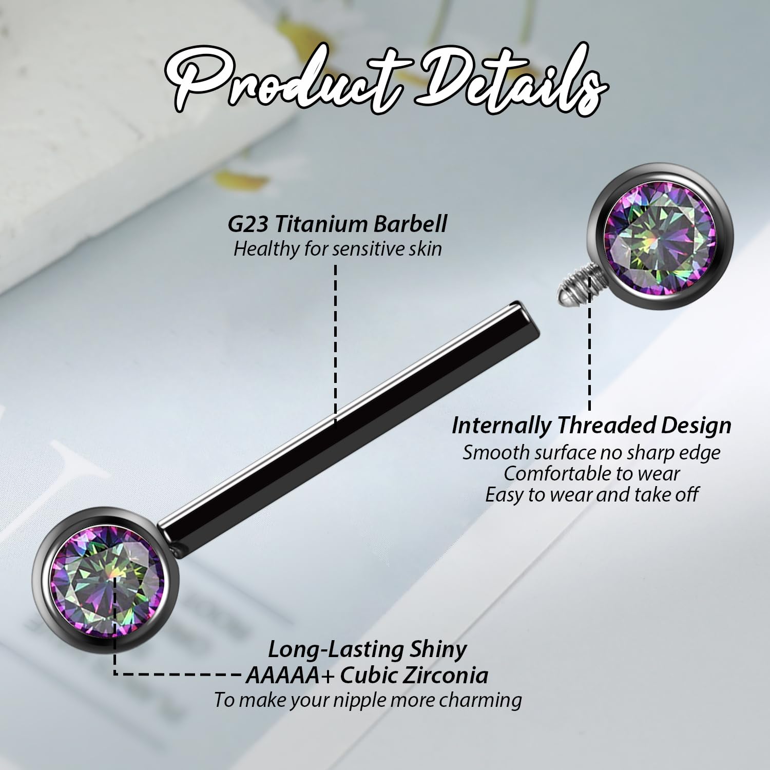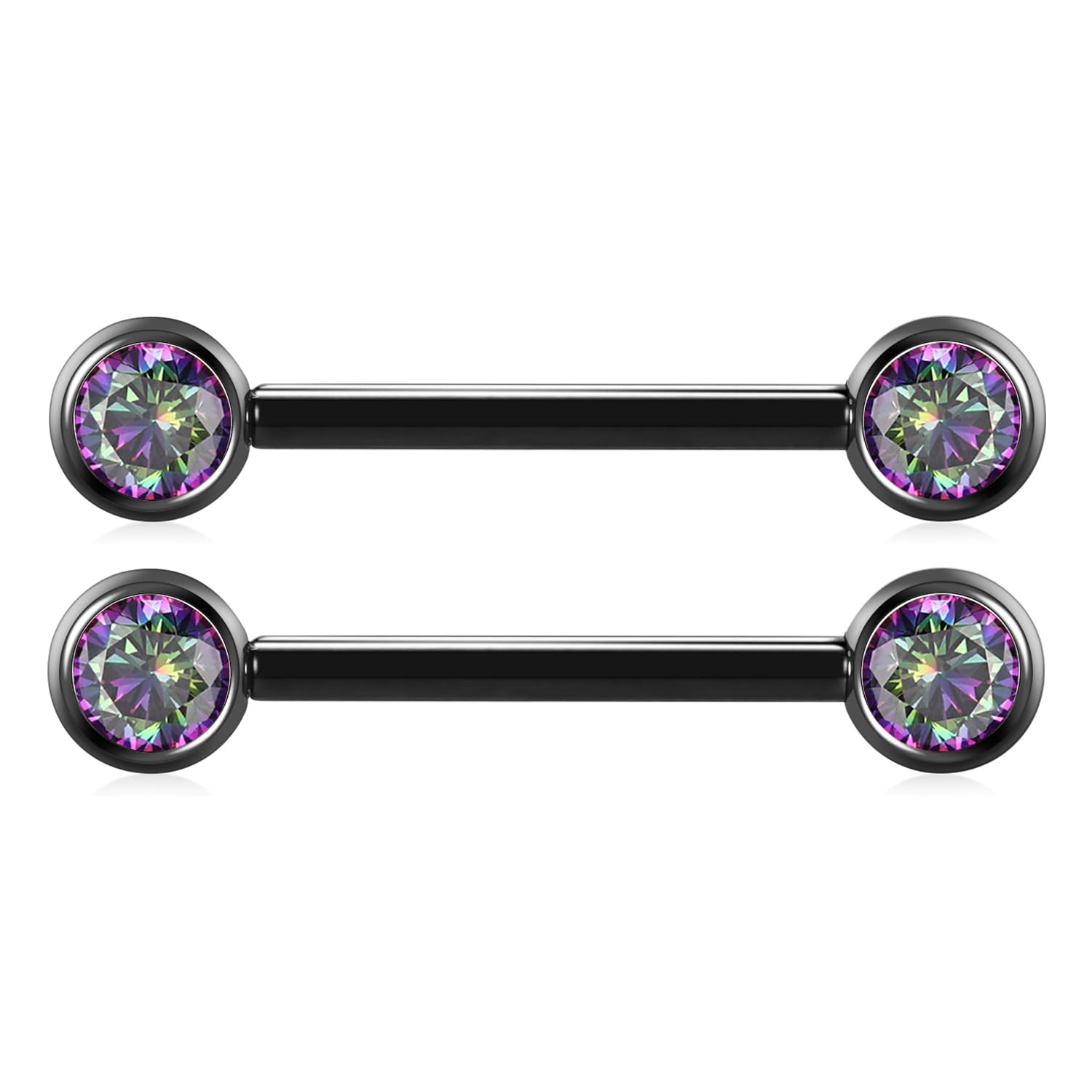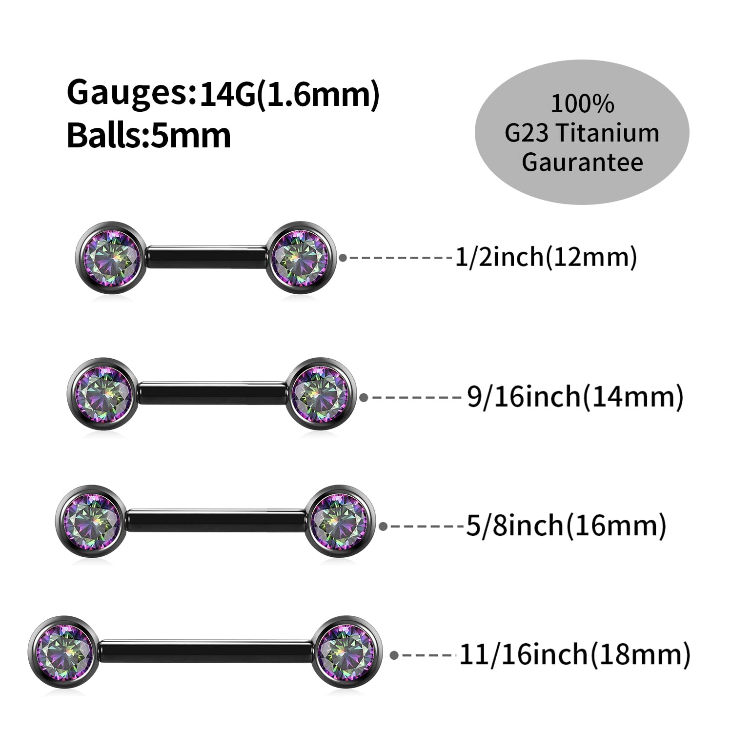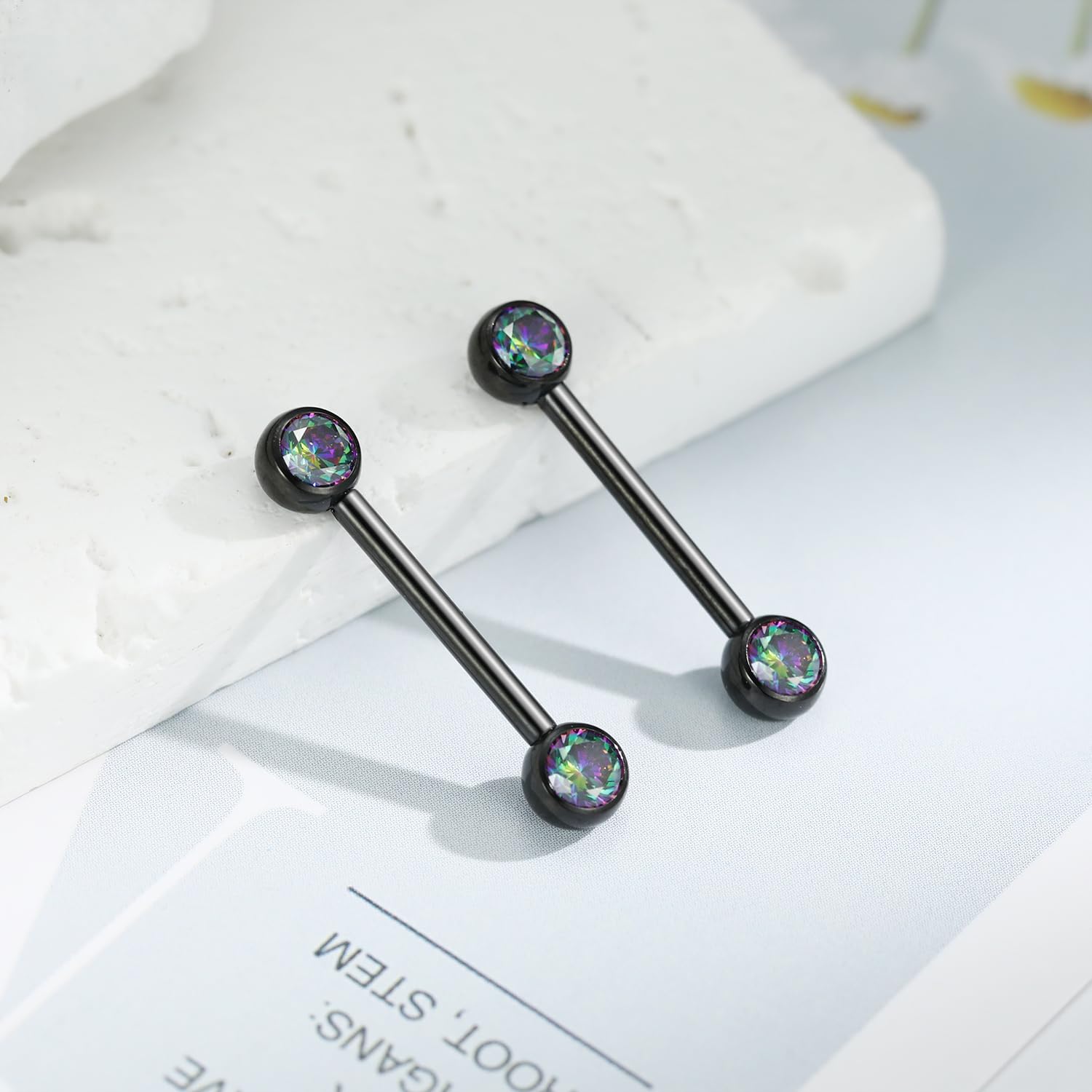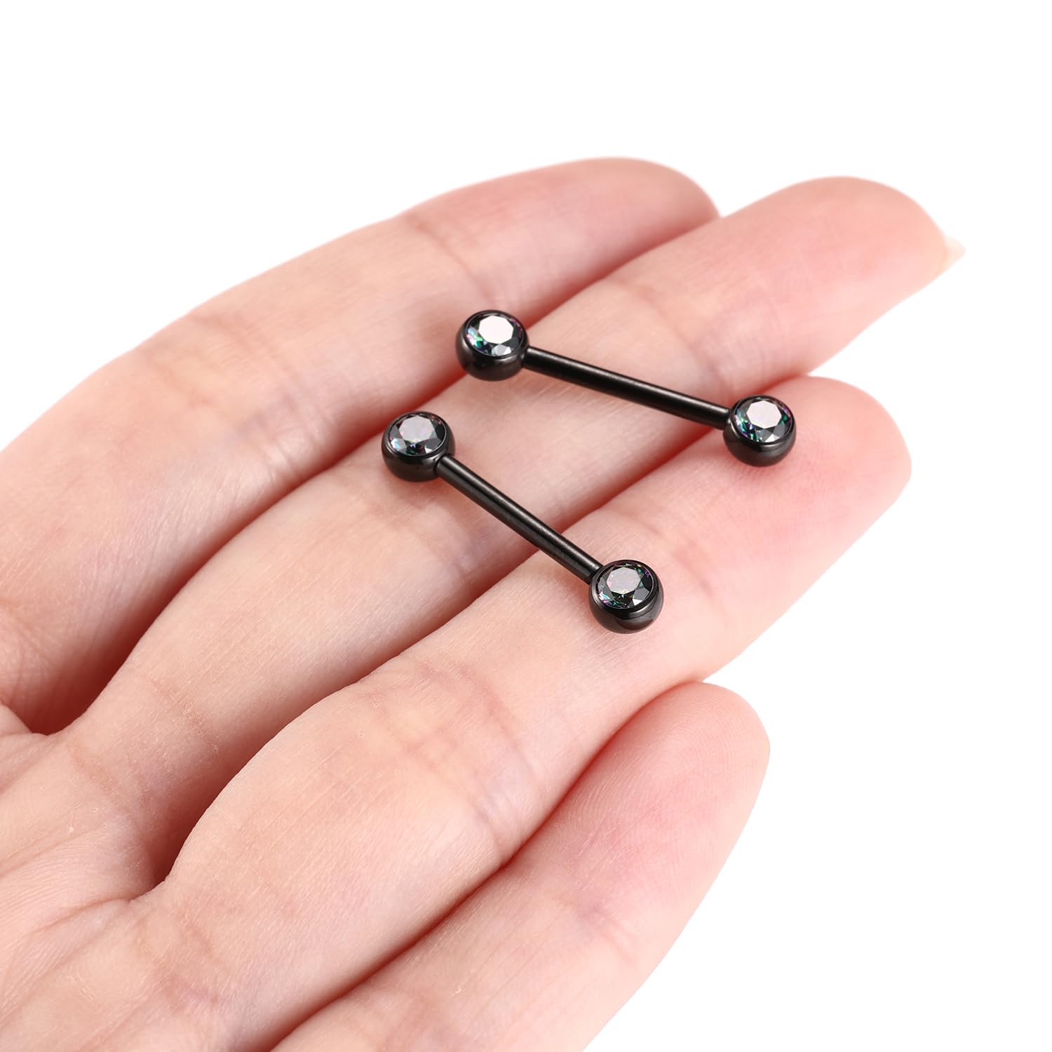 Size and Color: Gauge: 14 G (1.6 mm); Nipple Barbell Length: 1/2"(12 mm); CZ Size: 5 mm. Color:Black with ABCZ.1 pair nipple ring per order