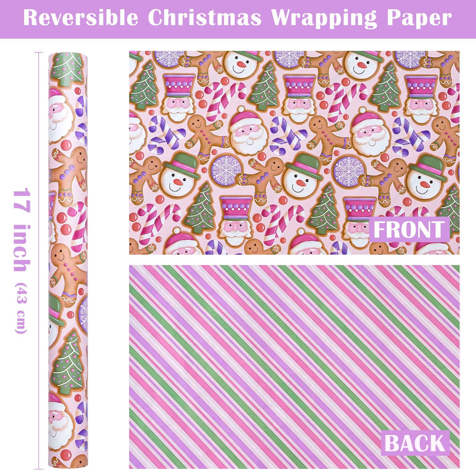 Reversible: Santa faced cookies, gingerbread men, snowmen, candy canes, and Christmas trees printed on one side; pink purple green diagonal stripes printed on the reverse. Two different designs make unique and varied gift presentations easy.