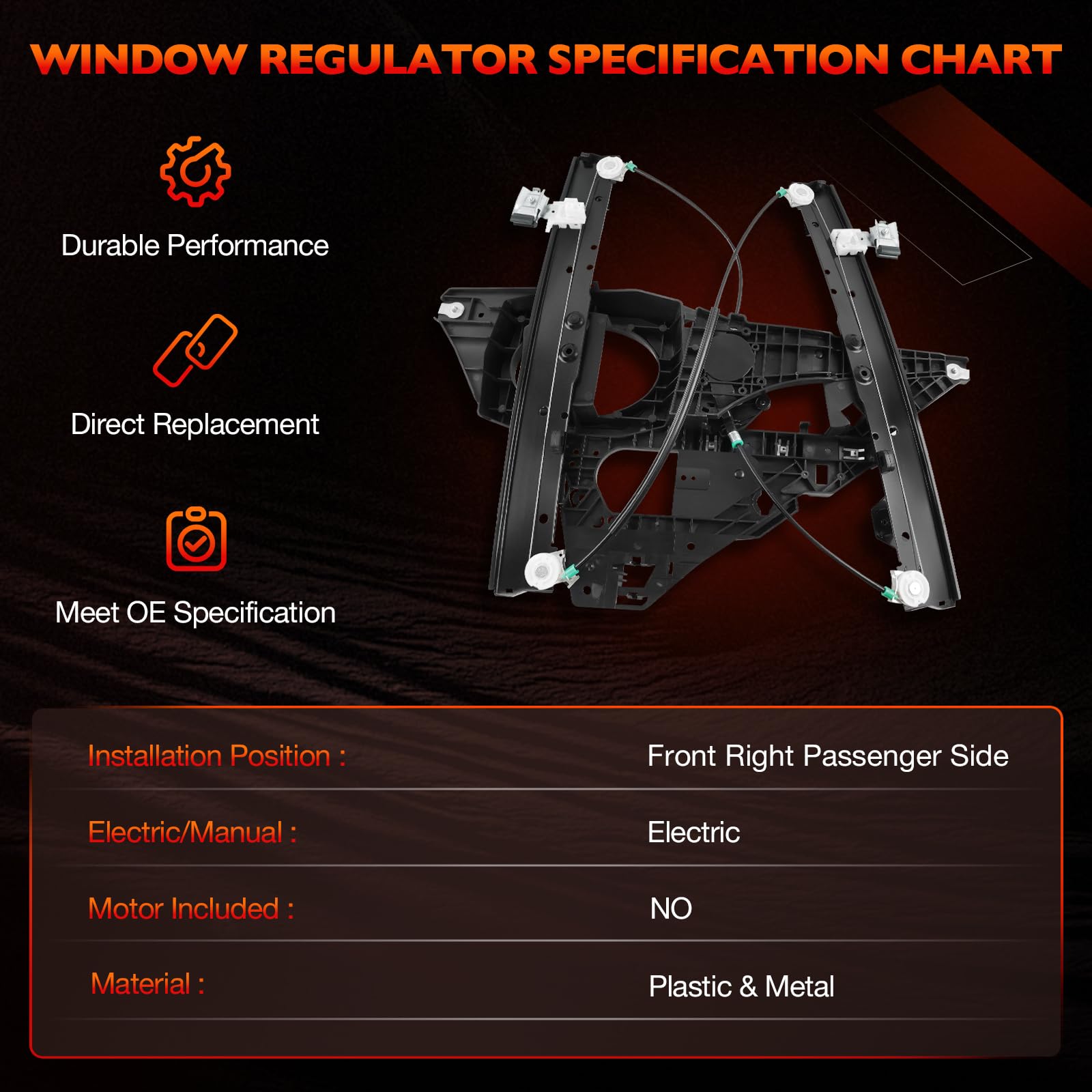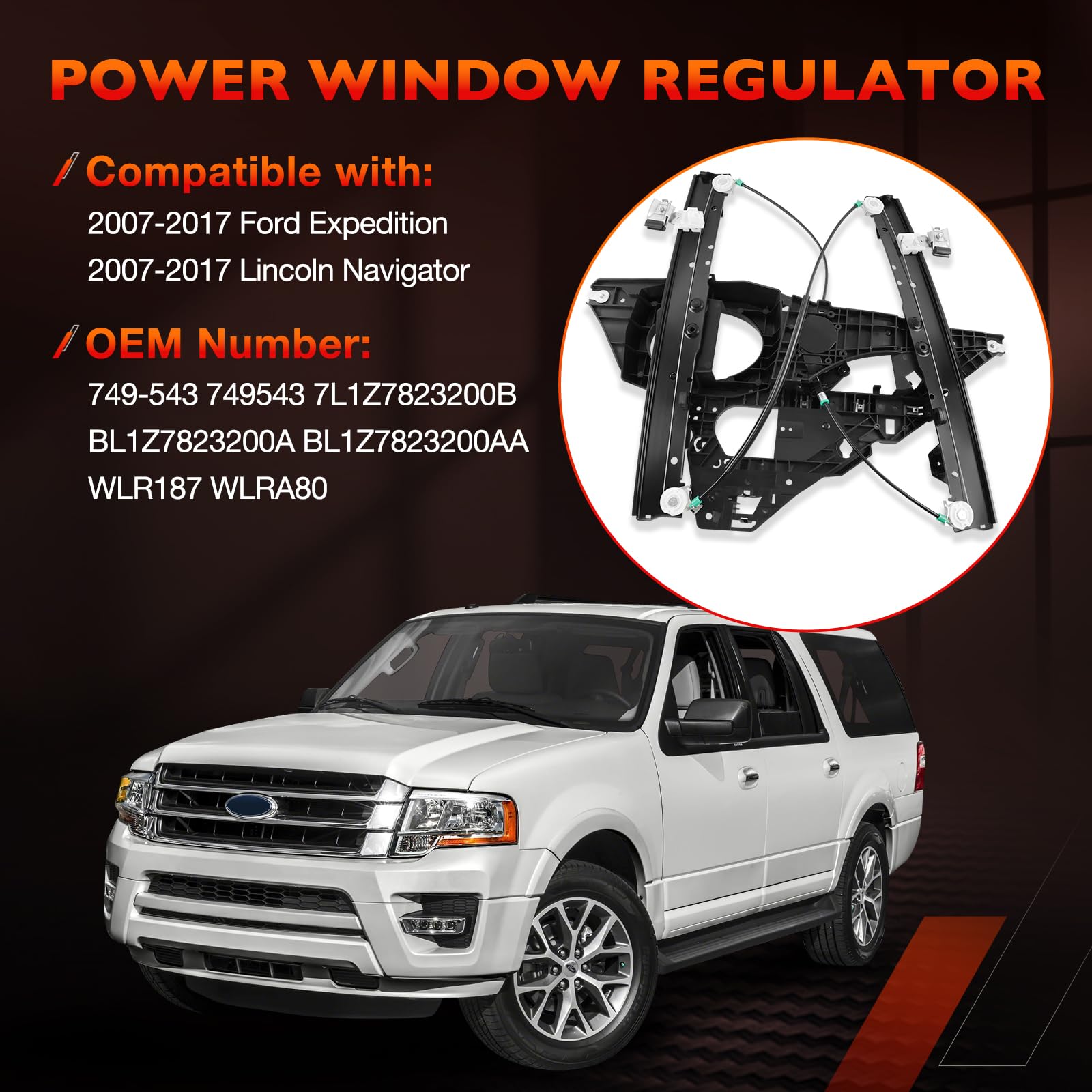 Why Choose Us Dealing with a stuck, noisy, or dropping window on the passenger side? Our power window regulator assembly is the reliable solution. Designed as a direct window regulator replacement, it restores smooth window operation, enhances durability, and helps you avoid expensive repair shop costs. With accurate fitment and premium construction, this front right passenger side window regulator with panel without motor brings back dependable performance. Key Features & Advantages Restore Smooth Window Operation: This electric window regulator with panel is engineered to fix common window issues such as slow response, glass not moving, or windows falling unexpectedly. Installing our front passenger window regulator ensures factory-like function and reliable everyday use. Quiet & Stable Performance: Our passenger side window regulator assembly without motor keeps the glass securely in place while eliminating rattling, grinding, and shaking. The design ensures your right side power window regulator operates smoothly and quietly. Durable Construction: Made from high-strength steel and quality components, this window regulator with metal panel offers enhanced durability and resistance to wear. Built for repeated daily use, it delivers long-lasting reliability for your vehicle. Compatible Vehicle Applications Compatible with Ford Expedition 2007–2017 Sport Utility Compatible with Lincoln Navigator 2007–2017 Sport Utility Replace OEM Part Numbers 749-543,7L1Z7823200B,BL1Z7823200A,BL1Z7823200AA. Quality Guarantee: 12-Month Warranty