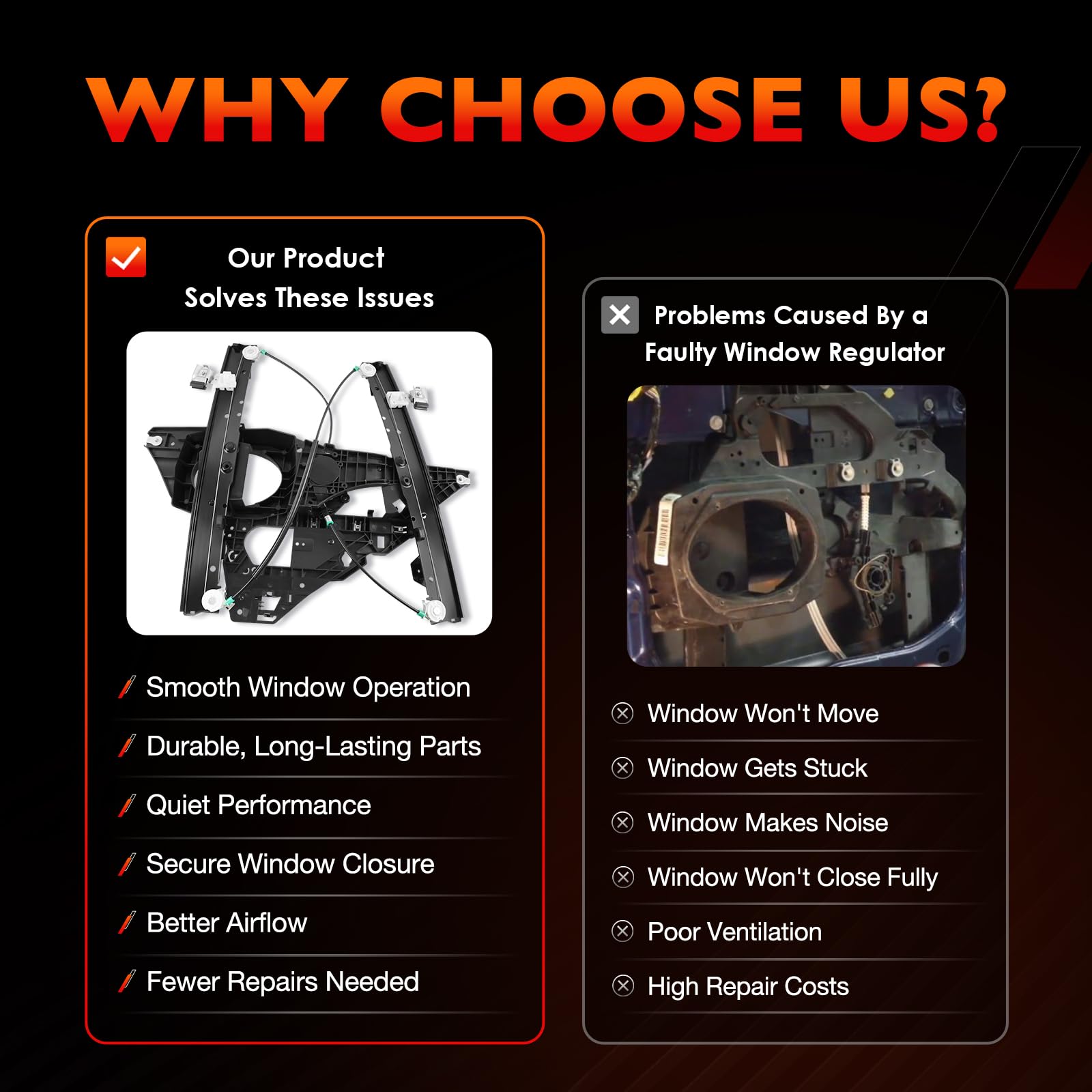2️⃣ Restore Smooth Window Operation – Our electric window regulator with panel restores factory performance, solving problems like stuck, slow, or uneven glass movement. The ideal window regulator replacement to bring back reliable operation.